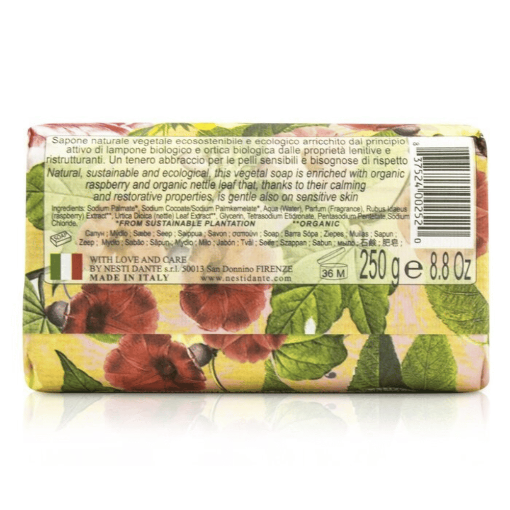The combination of organic raspberries, rich in vitamins and minerals, and organic nettle which is rich in vitamin C and iron. The Nesti Dante Bio Natura soap is gentle to the skin soothing.