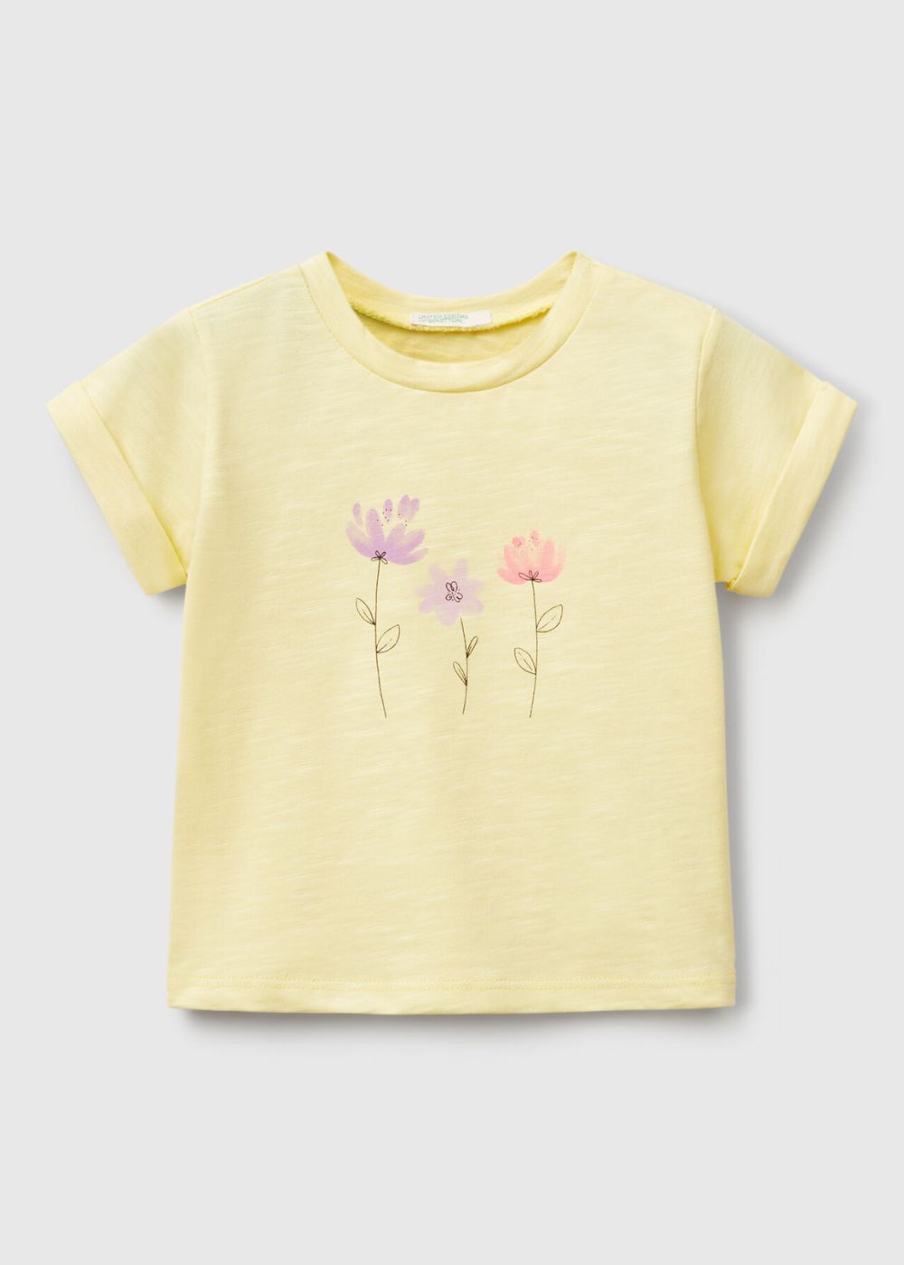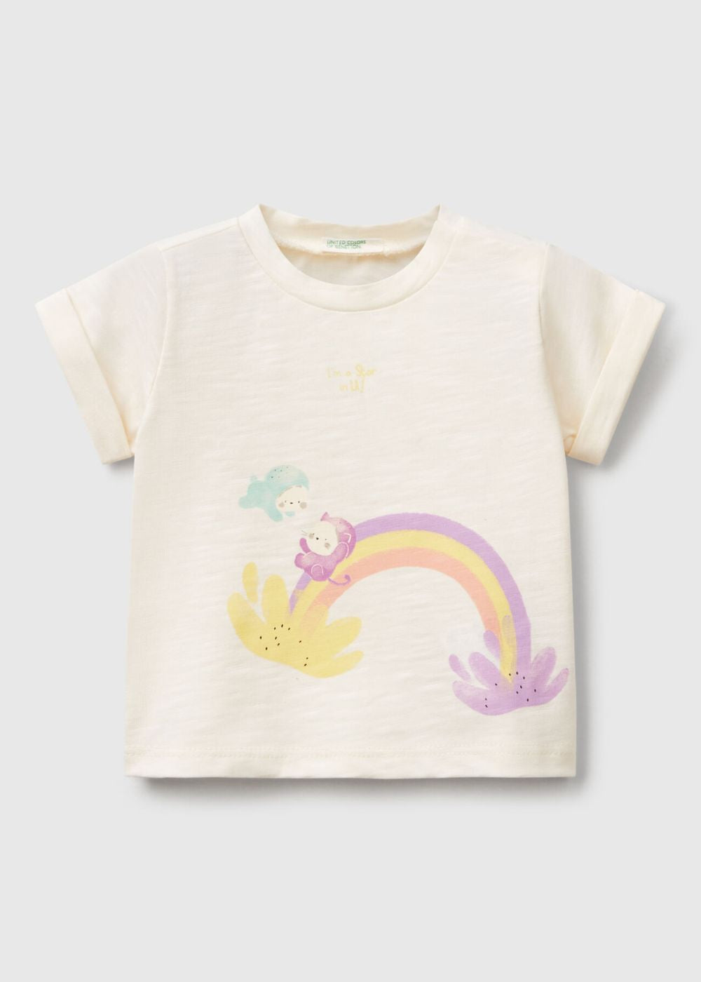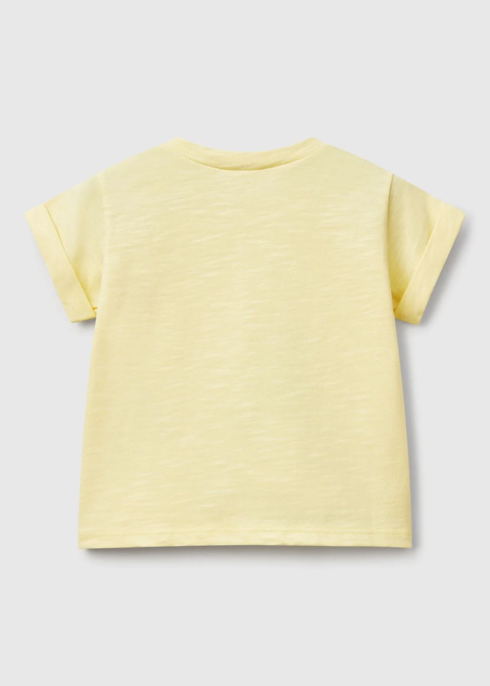 Short-sleeved crew-neck t-shirt in pure cotton with a boxy fit. Practical hidden opening with press studs on the left shoulder. Nice print on the front, for a comfortable and colorful garment.