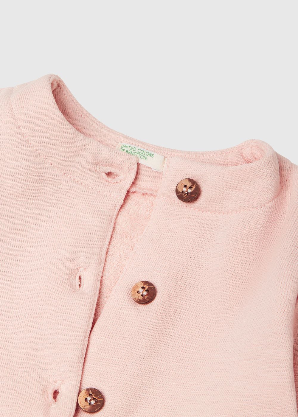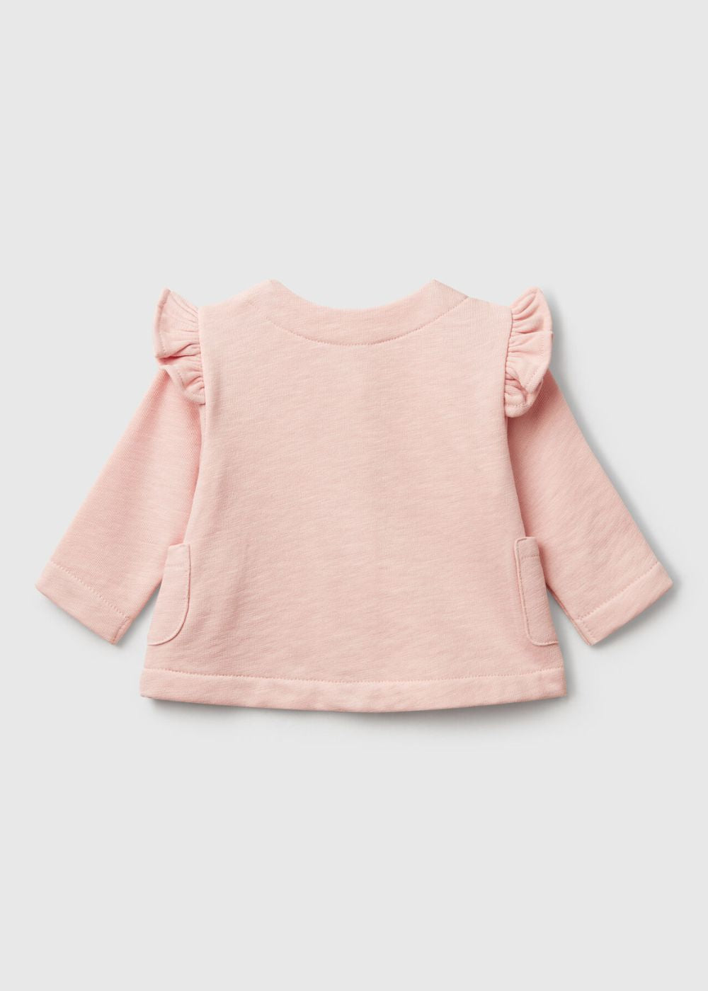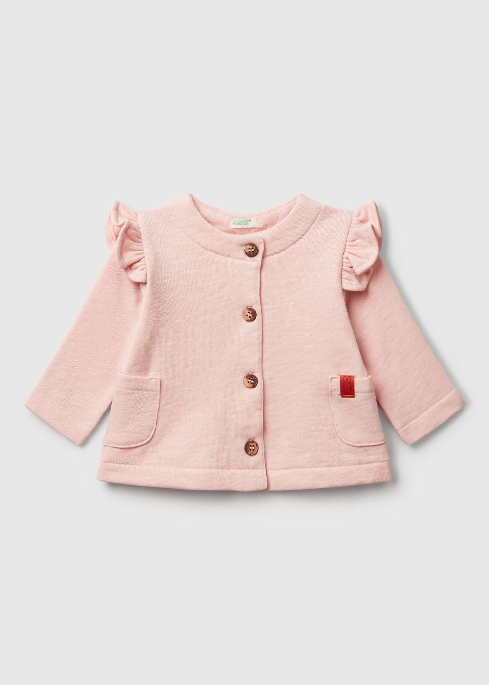 Sweatshirt in soft terry cloth cotton blend. Round neck, front opening with buttons and rounded pockets at sides. Long sleeves with ruffles applied on the armhole. Refined, feminine and comfortable.
