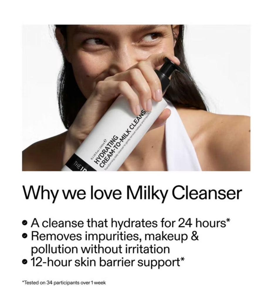 Cleanse: Apply a raspberry-sized amount of Hydrating Cream-to-Milk Cleanser to dry skin. Add warm water to emulsify into a light milk, then rinse thoroughly.