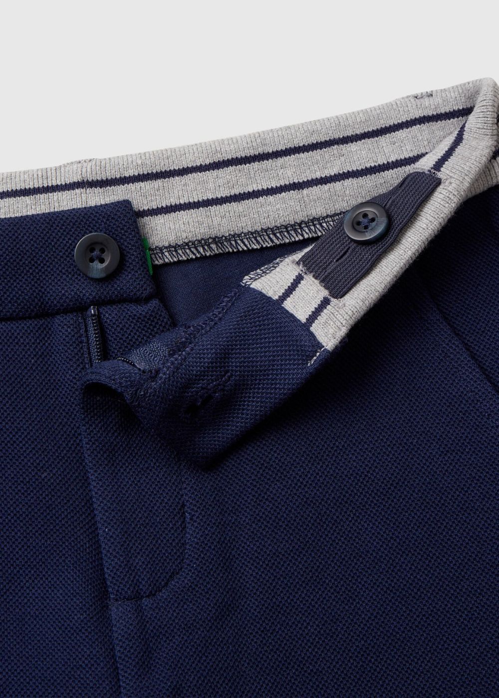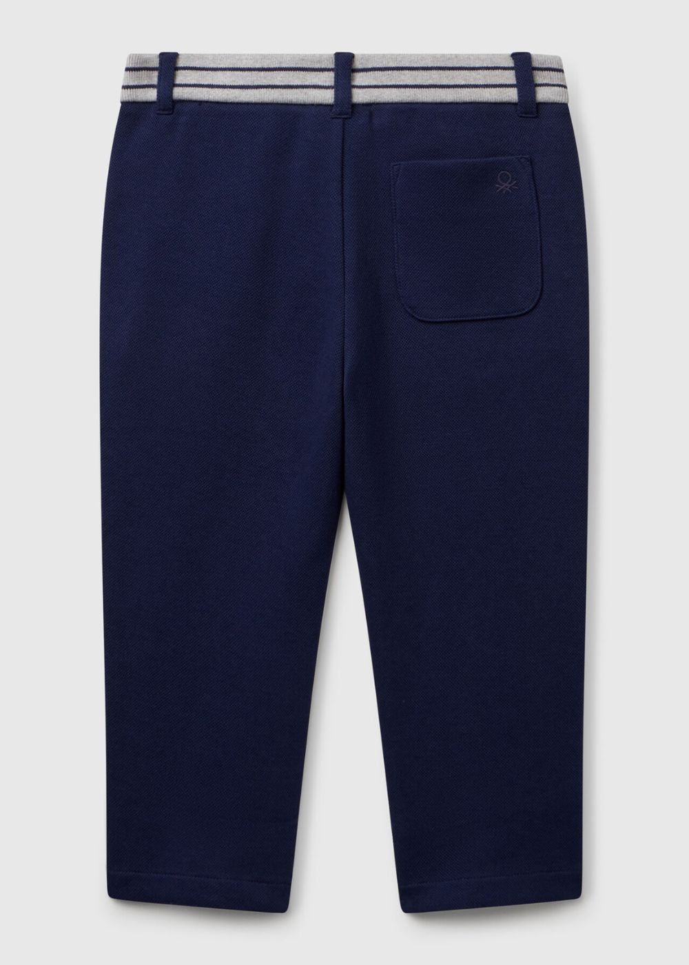 Long trousers in pure cotton pique. Striped elasticated waist, zip and button opening. Front pockets and patch pocket on the back. Practical internal adjustable elastic waist. Perfect with a shirt, for ceremonies and special occasions.