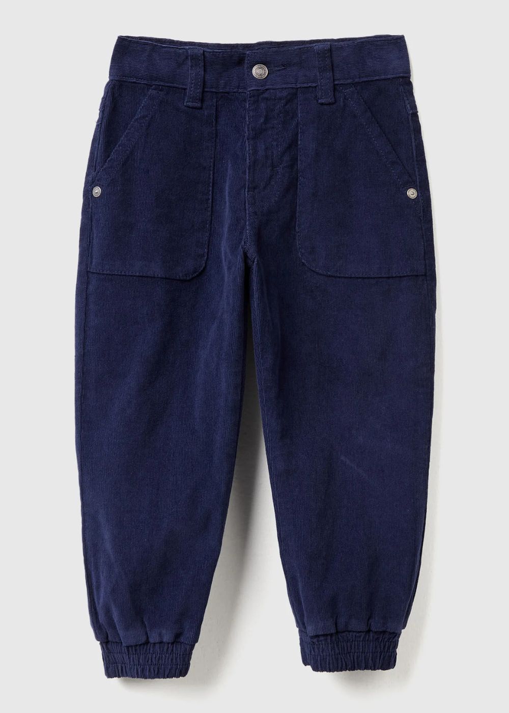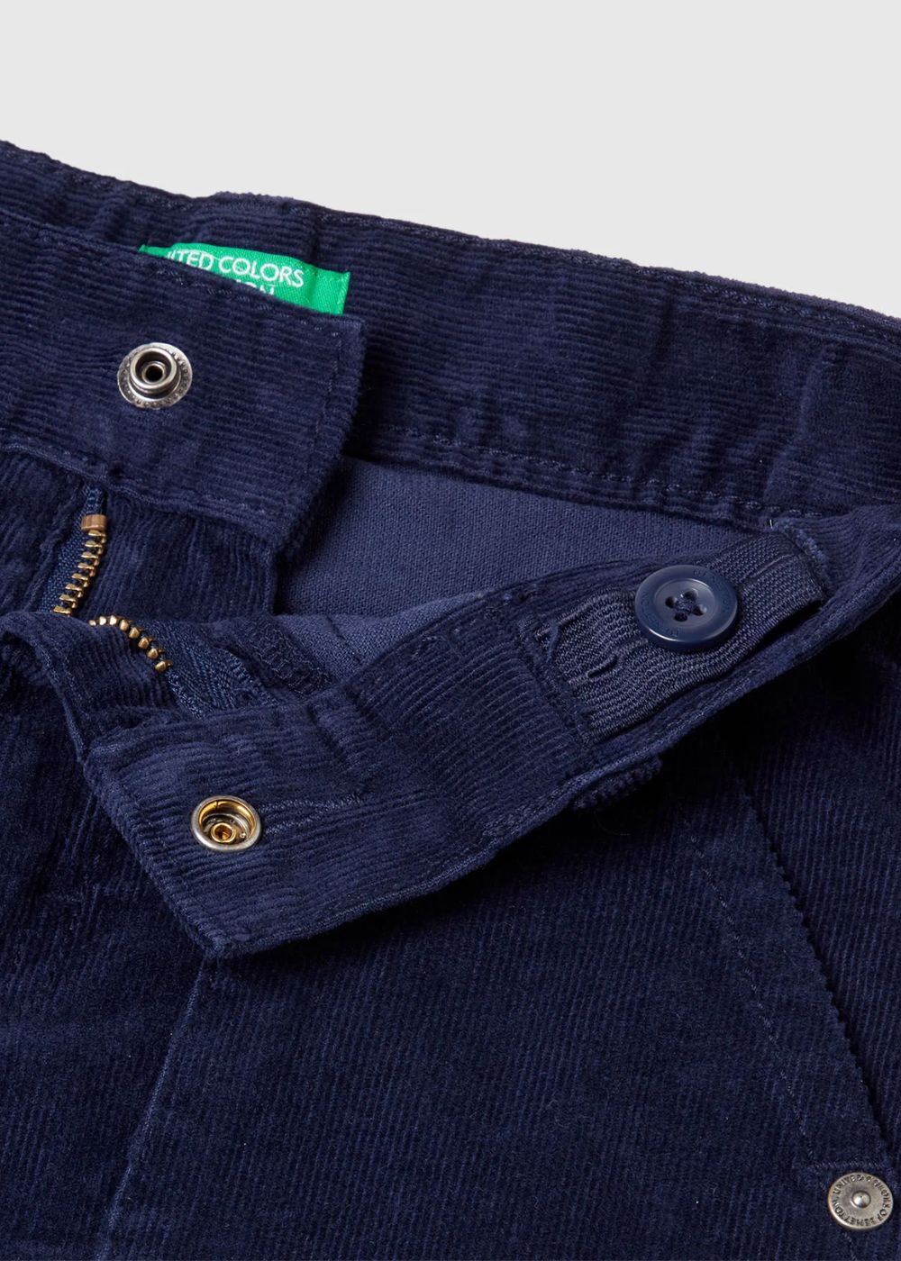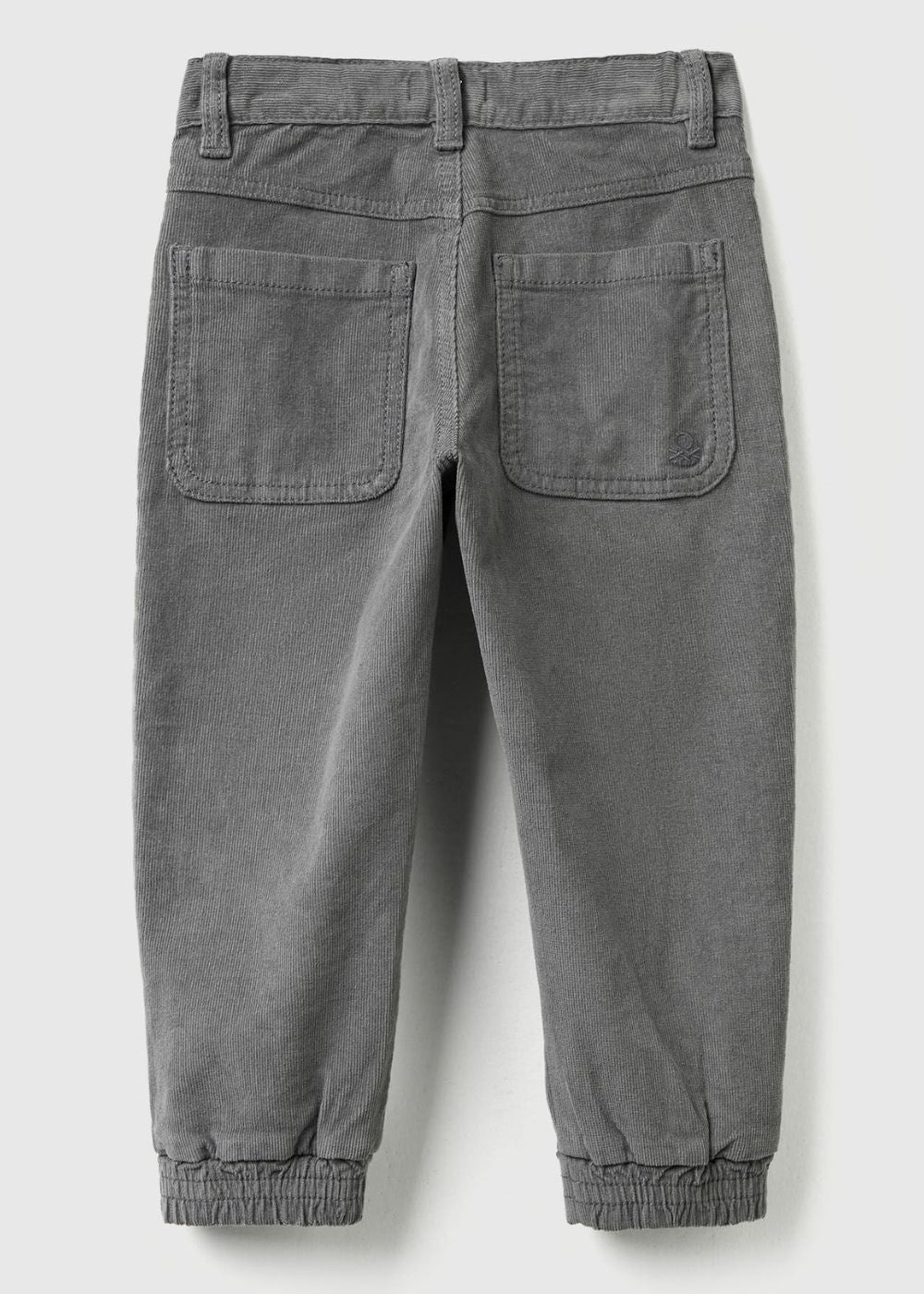 Long trousers in ribbed stretch cotton corduroy. Regular waist, zip and button opening, front pockets. Back with yoke and patch pockets, one of which has an embroidered logo. To pair with a check shirt for a stylish look.
