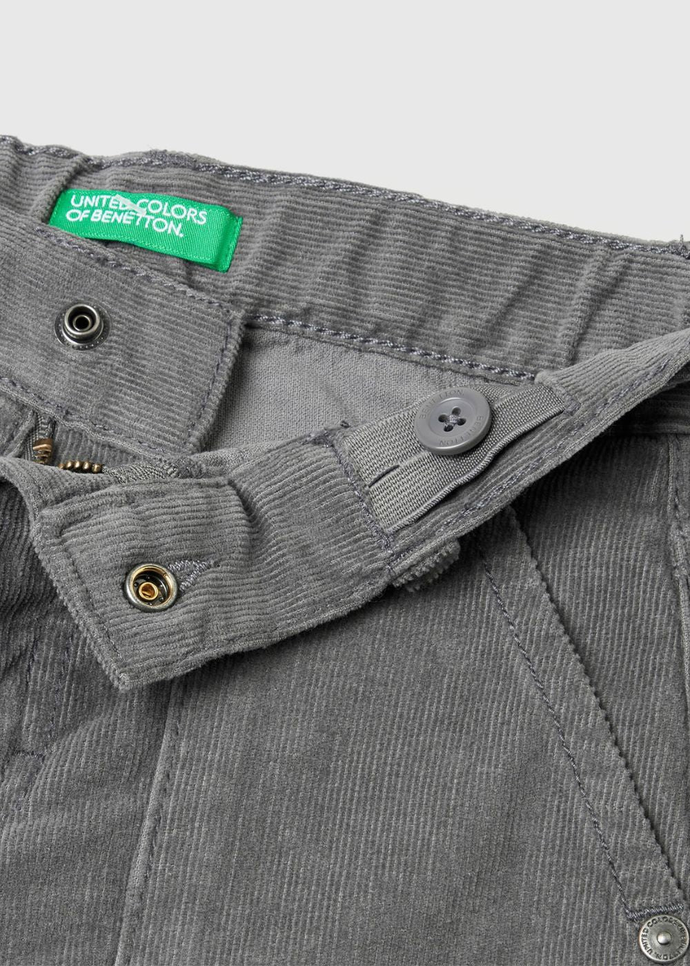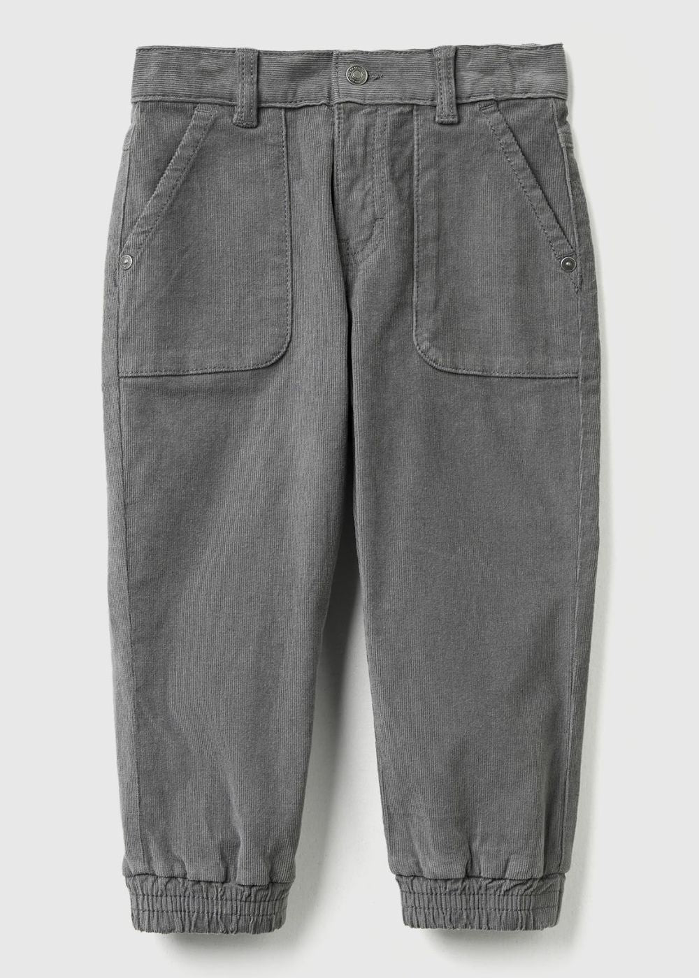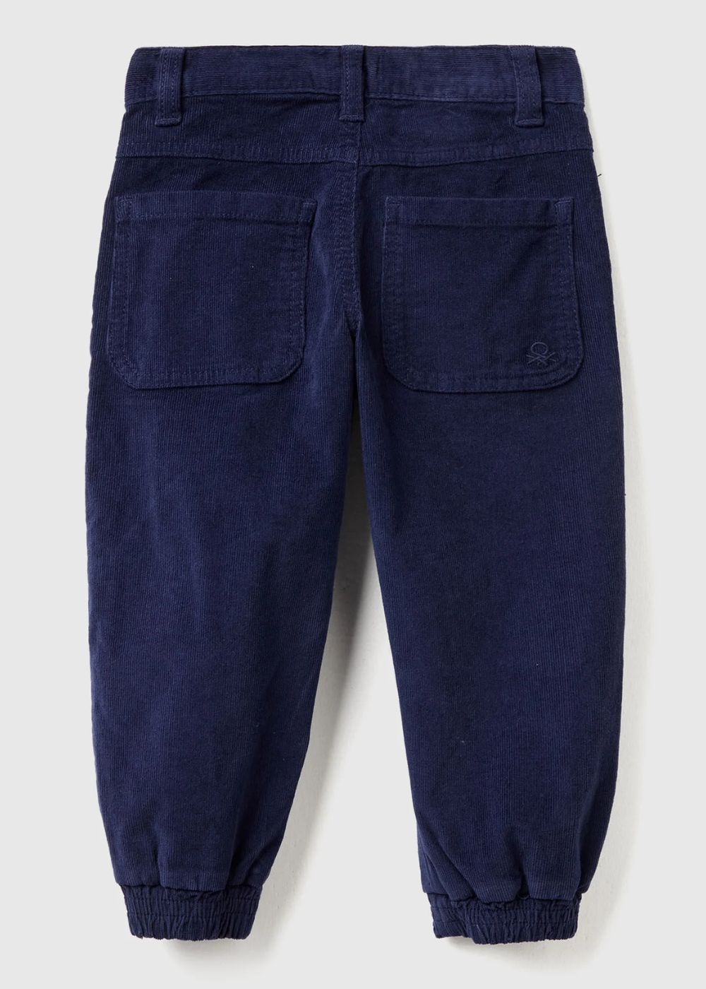 Long trousers in ribbed stretch cotton corduroy. Regular waist, zip and button opening, front pockets. Back with yoke and patch pockets, one of which has an embroidered logo. To pair with a check shirt for a stylish look.
