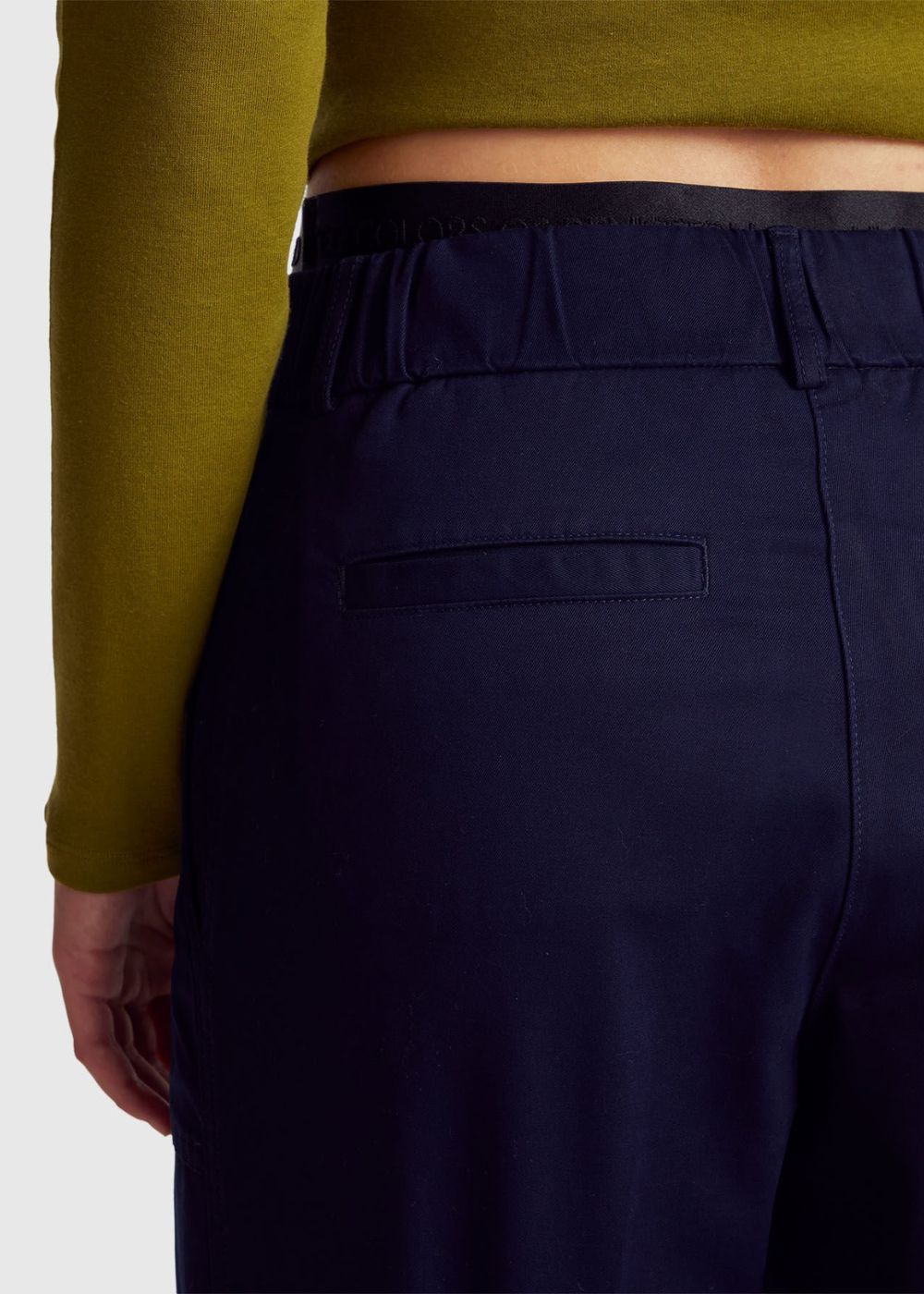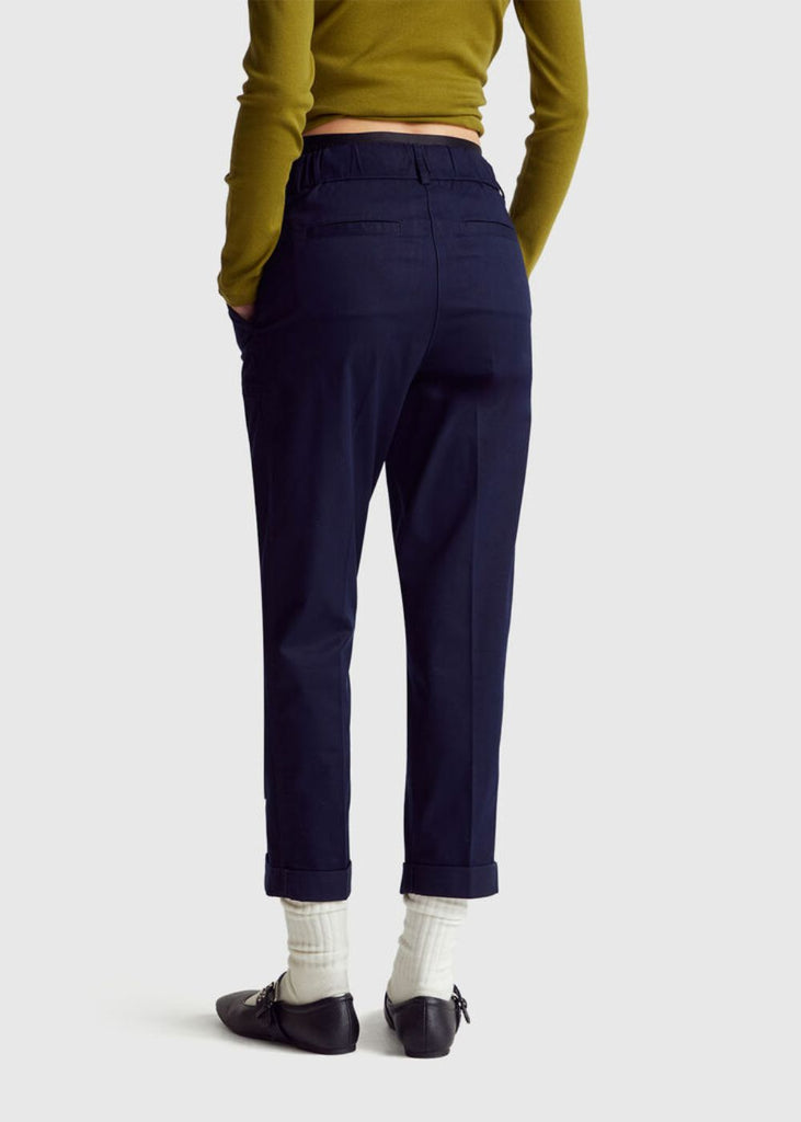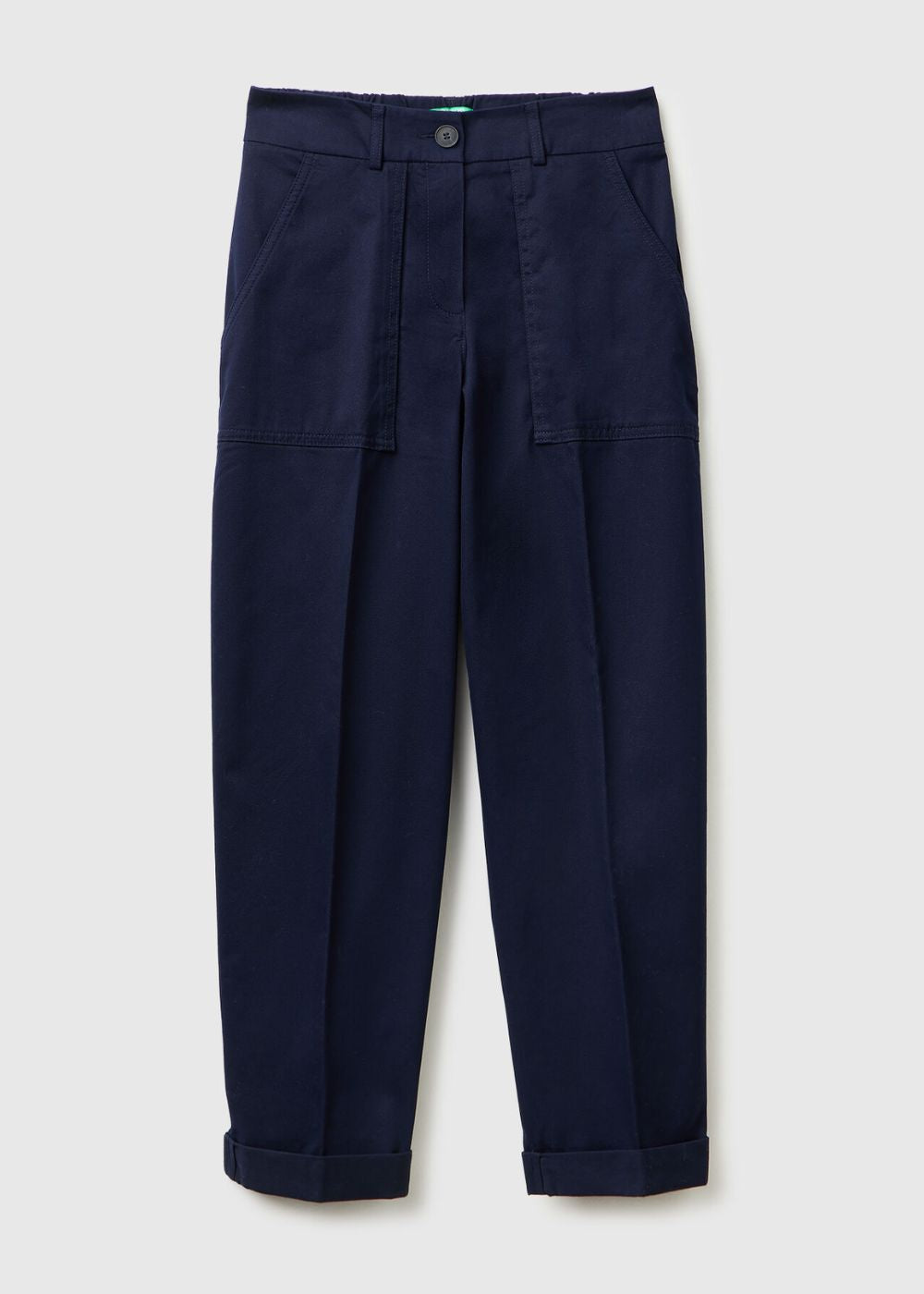 Long trousers in stretch soft cotton. Straight leg with ironed crease and high turn-up at bottom. Waist with inner elastic on the back, front zip and button opening. Patch pockets on the front and welt pockets on the back. Minimal and refined, they're great for multiple different types of occasions.