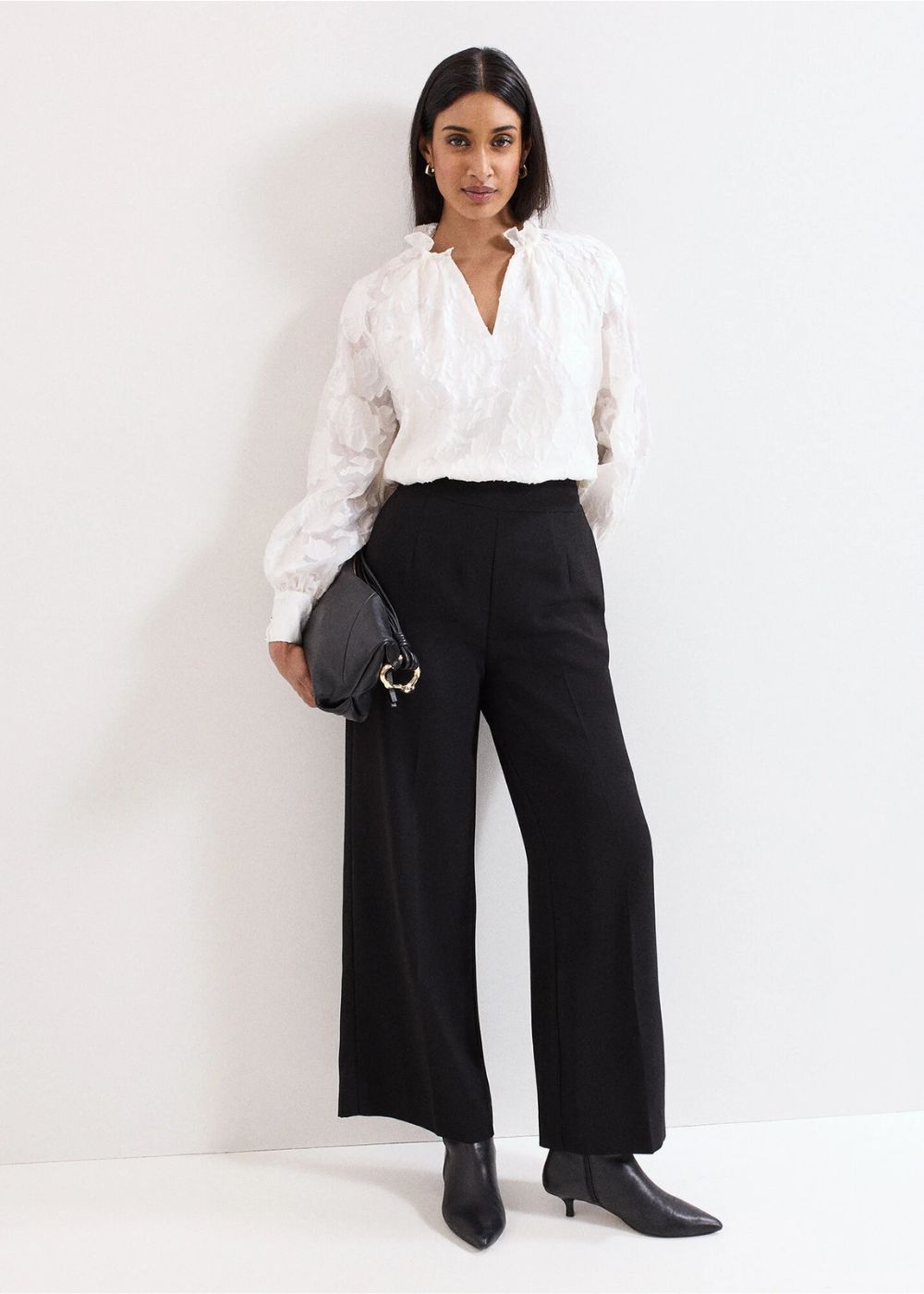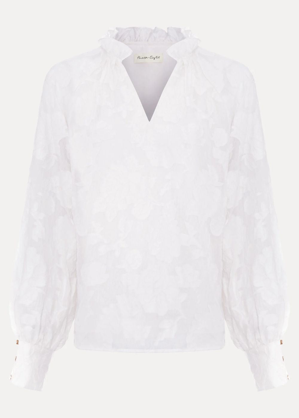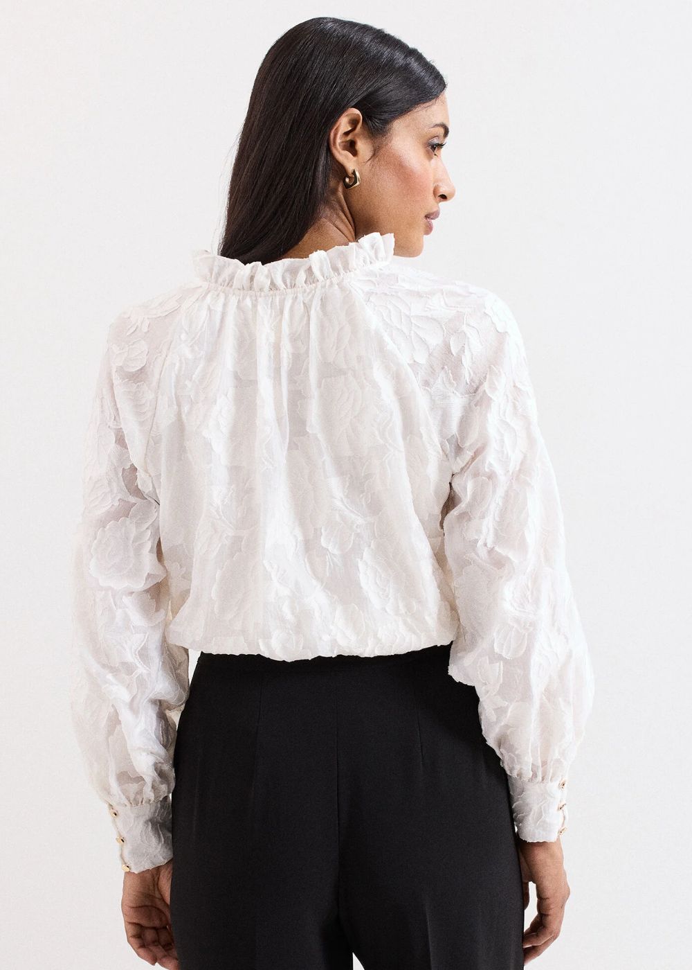 A true wardrobe icon, we’ve given the white blouse a floral update this season. Featuring a romantic ruffle V neckline, subtle balloon sleeves and refined gold button detailing to the cuff. With intricate floral accents, it’s the epitome of modern femininity. A style that transcends the seasons, this blouse will become your new go-to.
