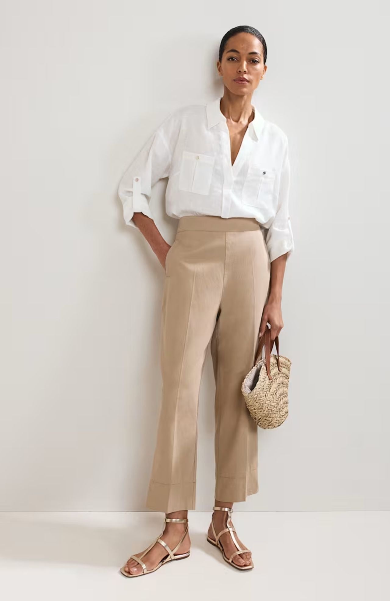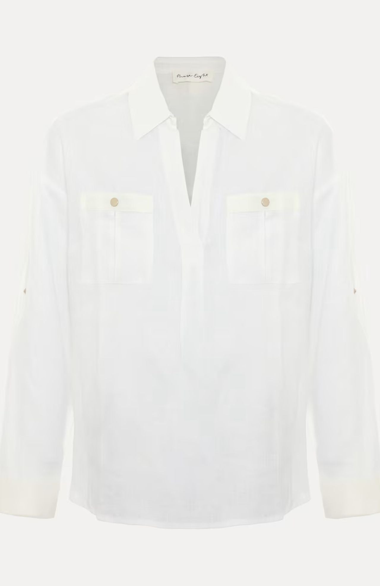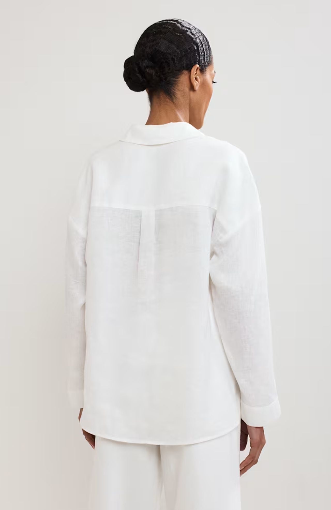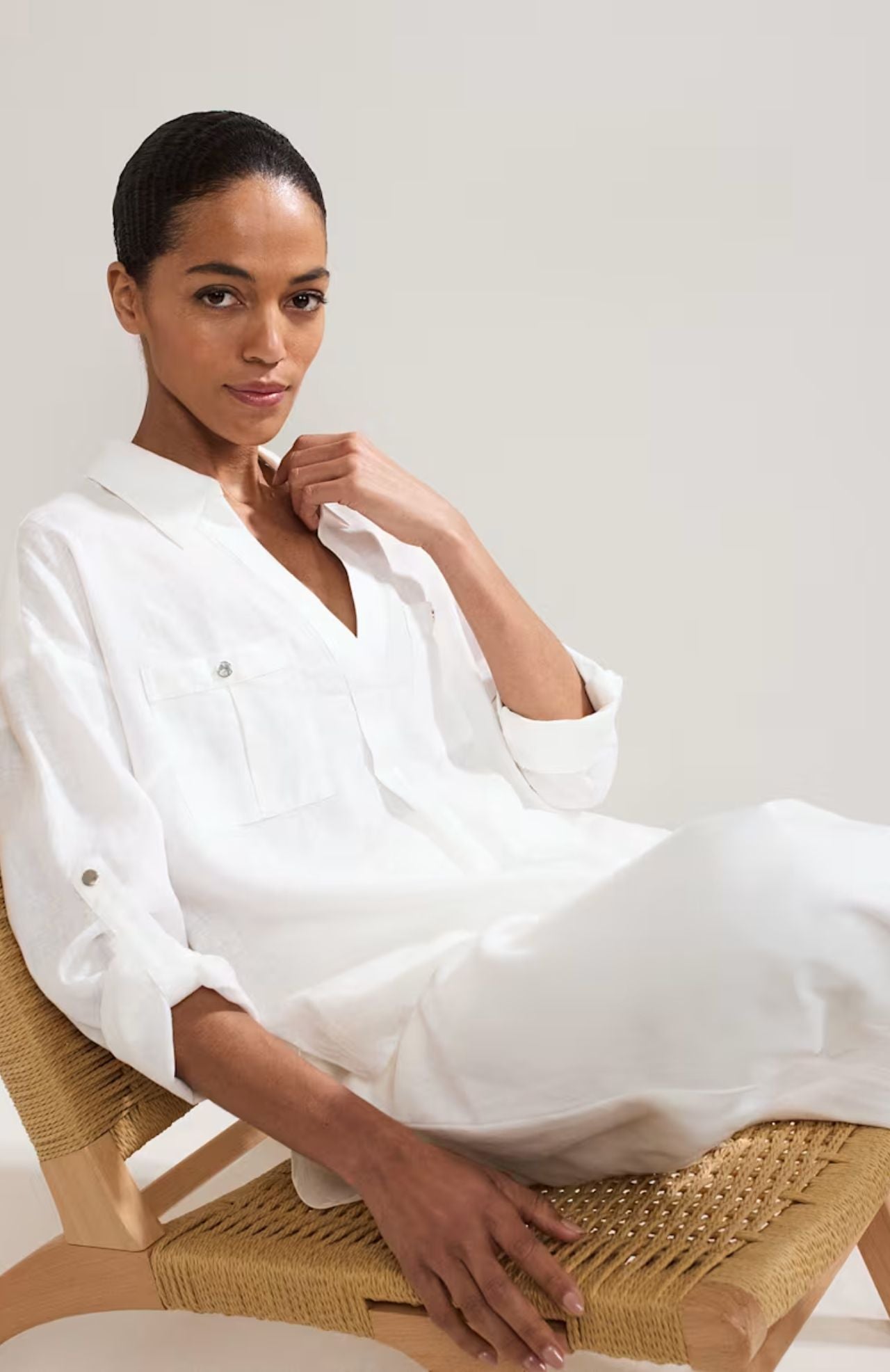 This effortless linen shirt will become a staple in your wardrobe. The classic shirt silhouette is updated with patch pockets and button detailing on the arms for versatile styling options. Crafted from 100% linen, designed to minimise creasing, this style is perfect for warm summer days.