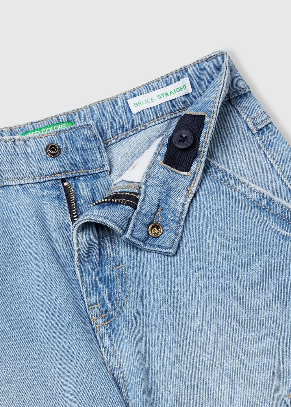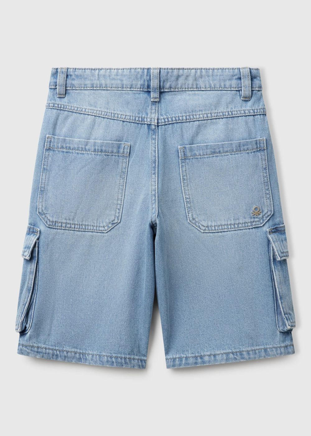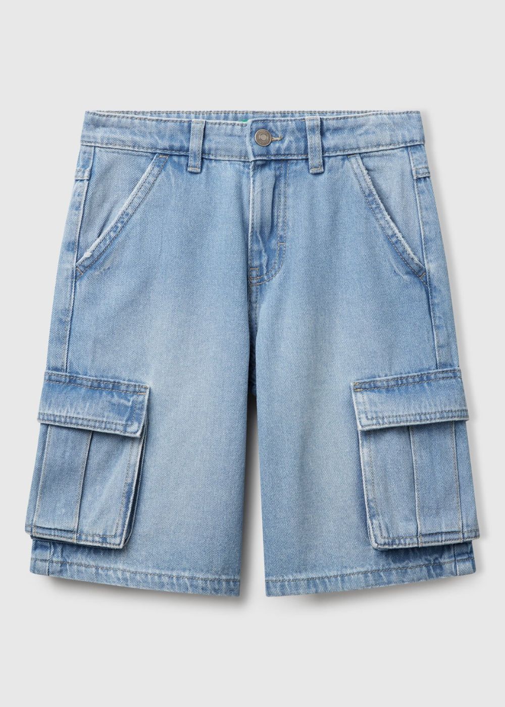 Straight fit cargo shorts in pure cotton denim. Below-the-knee length and large flap pockets on the sides. Zip and button opening, internal adjustable elastic waist. Comfortable and modern.