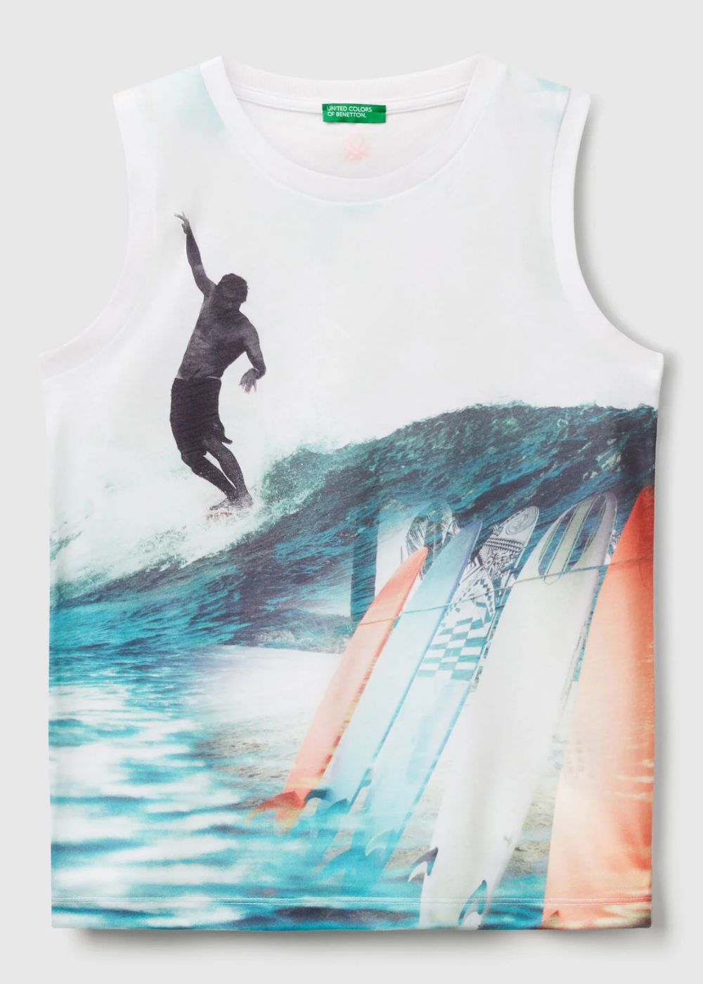 Crew neck tank top in soft jersey. Maxi surf-theme panel print made using a special sublimation technique which allows for image transfer directly from paper to fabric.