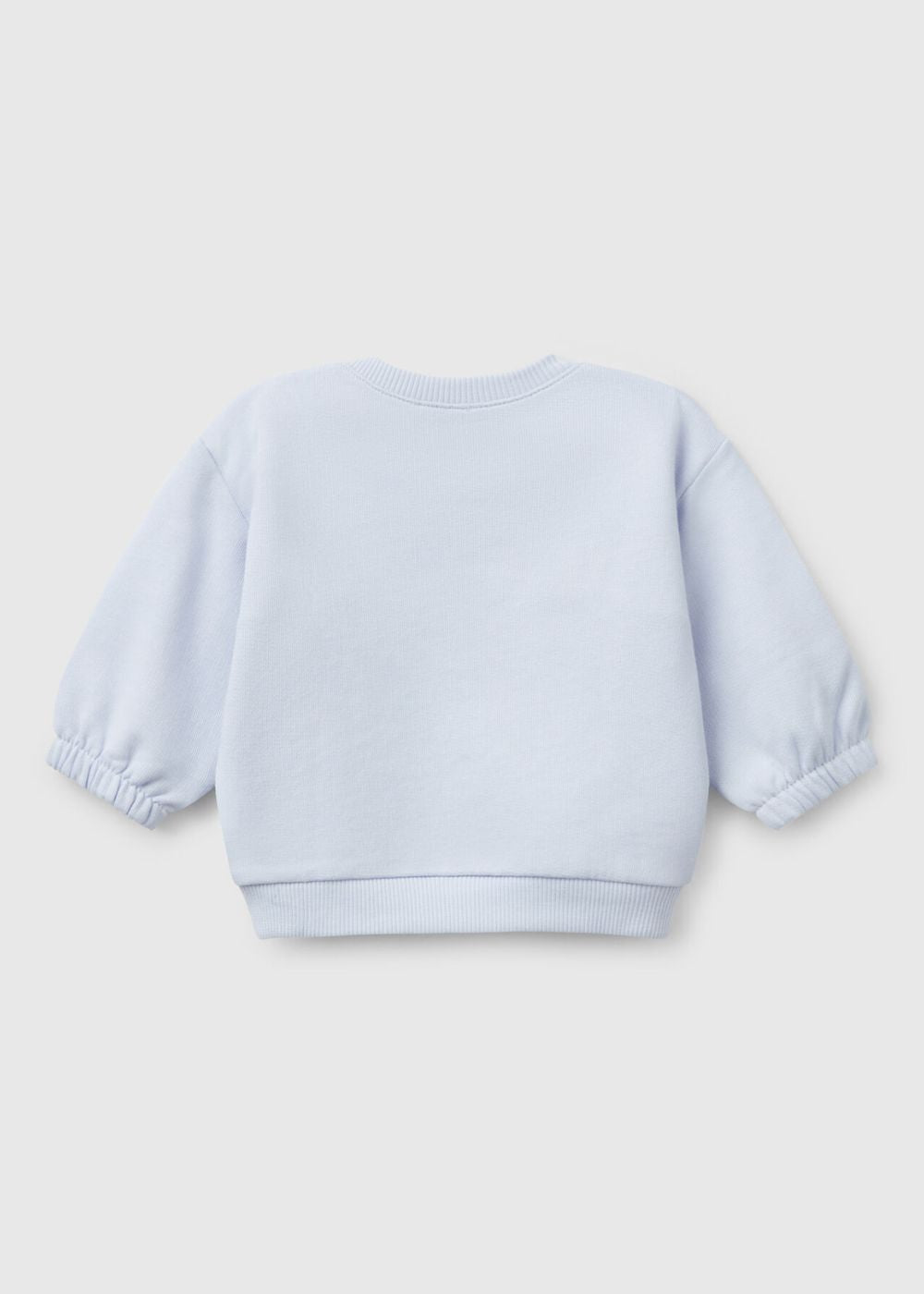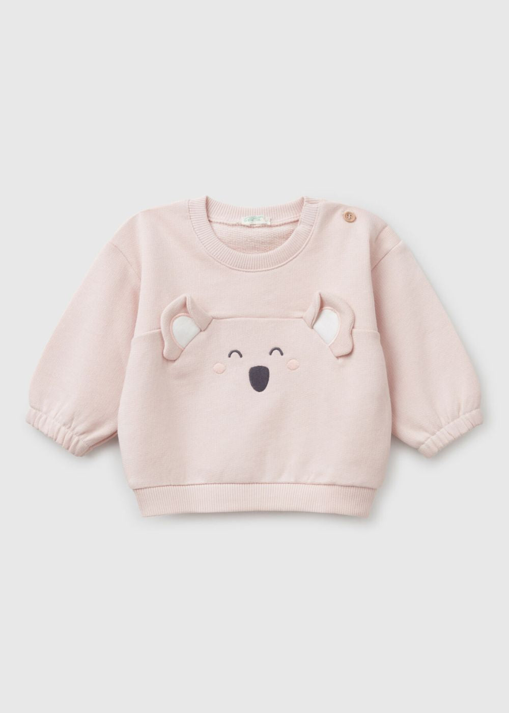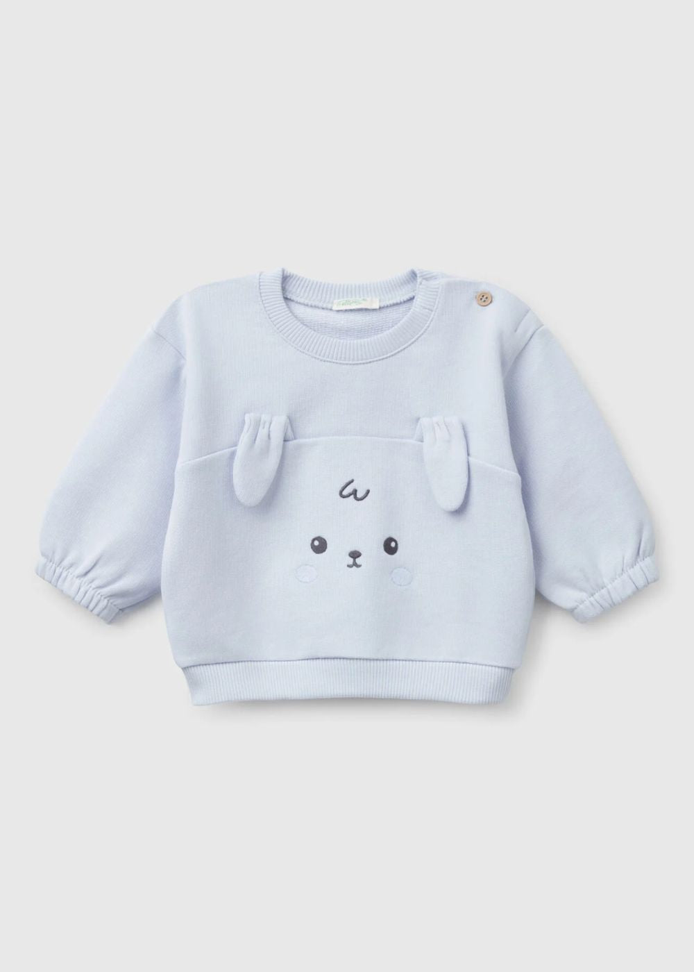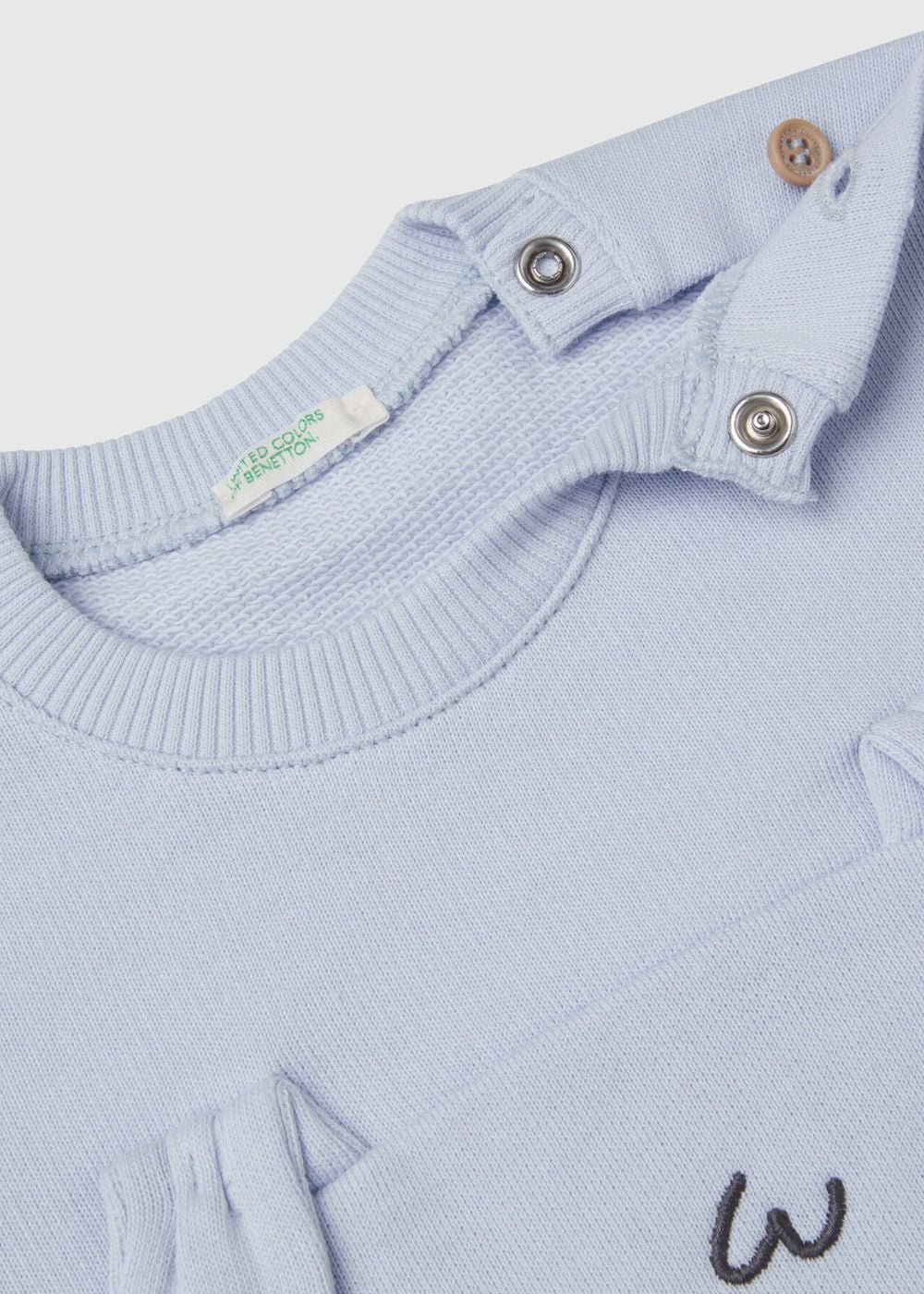 Crew neck long sleeve sweatshirt in pure cotton with consistent yet light feel. Animal face embroidered on the front with ears applied on the front. Opening with buttons on the left shoulder, one exposed wood effect and one hidden automatic. Item made with fabric containing at least 95% organic cotton.