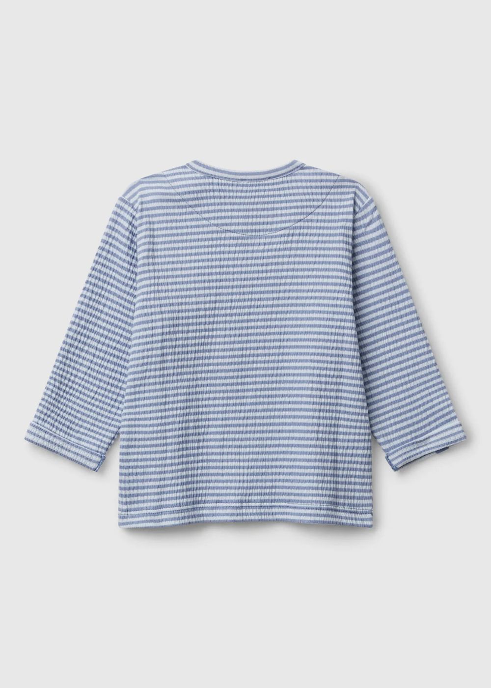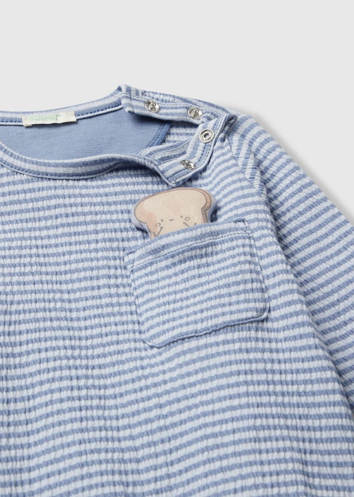 Long sleeve crew neck t-shirt in pure cotton. Practical opening with snap buttons on the left shoulder. Allover striped patterned print. Patch pocket at left breast with cute toast patch, to say goodbye to boredom.