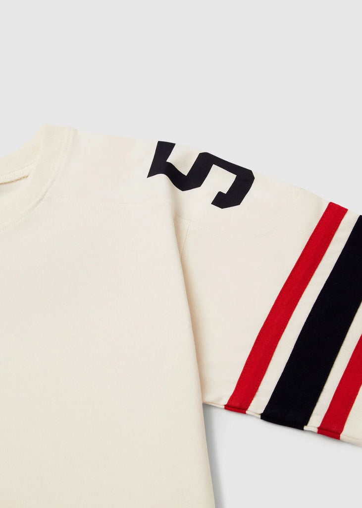 Crew neck t-shirt in soft organic cotton fabric. Loose fit, short sleeves with striped pattern and text print on the back. This garment is made from 100% OCS certified organic cotton. CERTIFIED BY ICEA - ICEA - TX - 611. Products certified according to the Organic Content Standard (OCS) contain independently verified organic content at every stage of the supply chain, from the recycling to the finished product.