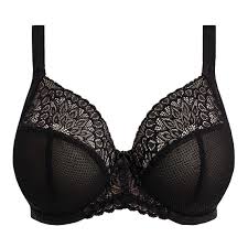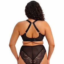 The Tiernie Plunge Bra by Elomi Lingerie comes in black. This black bra combines strength and sophistication. The elegant lace details and flattering fit hug your natural curves, making you feel feminine and confident every day. Thanks to the tailored fit, this bra has a lower neckline that creates a feminine décolletage without compromising support. The shoulder straps are straight and can also be worn as a racerback using the hook at the back. Pair this bra with one of the matching briefs or thongs.