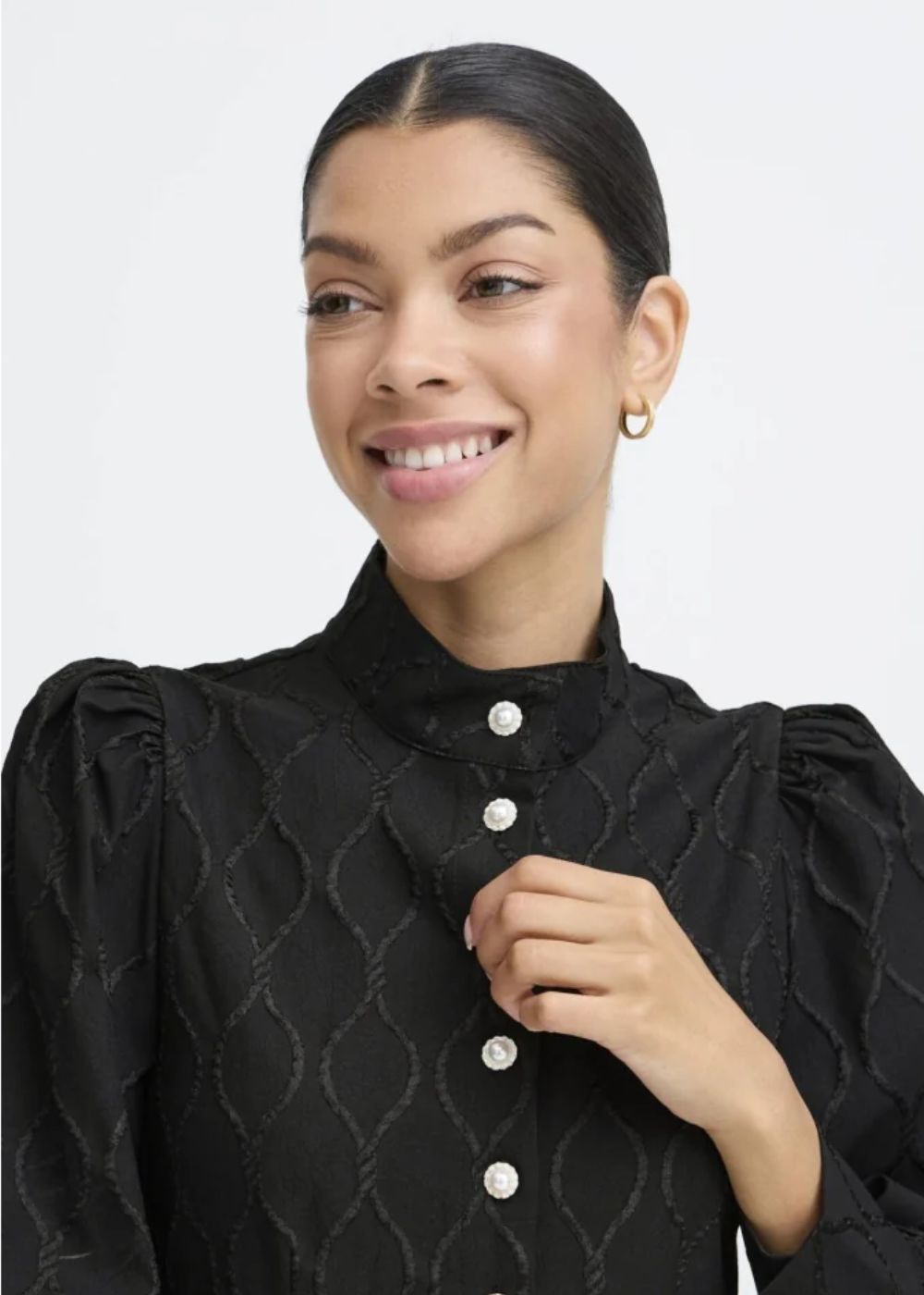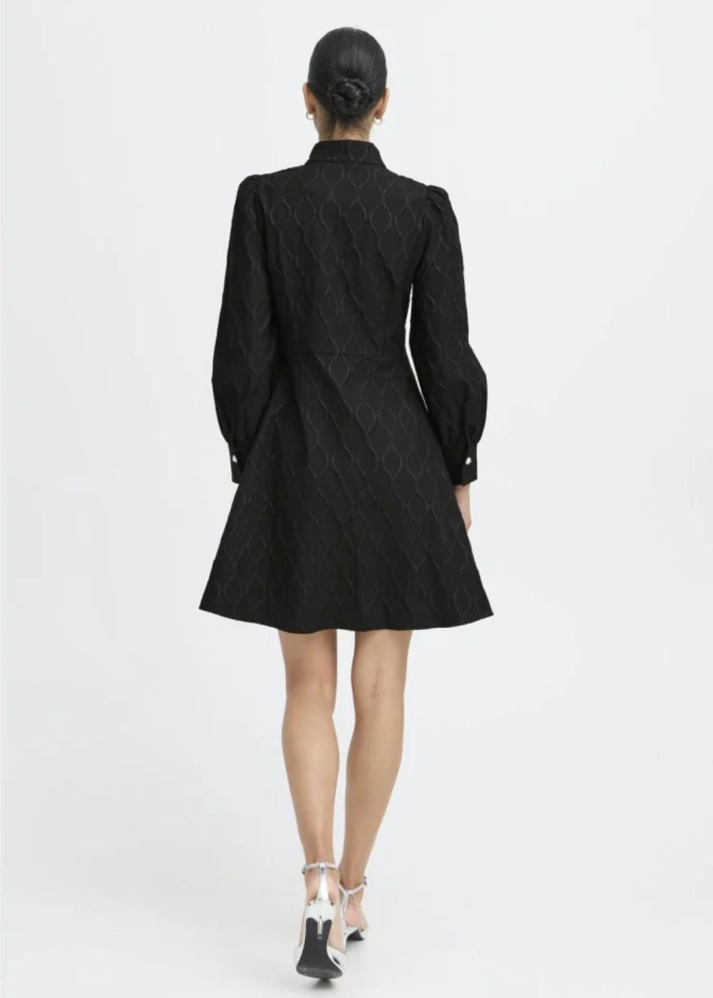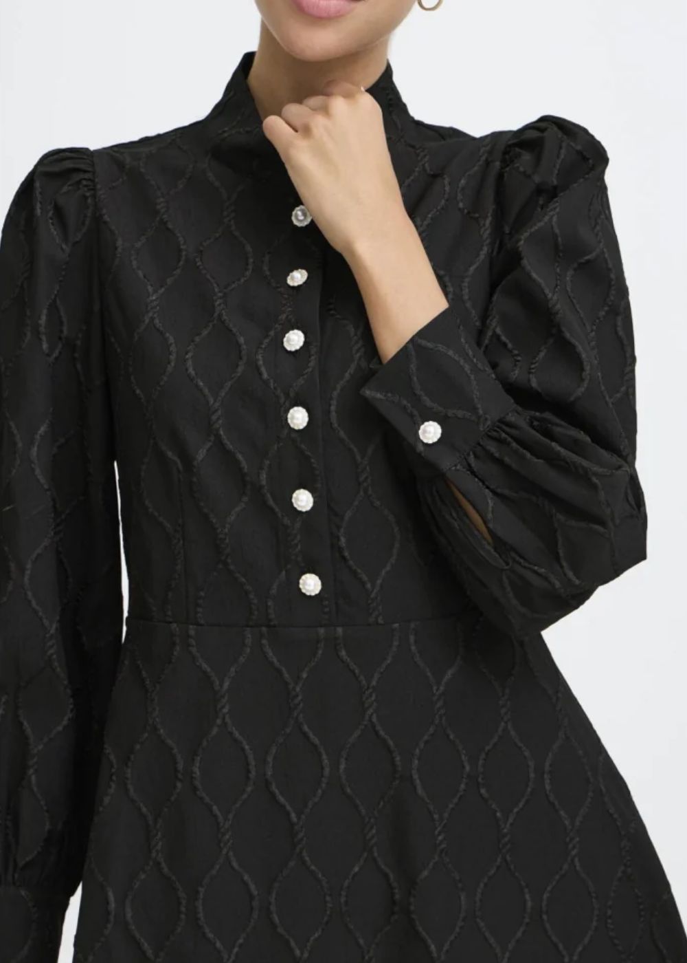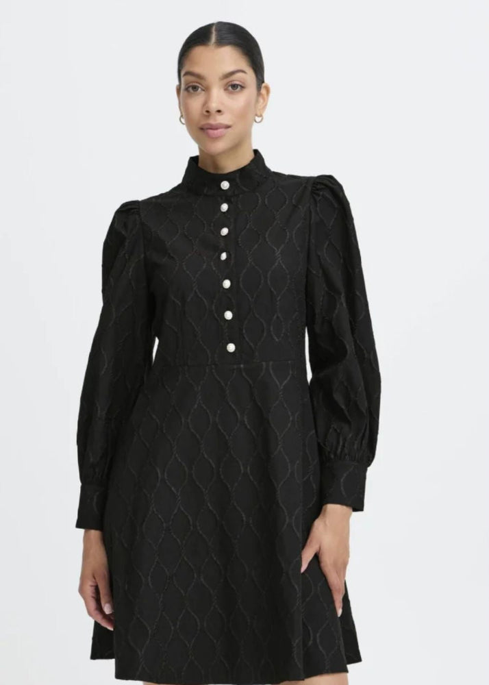 The BY DESMORA DRESS by B.Young exudes elegance with its delicate pattern and refined details. Featuring a subtle collar, continuous button front, and graceful puff sleeves, it offers a timeless silhouette perfect for any occasion. Easily paired with tights and boots or stilettos, this dress blends sophistication with versatile wearability.