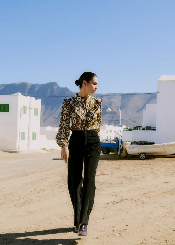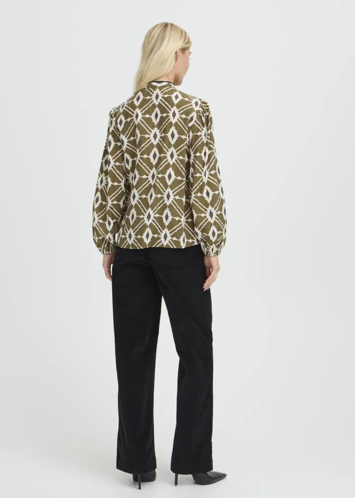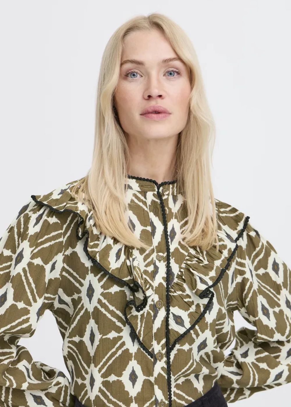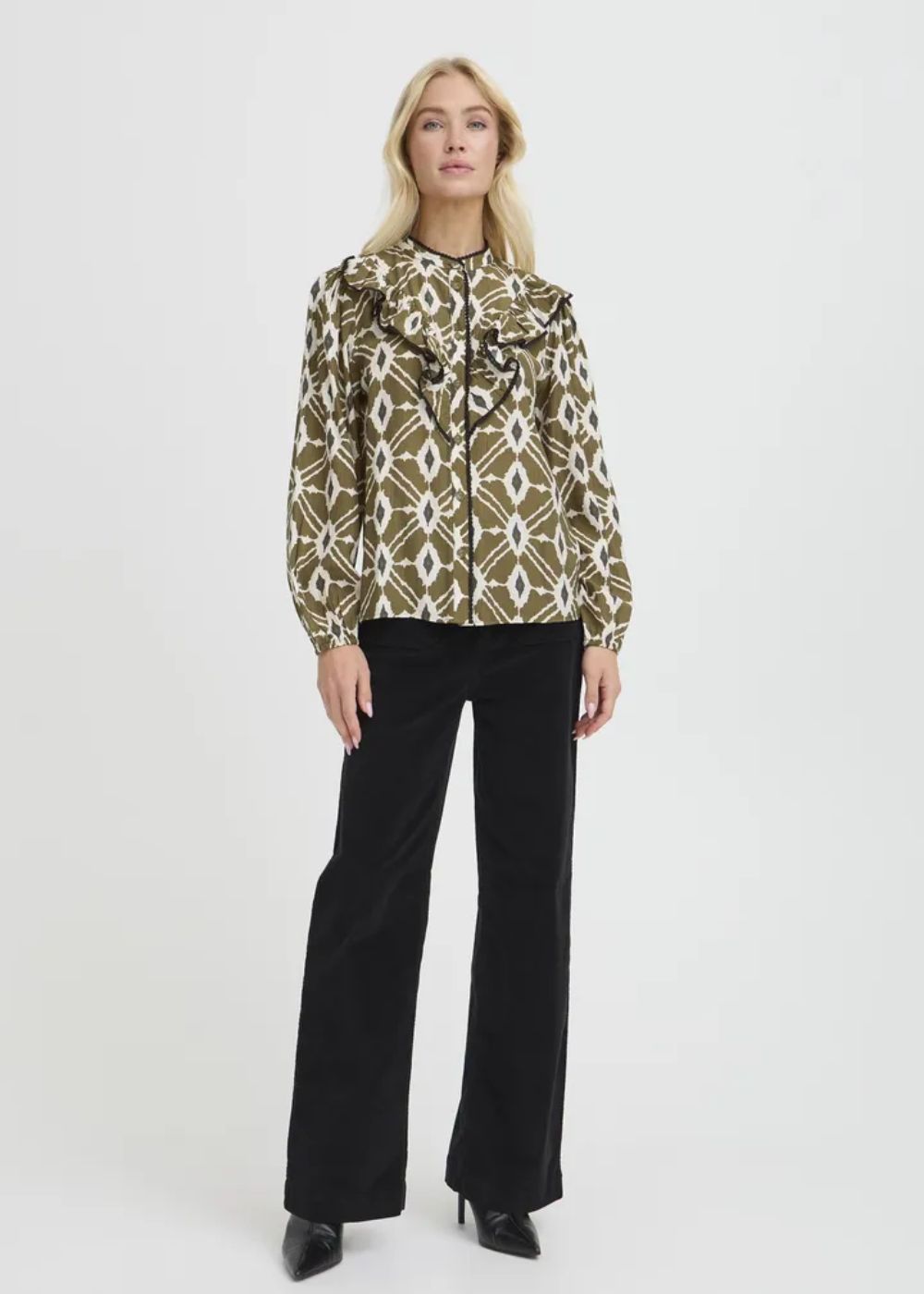 Blouse with ruffle front detail and relaxed fit, featuring a stand collar and long sleeves. Comfortable design, suitable for work or casual settings. Ideal for versatile wardrobe styling across seasons.