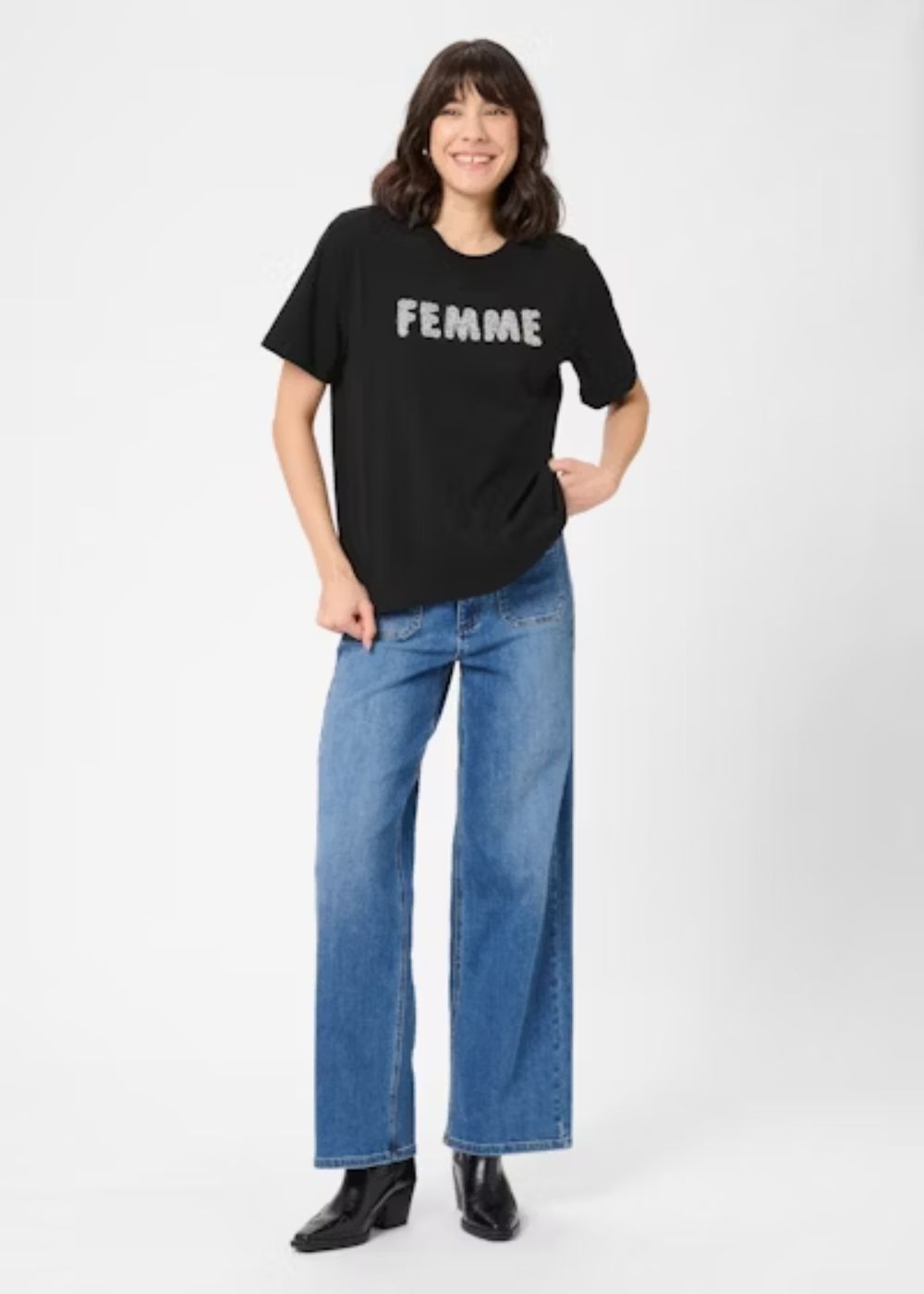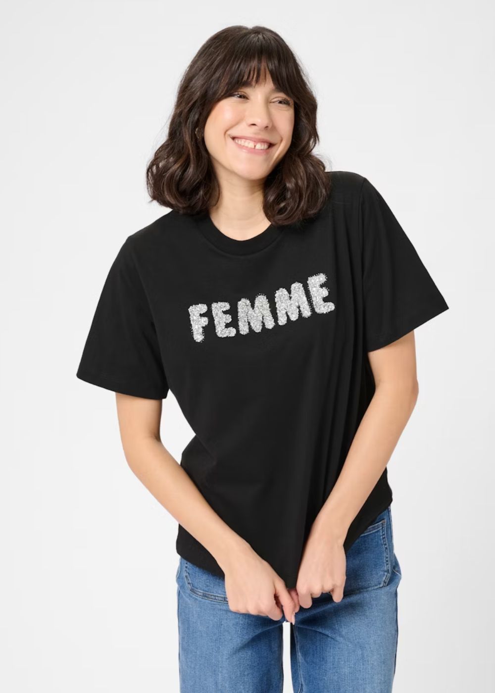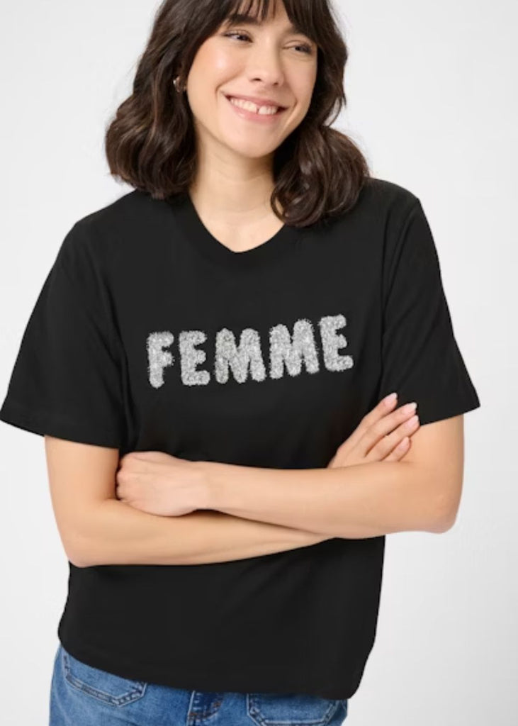 Sequin T-shirt with a straight fit and short sleeves. Features a classic crew neckline and bold sequin 'FEMME' lettering on the front for standout style.