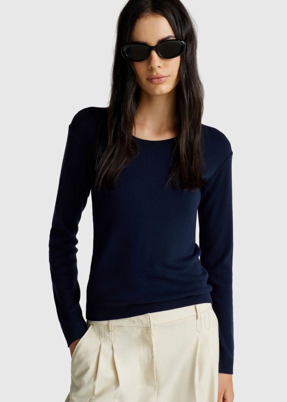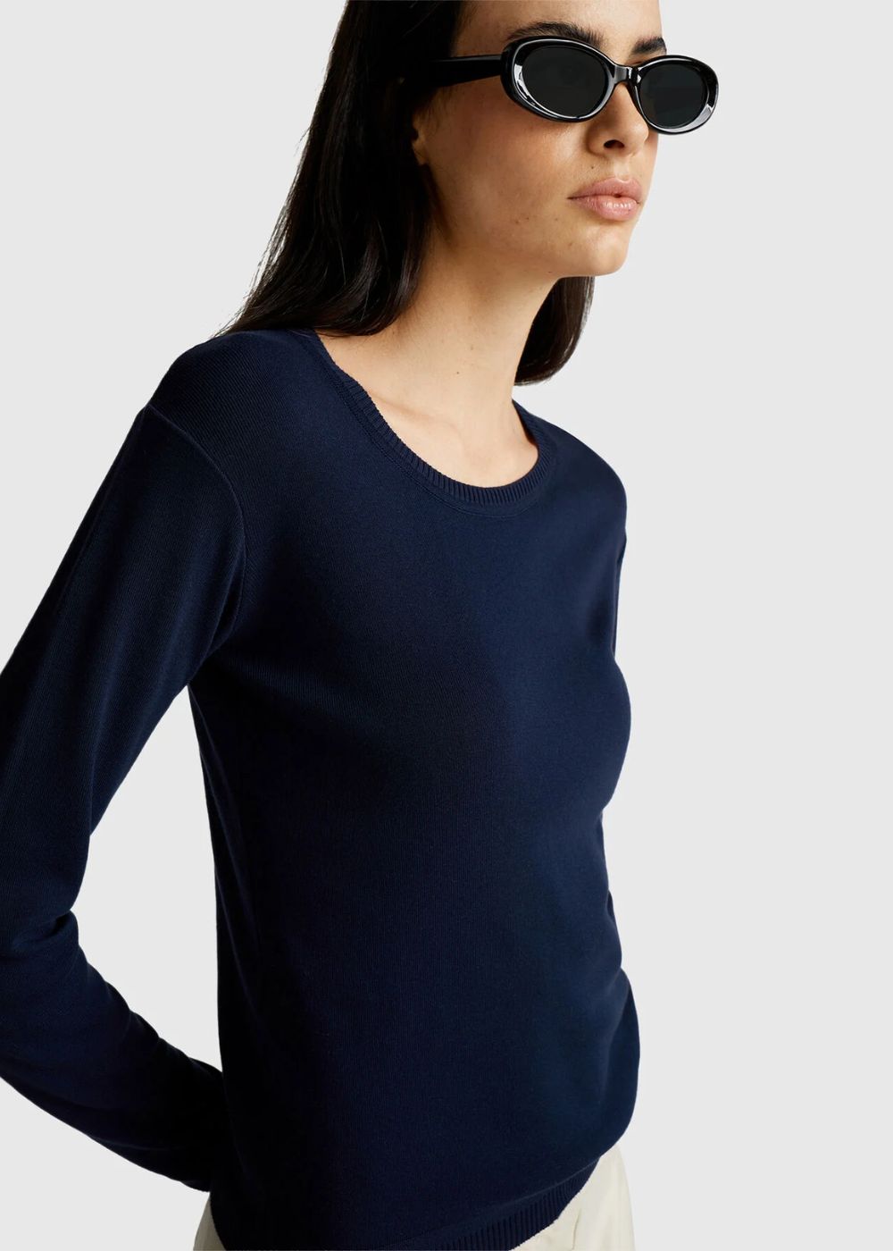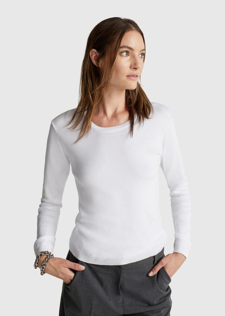 Long sleeve crew neck sweater in pure cotton. Basic, essential and perfect for every combination.