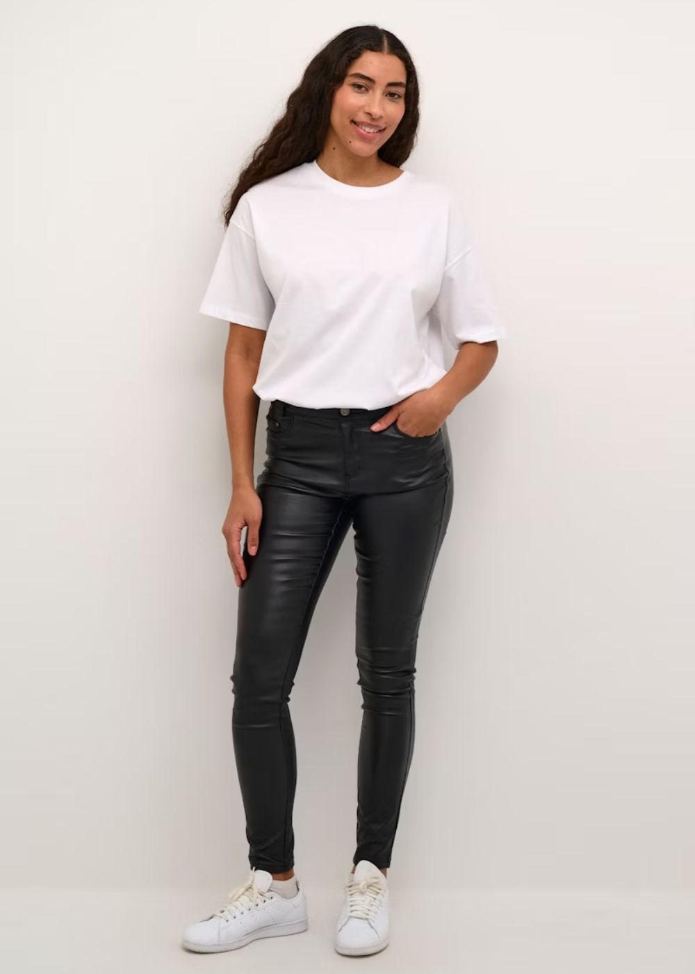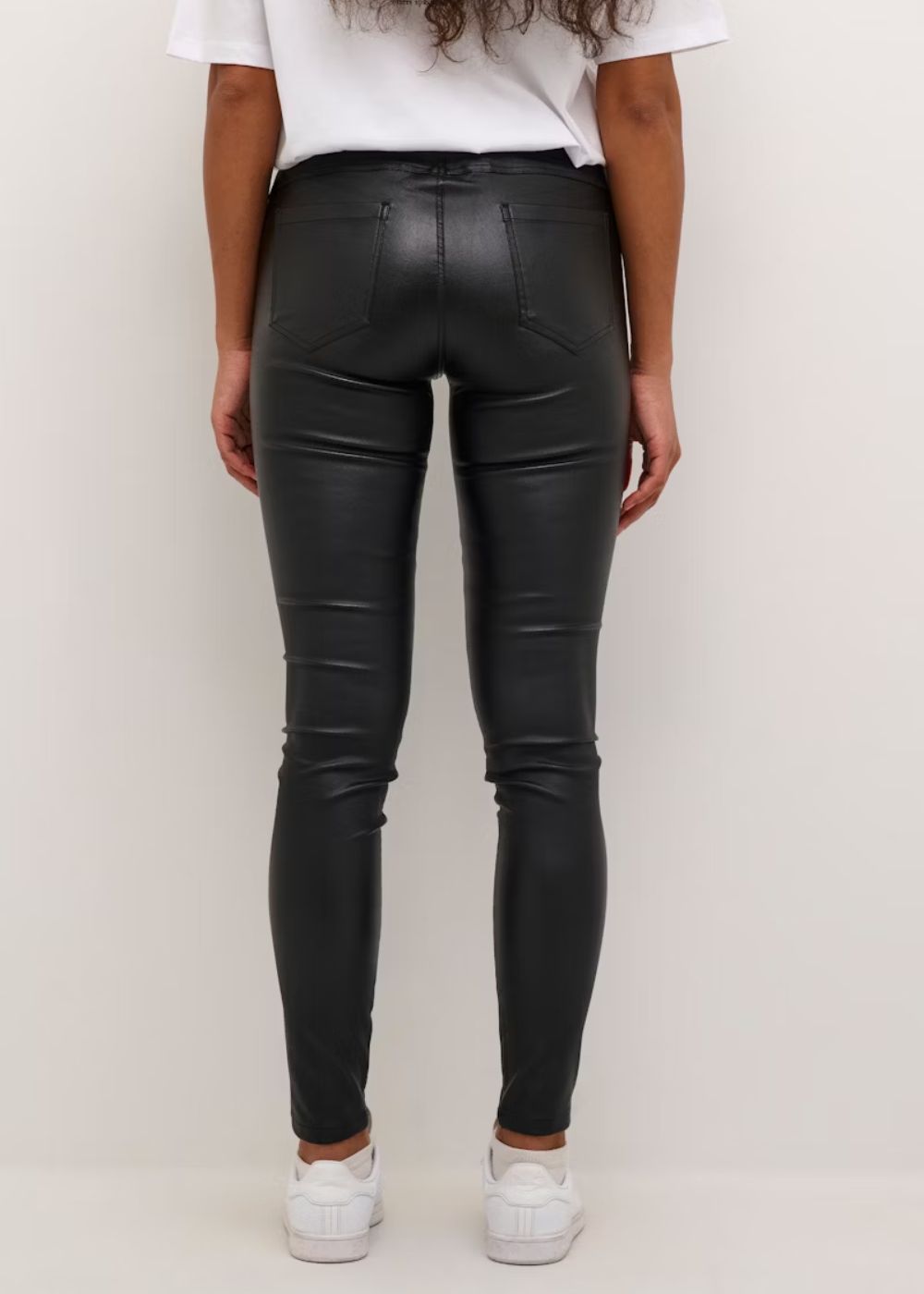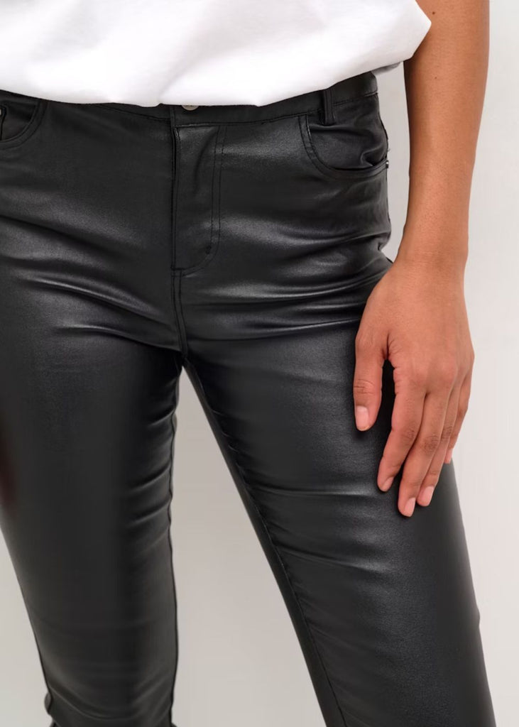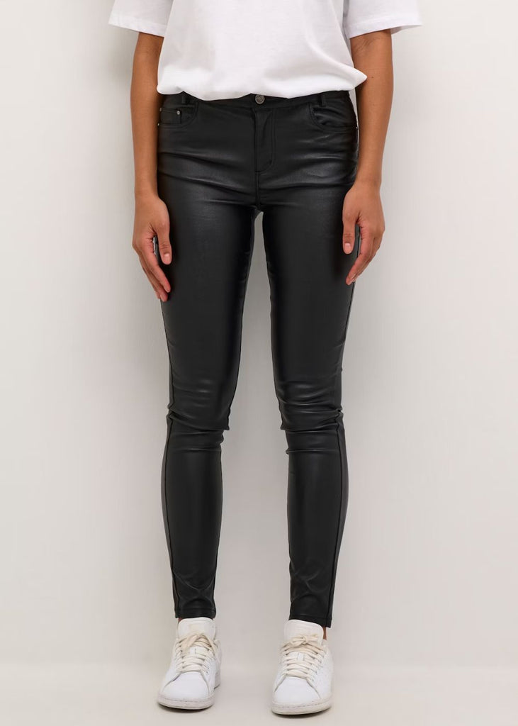 Sleek faux leather pants with a skinny fit and classic five-pocket design. Features a button-and-zip closure and a subtle glossy finish for a bold, modern look.