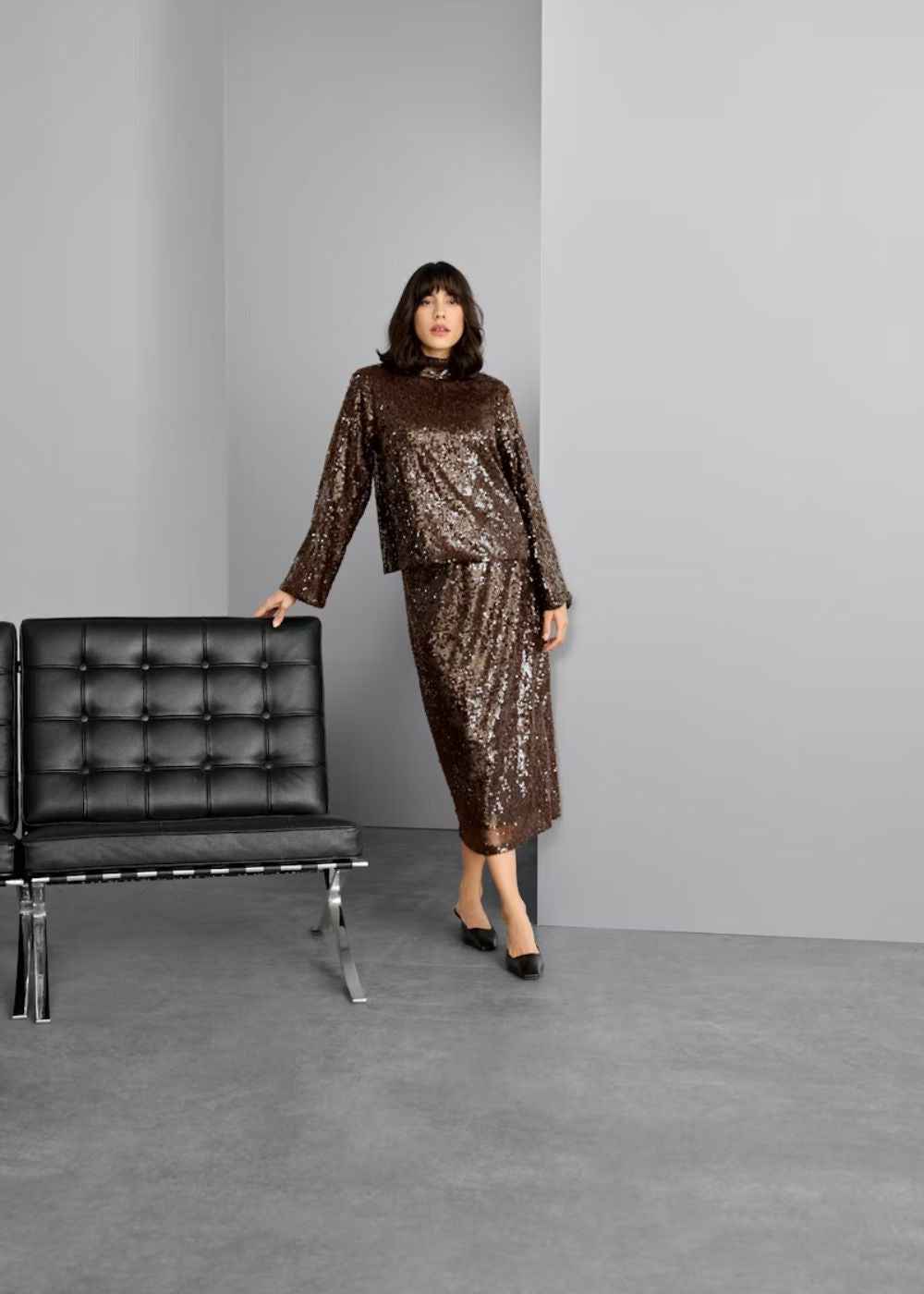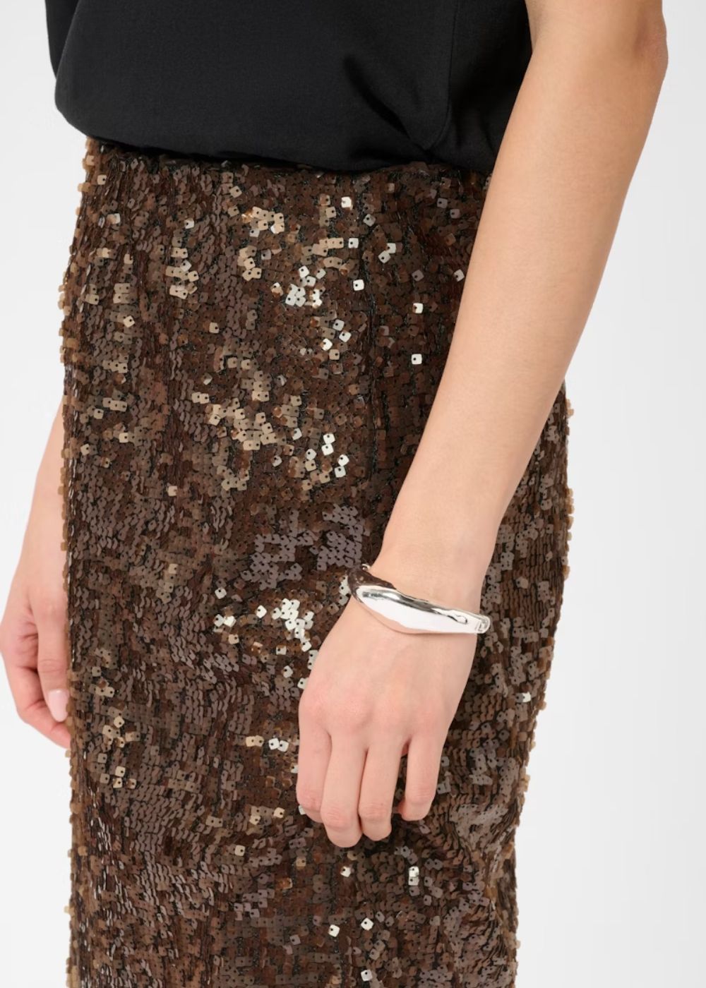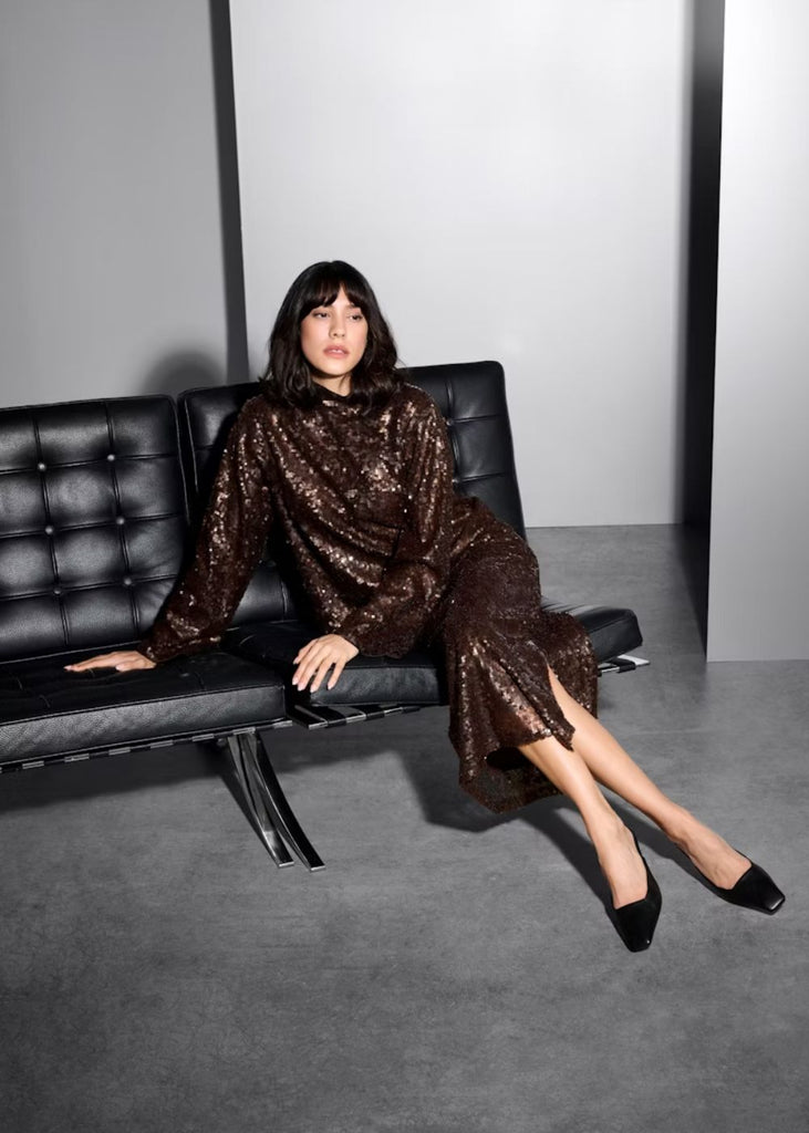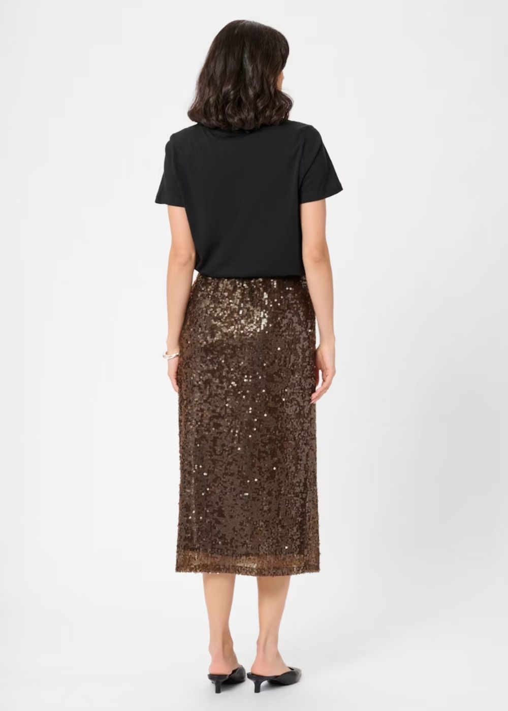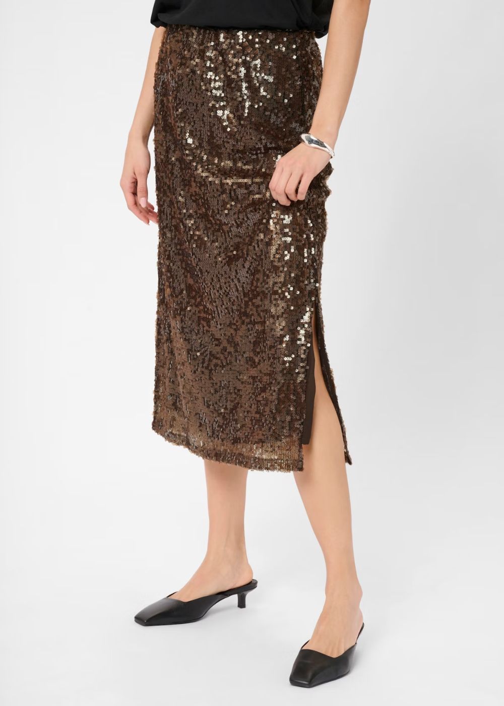 Allover sequin skirt is cut in a straight silhouette with a comfortable mid-rise waist. Midi length and subtle side slit add an elevated, dazzling edge.
