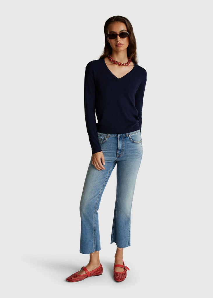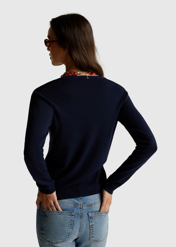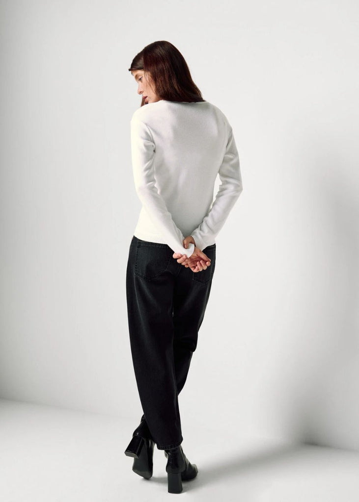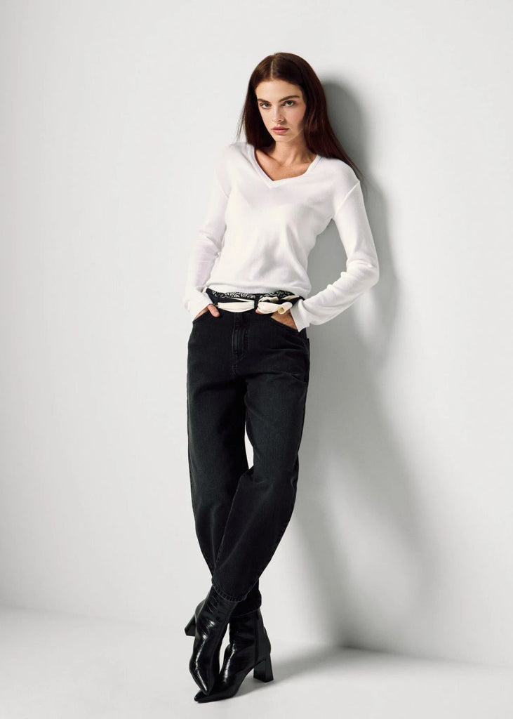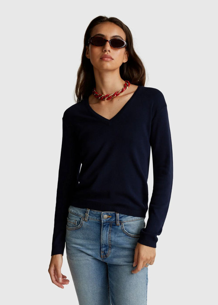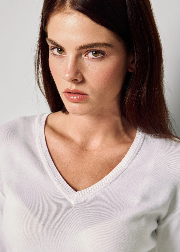 Long sleeve V-neck sweater in pure cotton. Basic, essential and perfect for every combination.