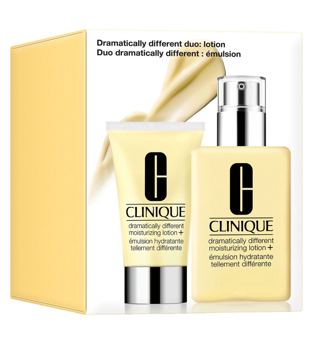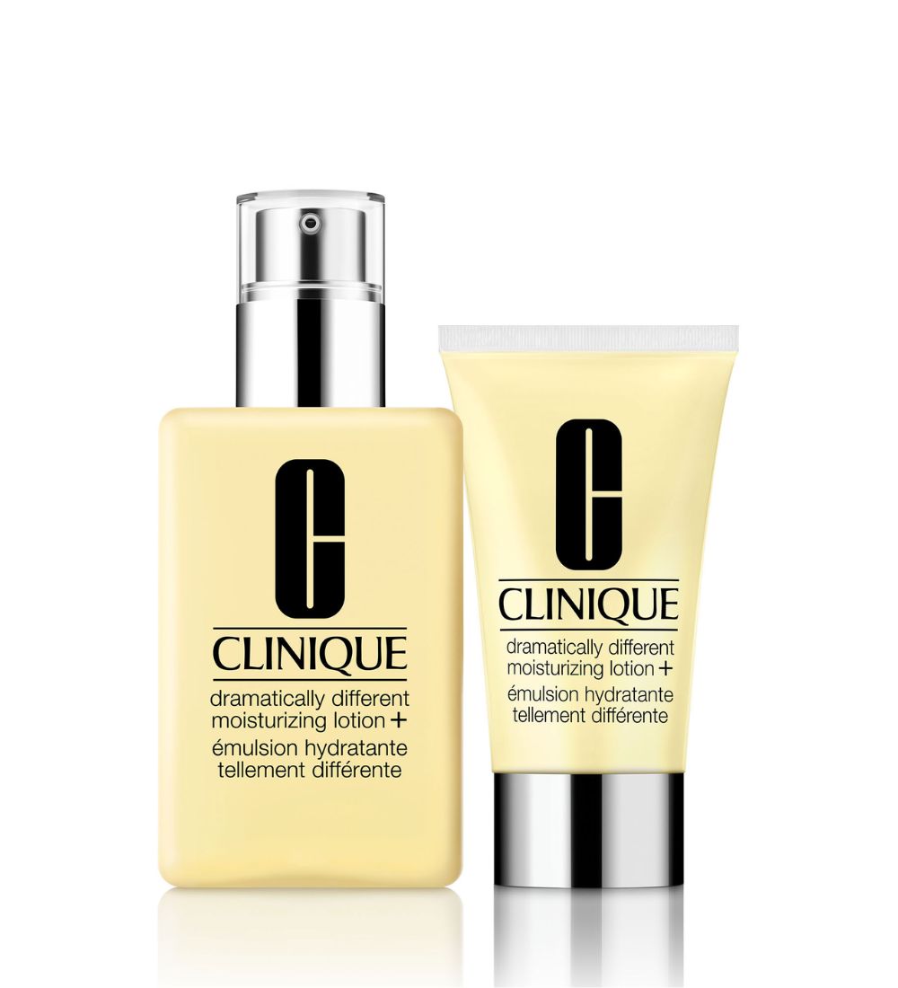 Description: A skincare duo featuring Clinique’s Dramatically Different Moisturizing Lotion+™ in two sizes—perfect for home and travel. Suitable for very dry to dry, and dry combination skin and 100% fragrance-free.
