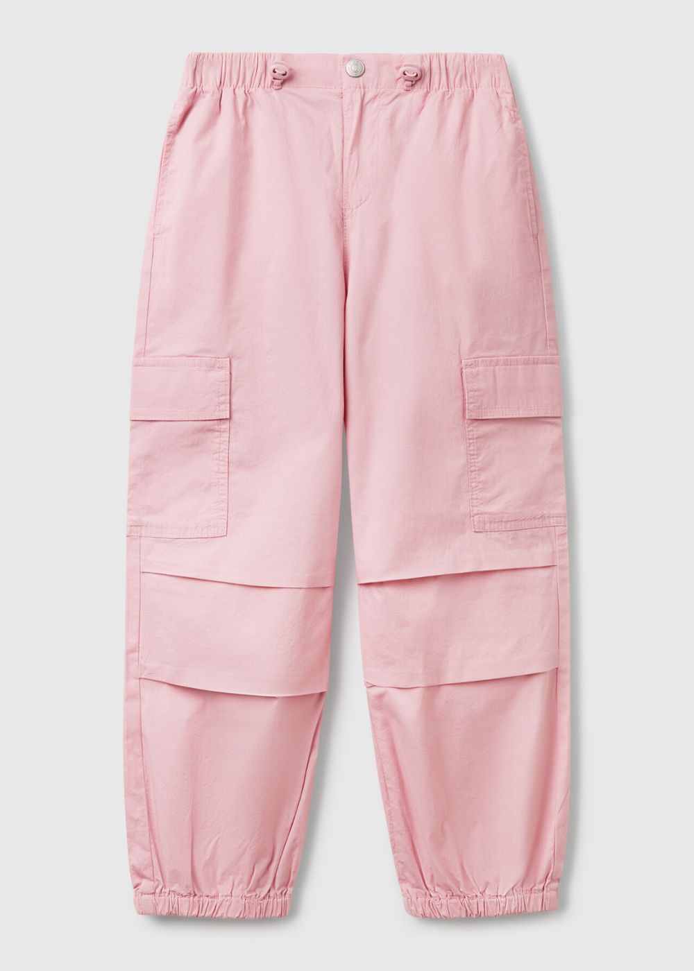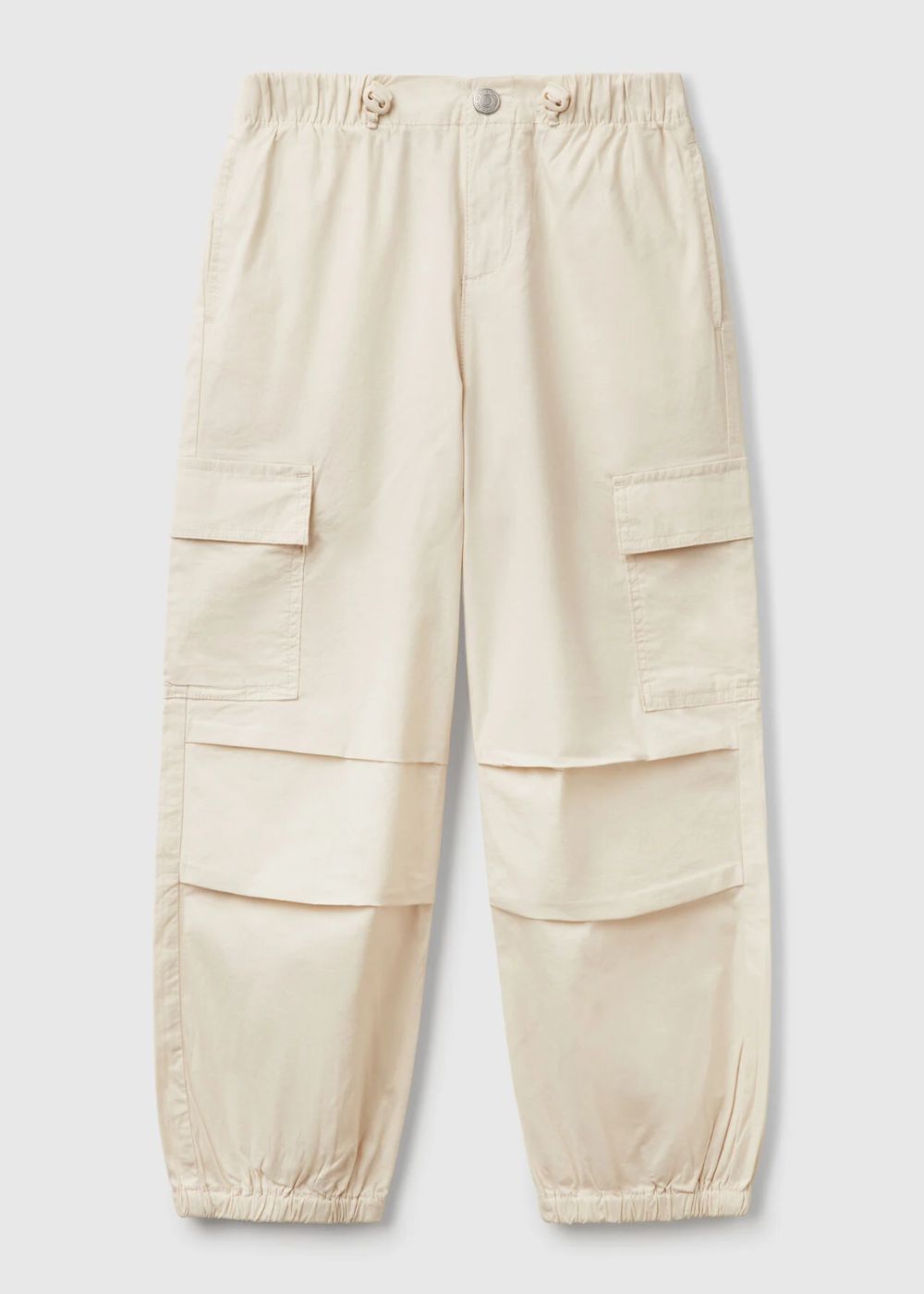 Long cargo model trousers in stretch cotton. Waist with elastic drawstring and side cord stoppers, zip and button opening. Inset pockets at the sides and large patch pockets with flap on the side. For a modern and decisive look.