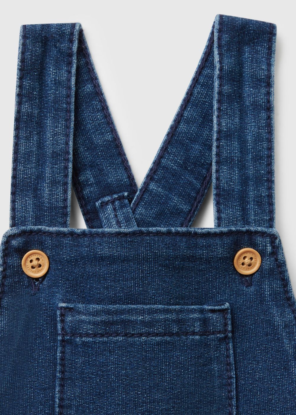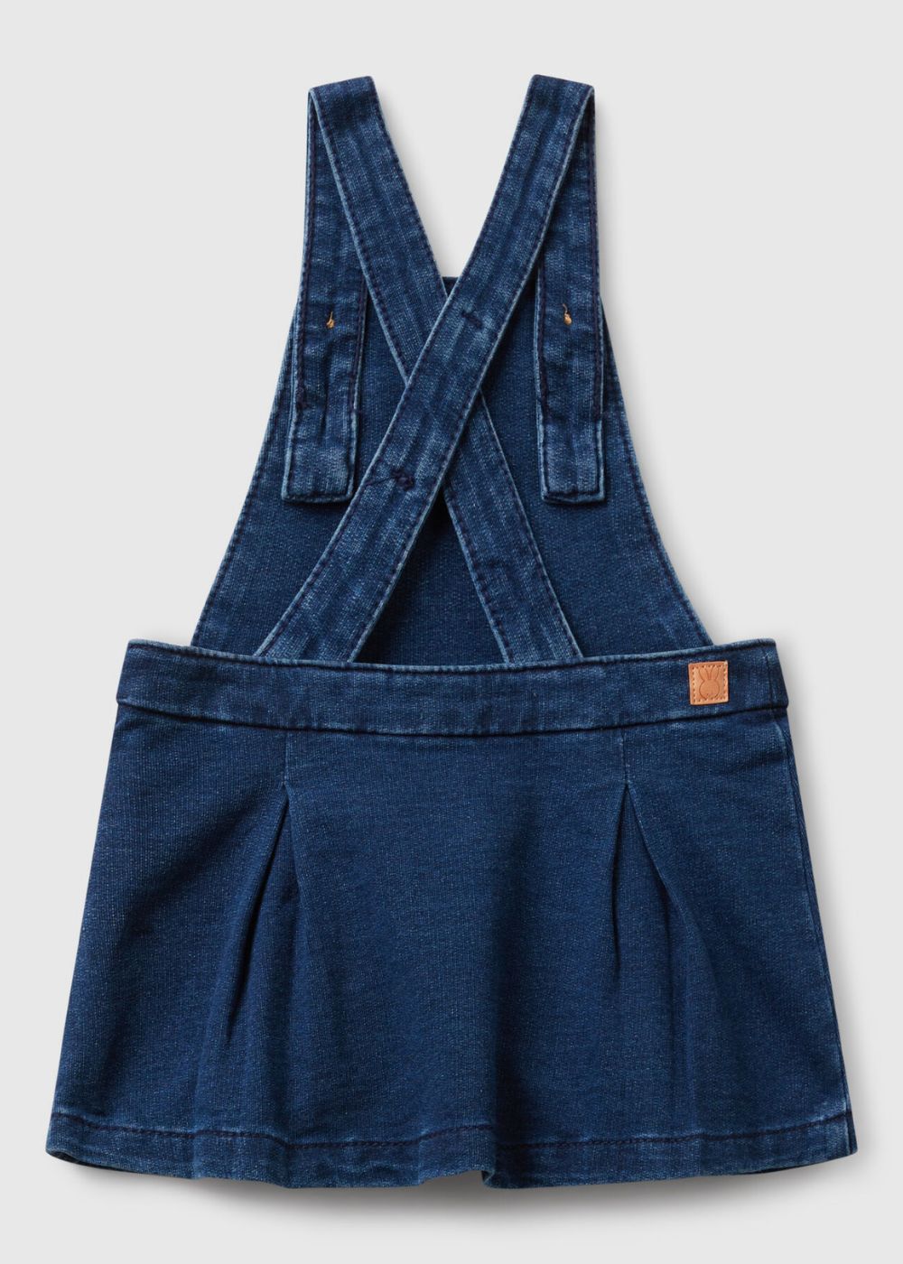 Cute denim dungaree dress in stretch cotton blend. Fixed shoulder straps crossed on the back and patch pocket on the bib. Pleated skirt with decorative wood-look buttons on the front. Refined and feminine, to pair with a t-shirt or cotton sweater.