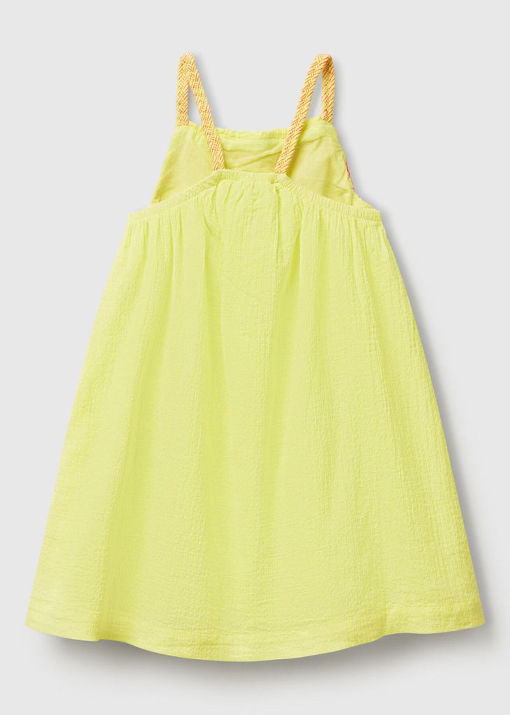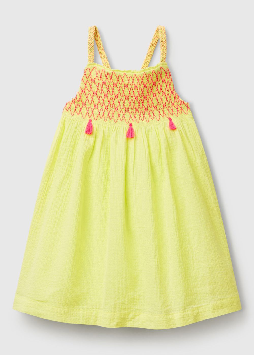 Dress lined in lightweight pure cotton fabric and wide fit. Rope look thin shoulder straps, embroidered top with neon yarn on front and tassel applique. Chic and feminine, for a summer mood.