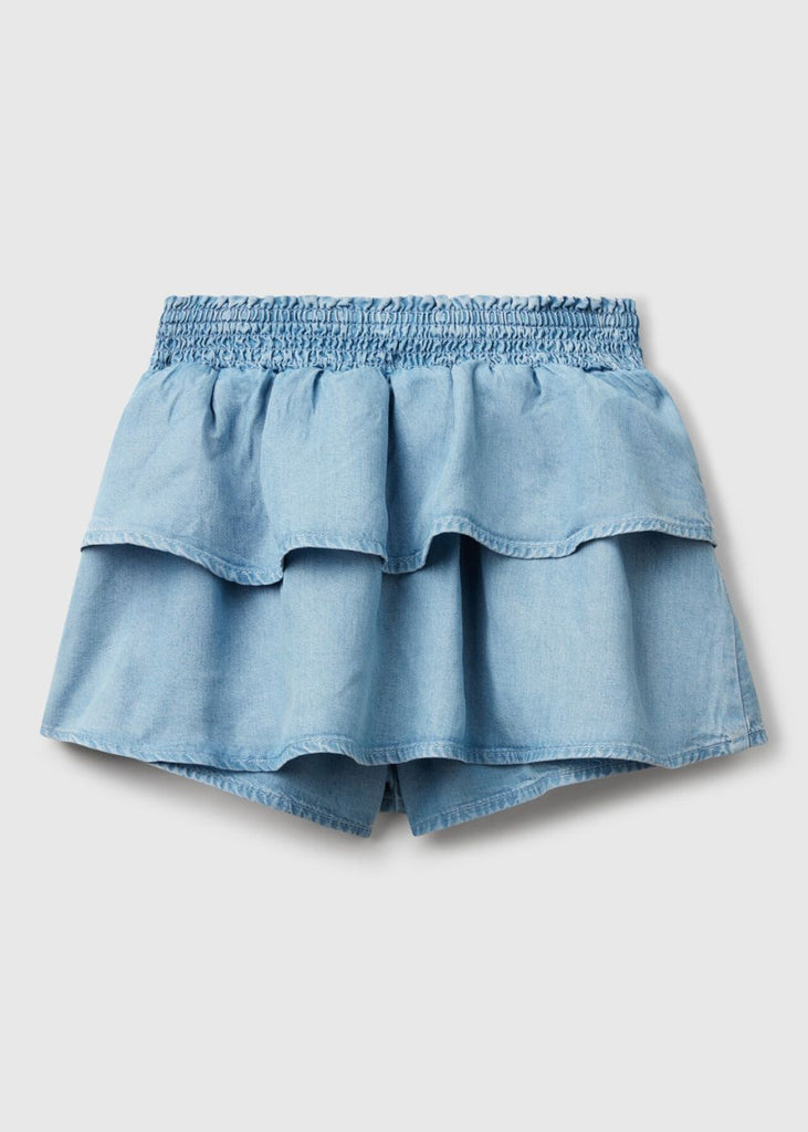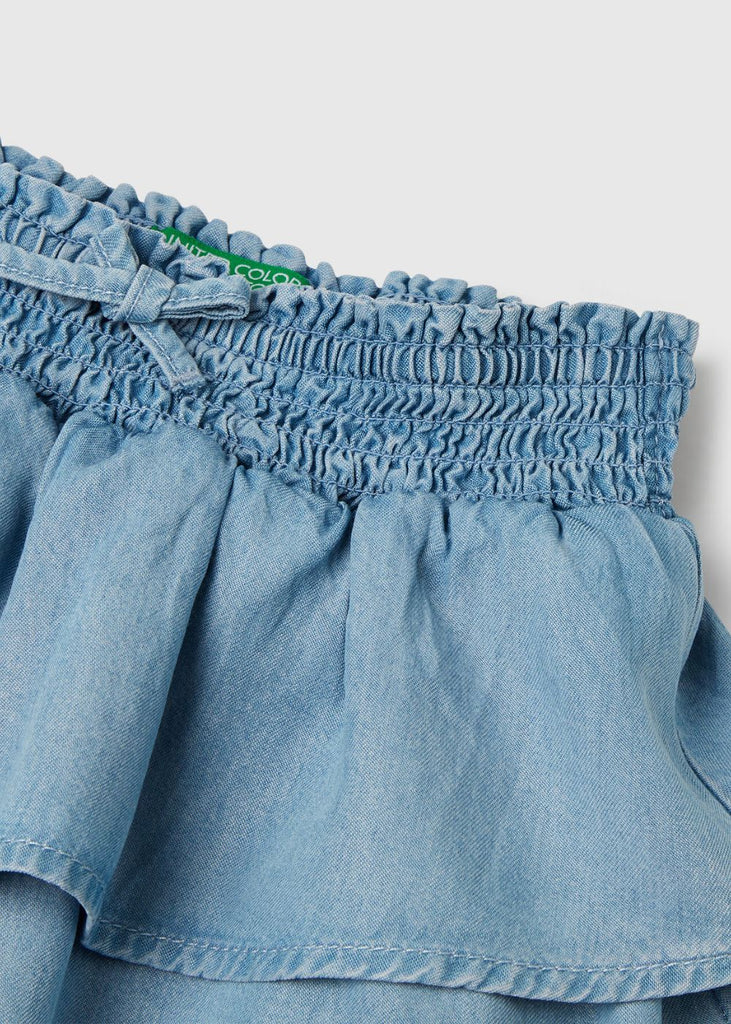 Short skirt in chambray with frills. Practical drawstring at waist. Lightweight, versatile and ultra feminine.