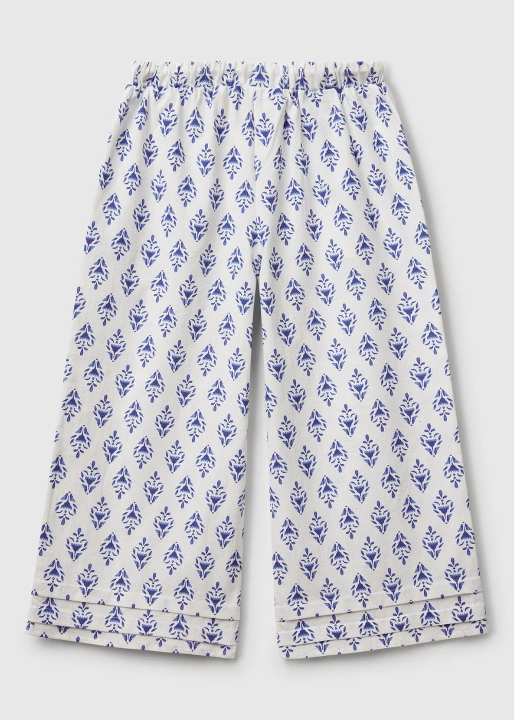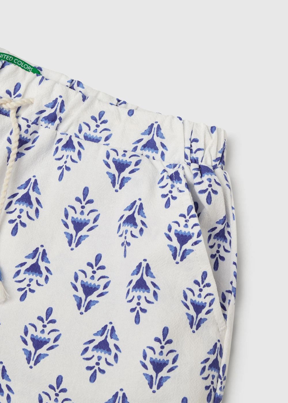 Long trousers in lightweight pure cotton fabric. Wide leg with below-calf length. Waist with inner elastic and drawstring, diagonal pockets on the front. Colorful pattern print all over the garment, for a bold and feminine look.