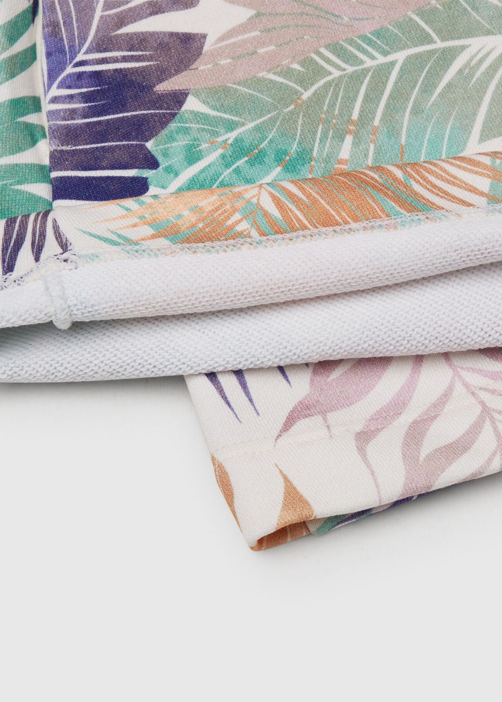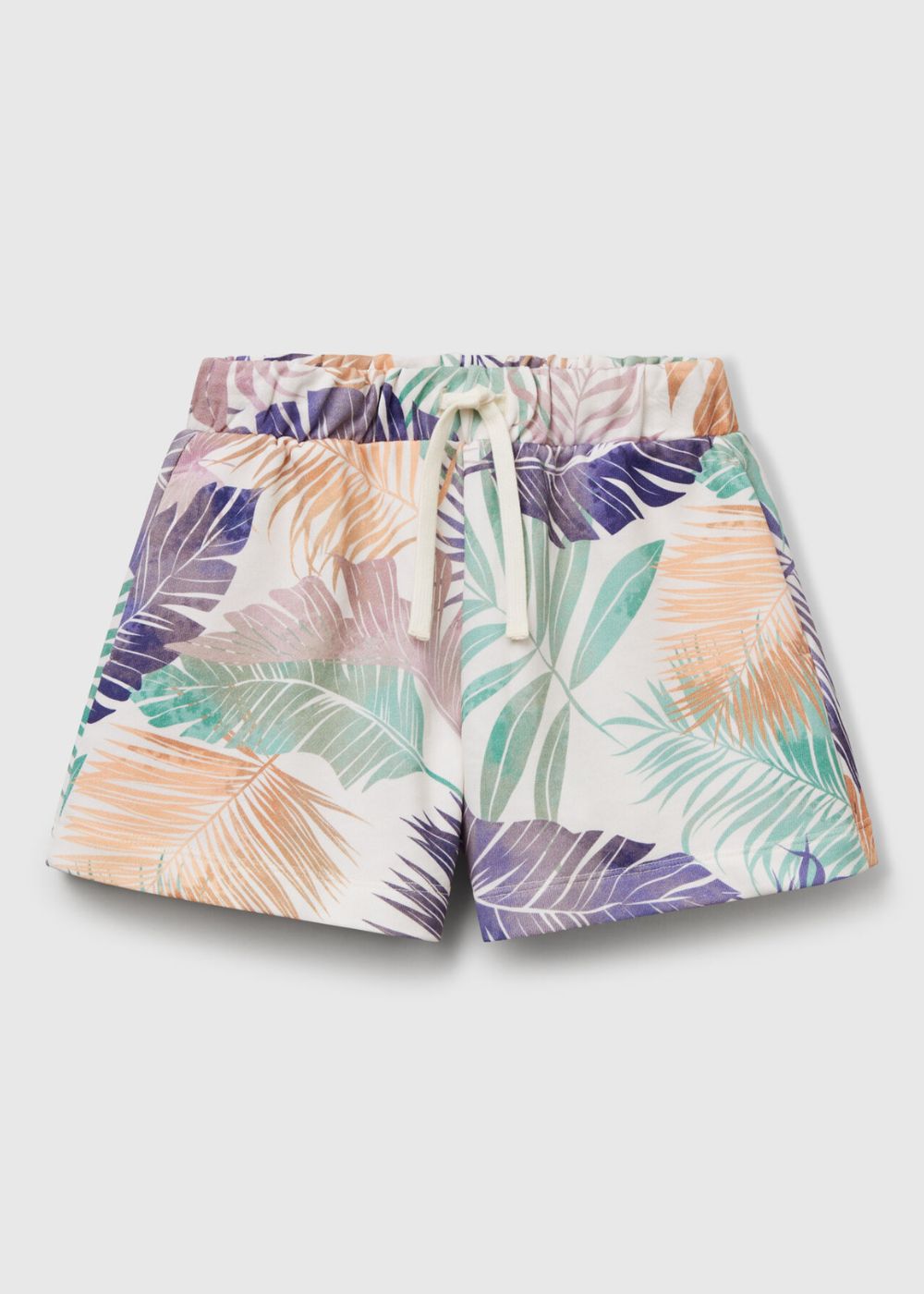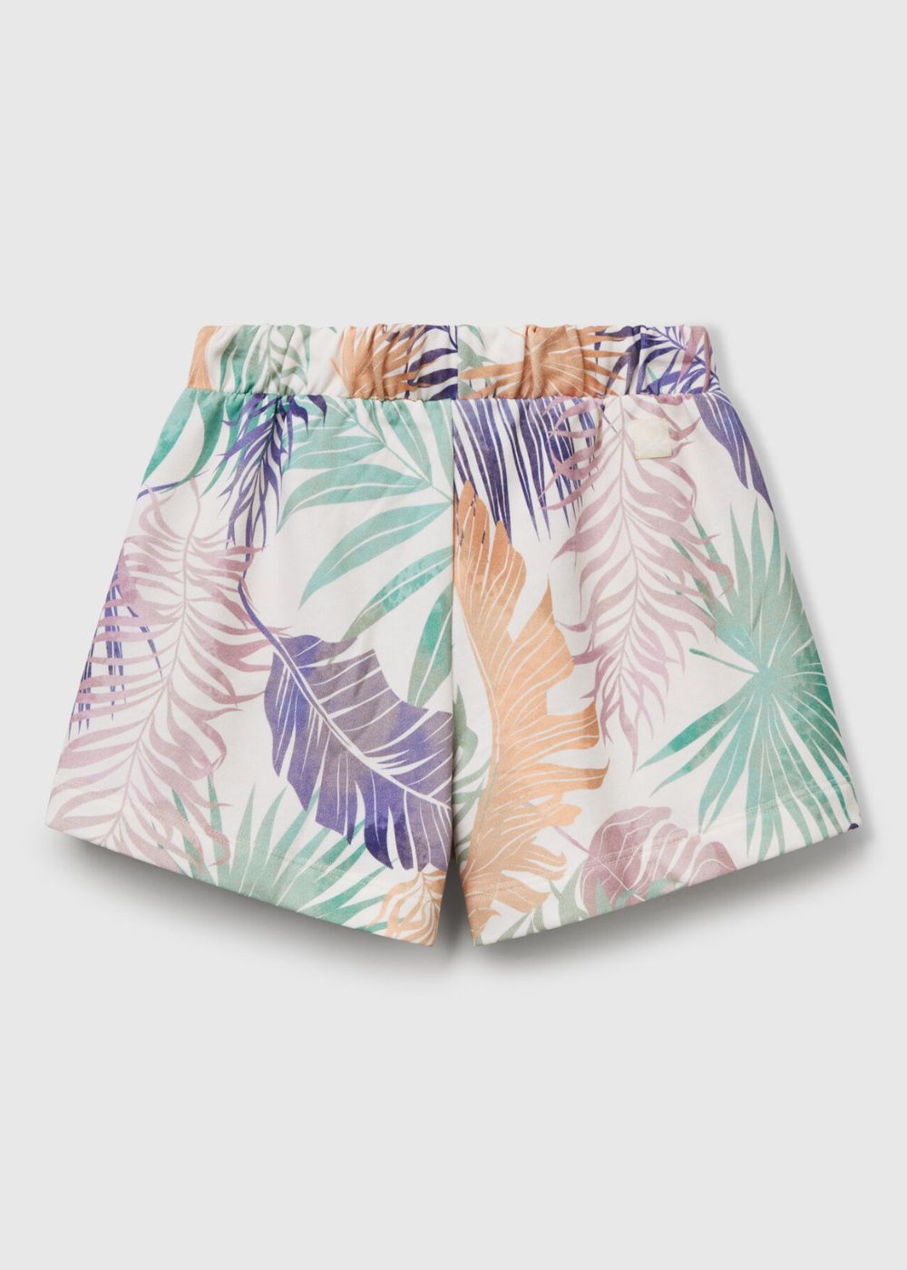Shorts in soft pure cotton sweat. Waist with inner elastic and drawstring, pockets inserted at the sides. Colorful tropical print all over the garment, for dynamic and cheerful outfits.