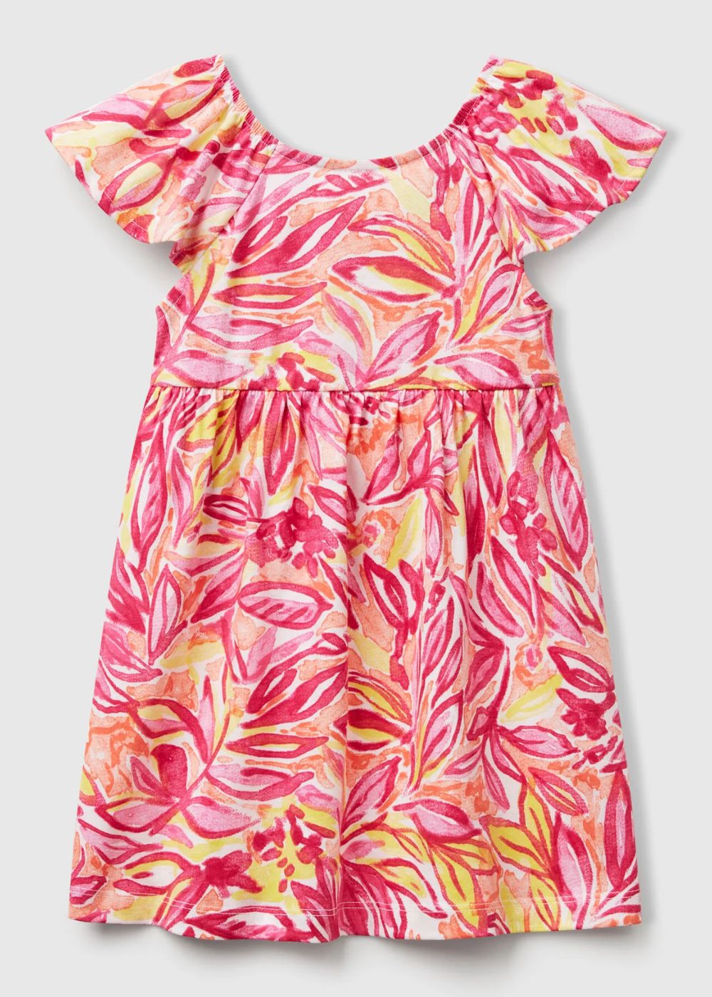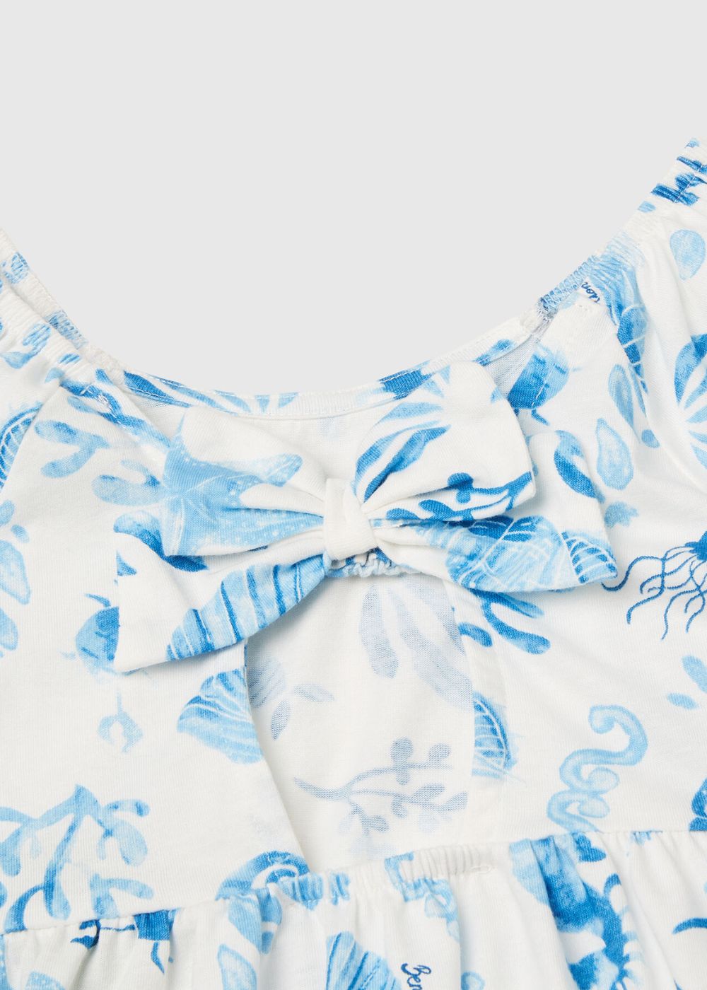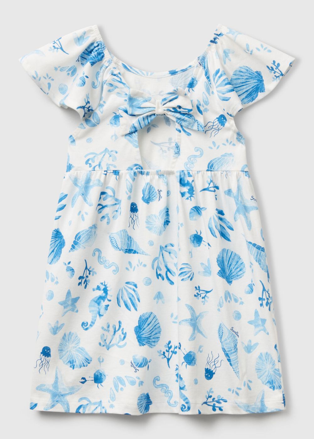 Dress in soft pure cotton fabric with slightly wide fit. Round neck, short sleeves with trim and back bow applique. Colorful allover shell print, to show off during the outdoor season.