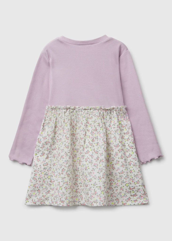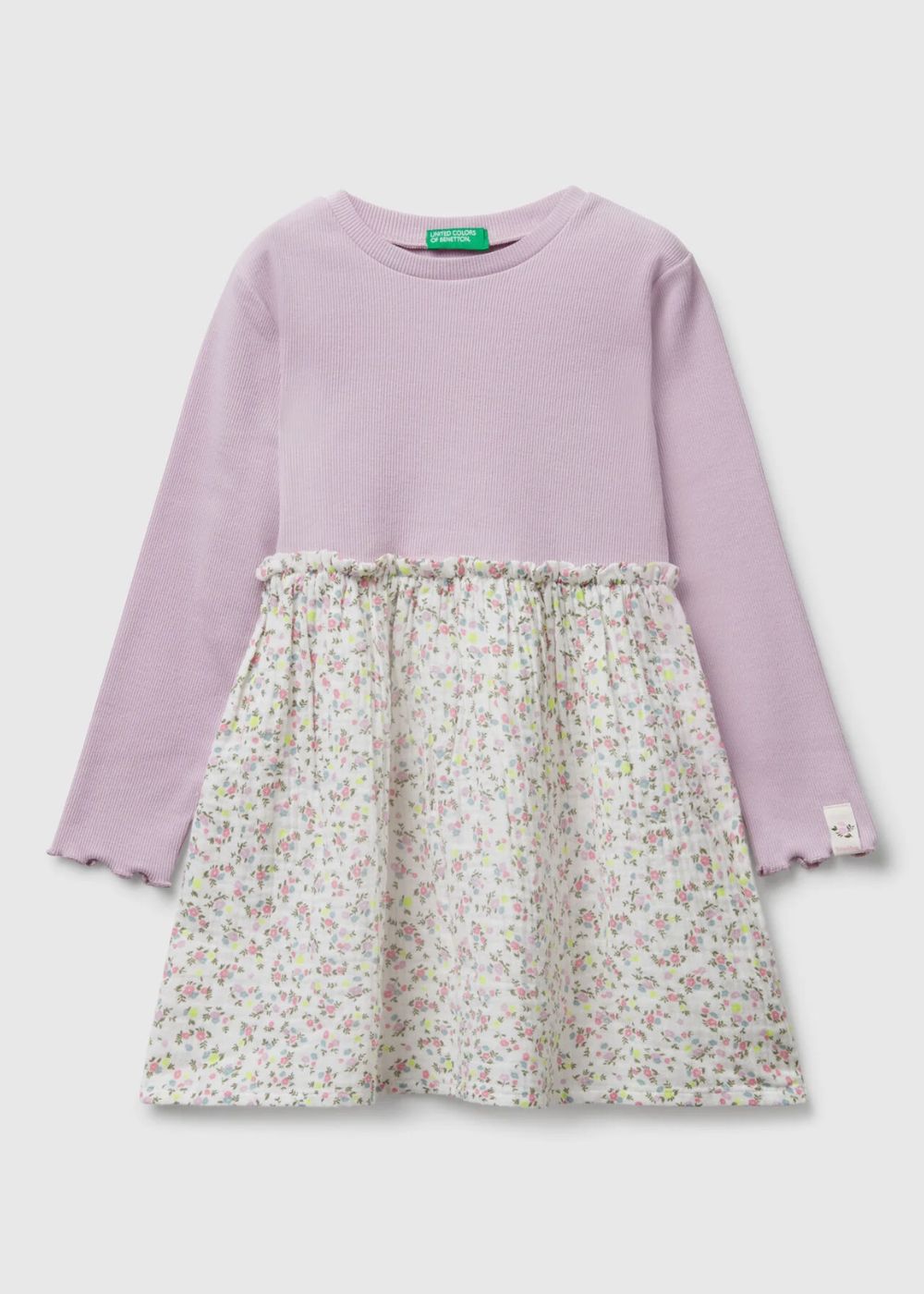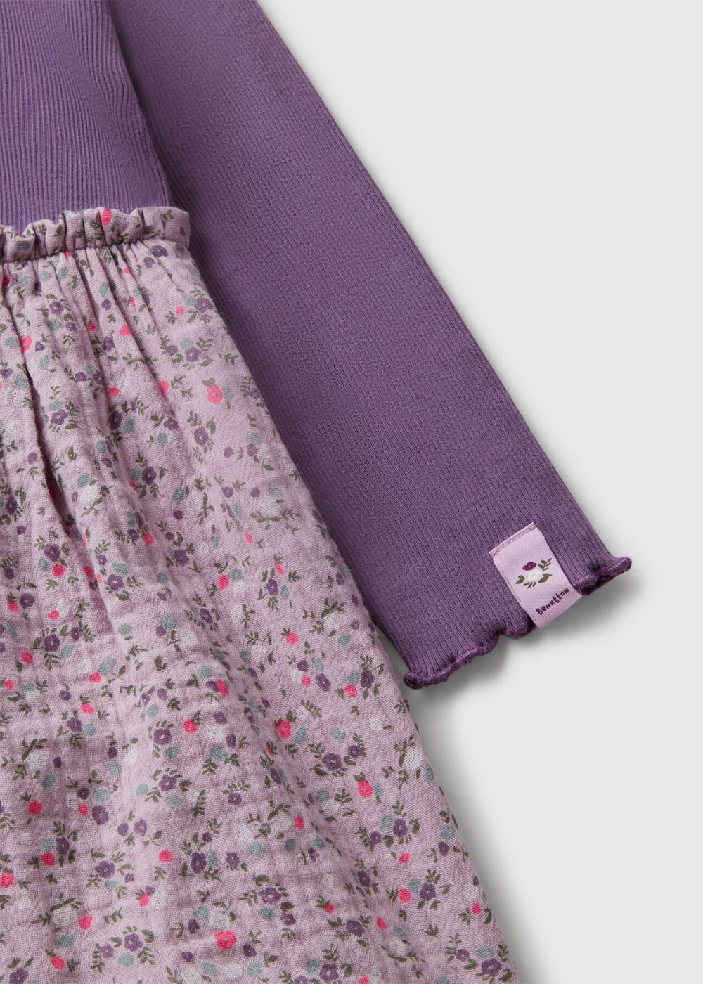 Long sleeve dress in pure cotton fabric. Ribbed solid colour crew neck top with wavy hem at the cuffs. Flared skirt with floral print along the entire garment. Trendy and feminine, can also be worn under a cardigan.