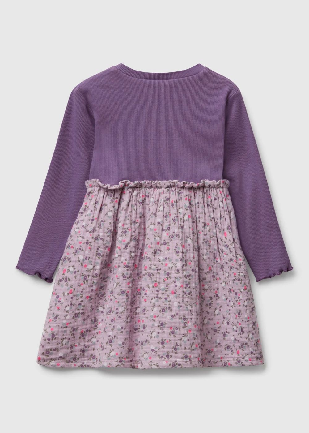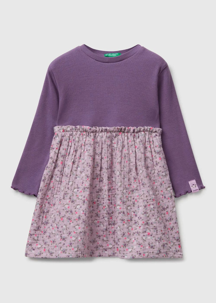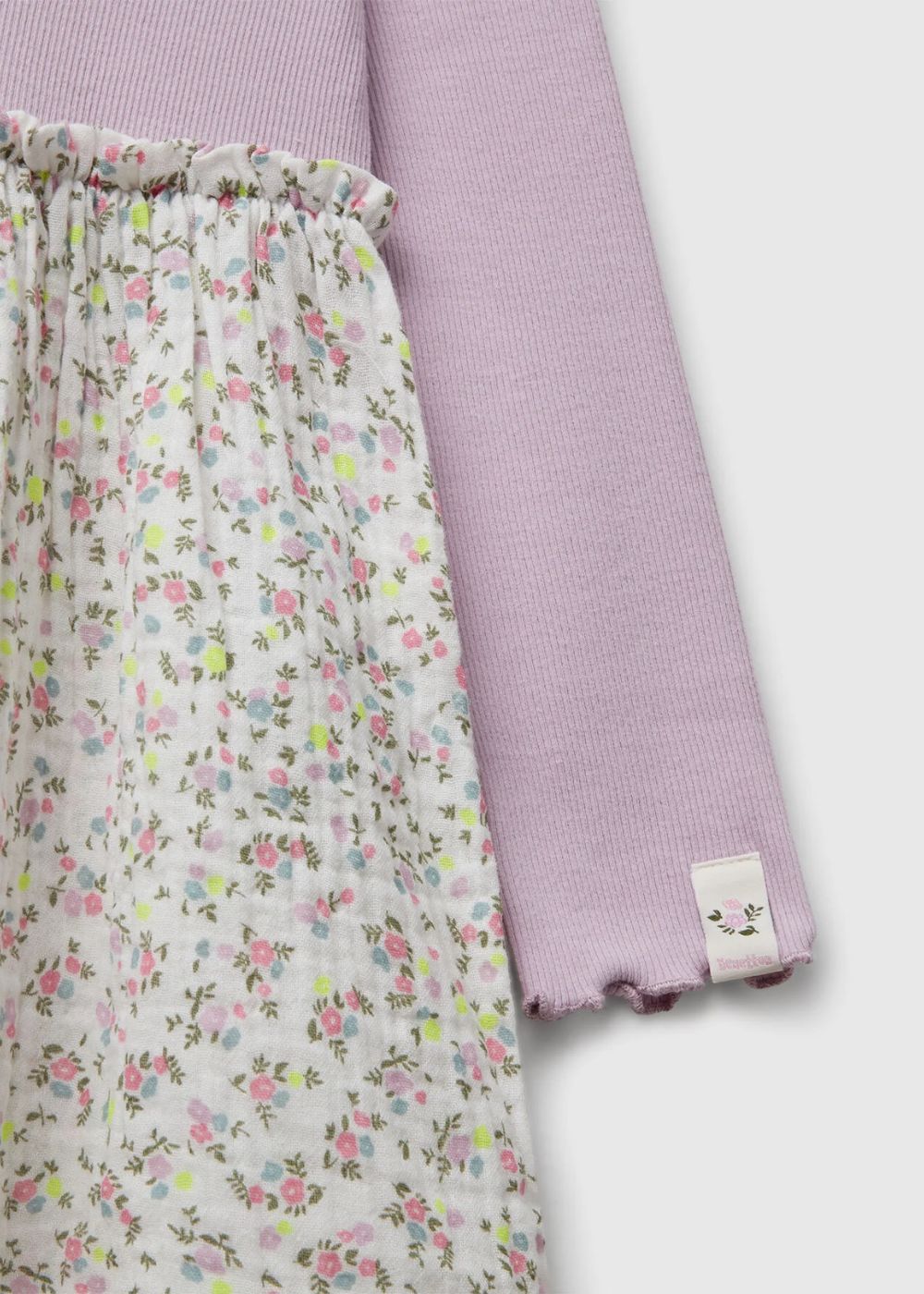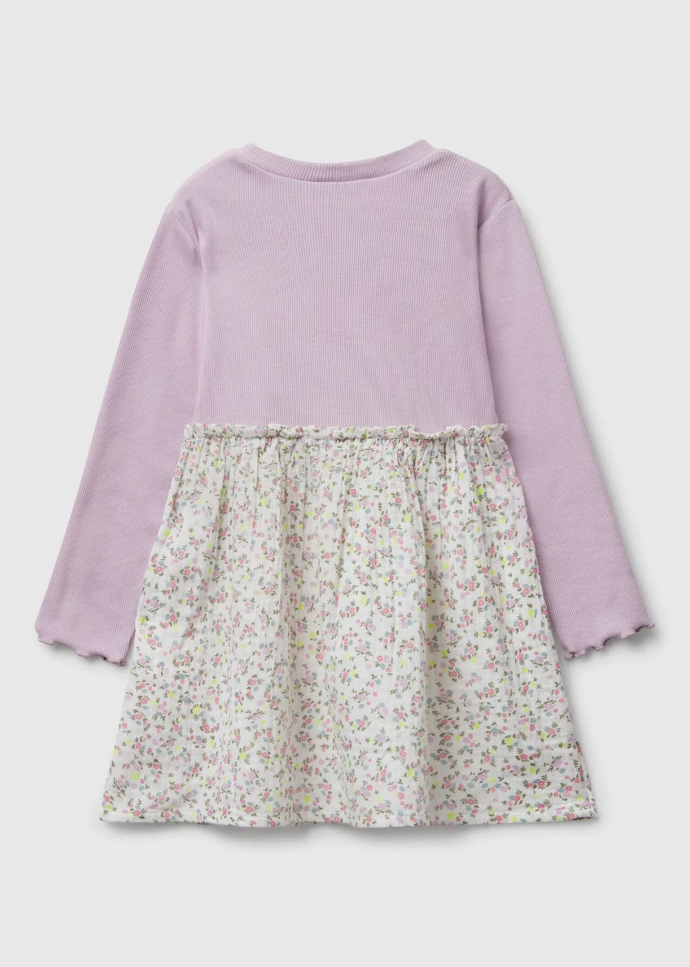 Long sleeve dress in pure cotton fabric. Ribbed solid colour crew neck top with wavy hem at the cuffs. Flared skirt with floral print along the entire garment. Trendy and feminine, can also be worn under a cardigan.