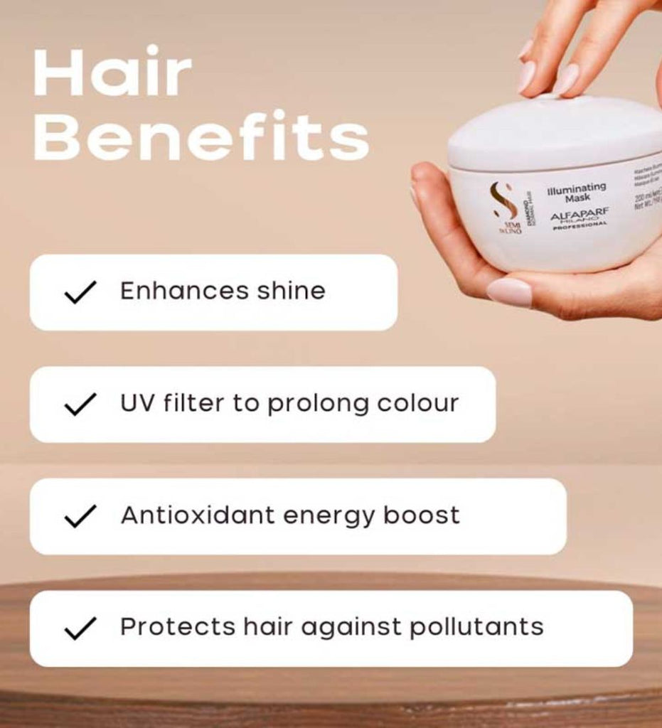 Alfaparf Semi Di Lino Diamond Illuminating Mask deeply nourishes and enhances shine, leaving hair soft and silky. Infused with Shine Fix Complex and Urban Defence Pro, it protects and restores radiance for healthy, vibrant hair.