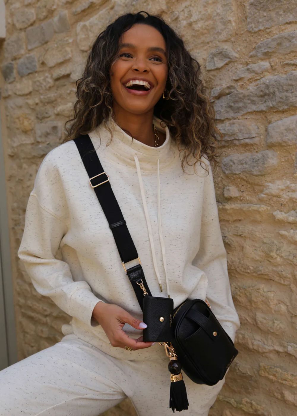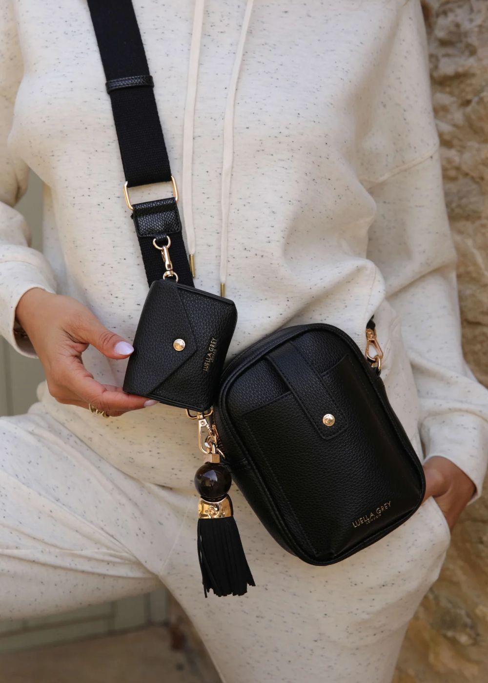 Elise is a portrait crossbody designed with style, versatility, and hands-free ease in mind. Back by popular demand, this compact camera bag silhouette is thoughtfully crafted with multiple compartments and pockets — perfect for keeping your essentials close during busy days or weekend adventures. Elise features our signature Thames Tassel charm and a handy front pocket sized for your phone. Her adjustable canvas strap is paired with clip-on charm Emmy, a miniature envelope purse ideal for storing keys, cards, or earbuds within easy reach.