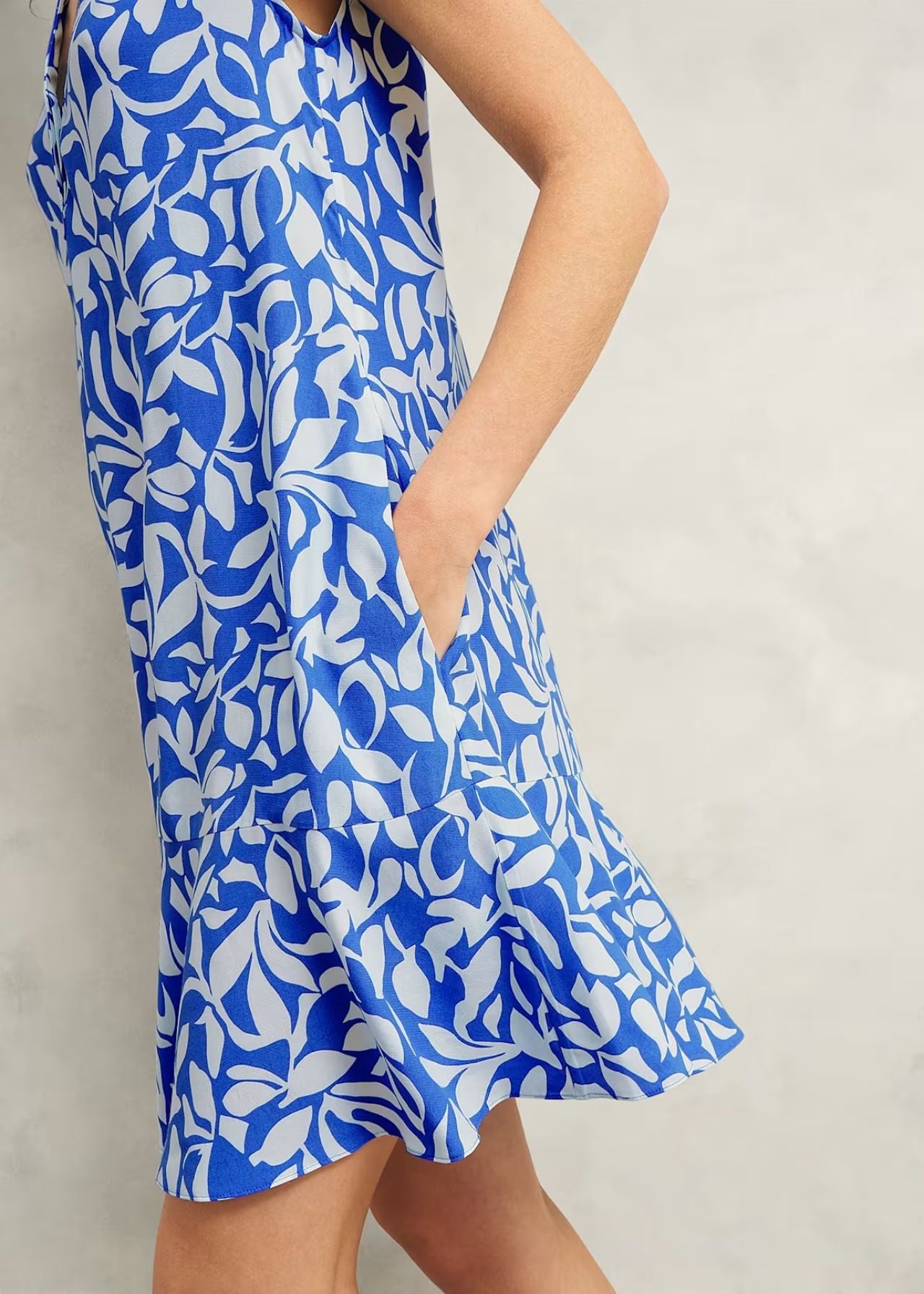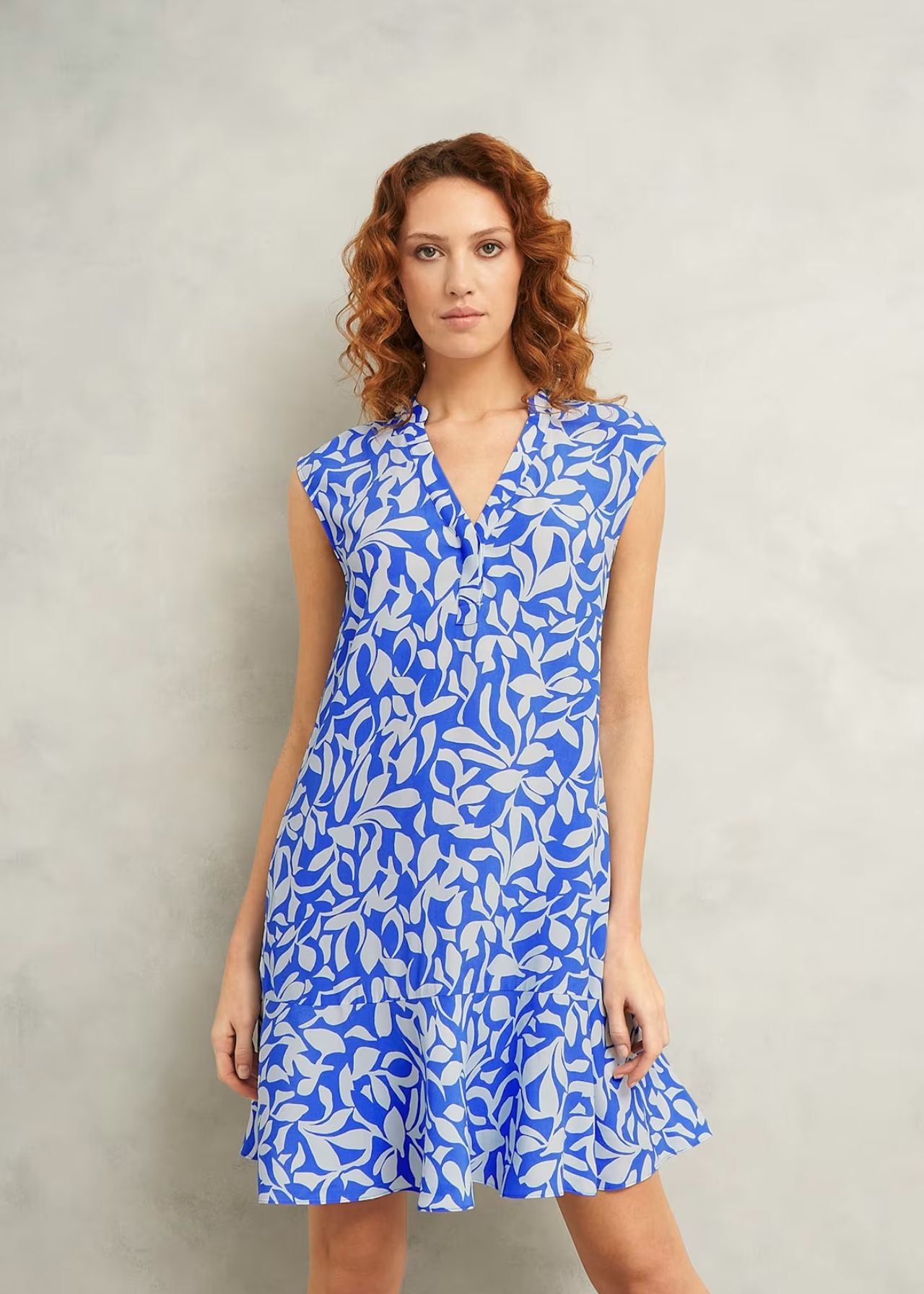 With a botanical print brought to life in an oceanic shade of blue, this summer mini dress serves myriad sundrenched solutions.