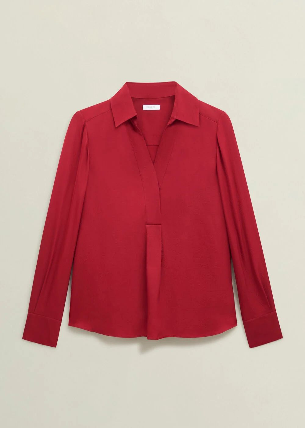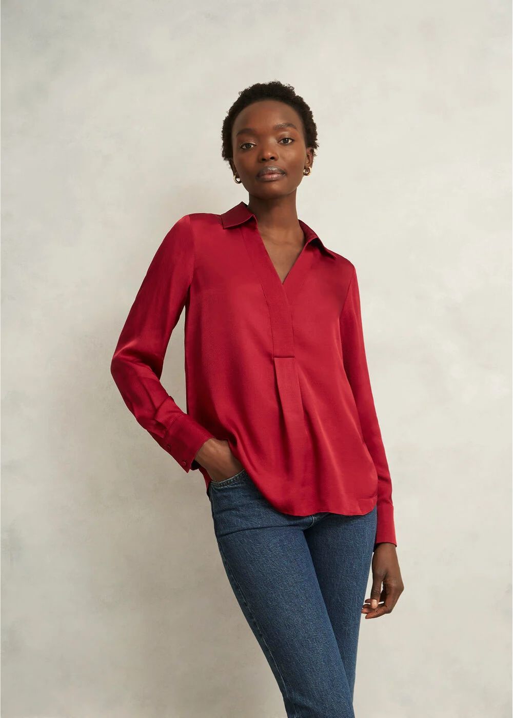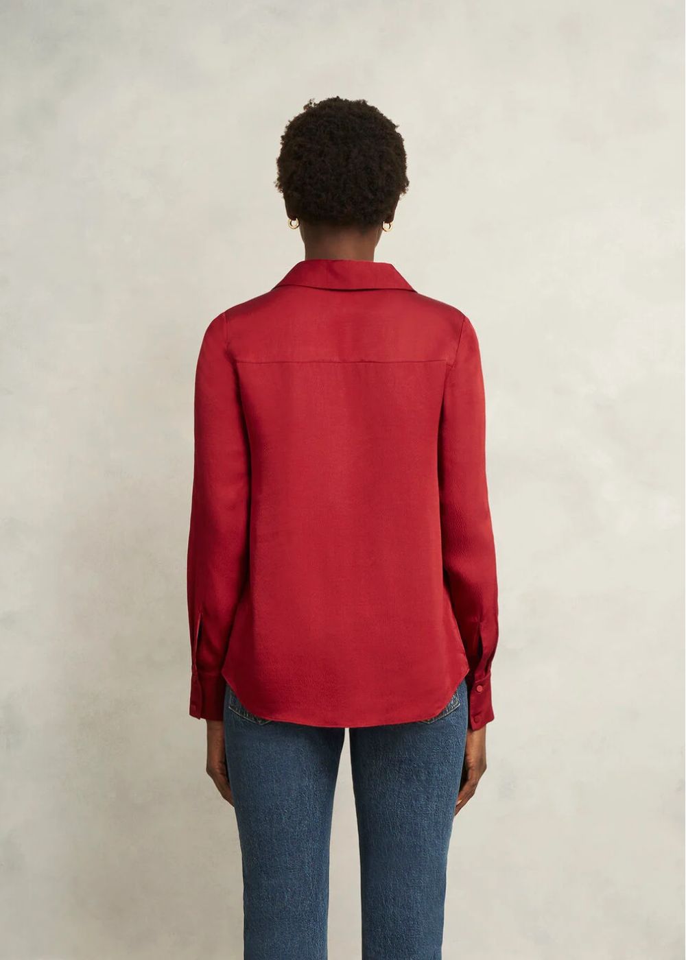Lending itself as the epitome of festive joy, the Marie blouse boasts a bold red hue over luxe, hammered satin. Dress up with a leather skirt or dress down with jeans.