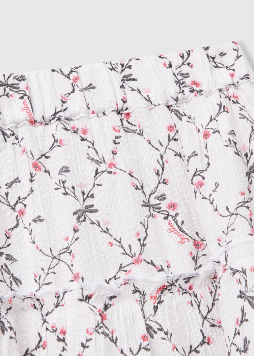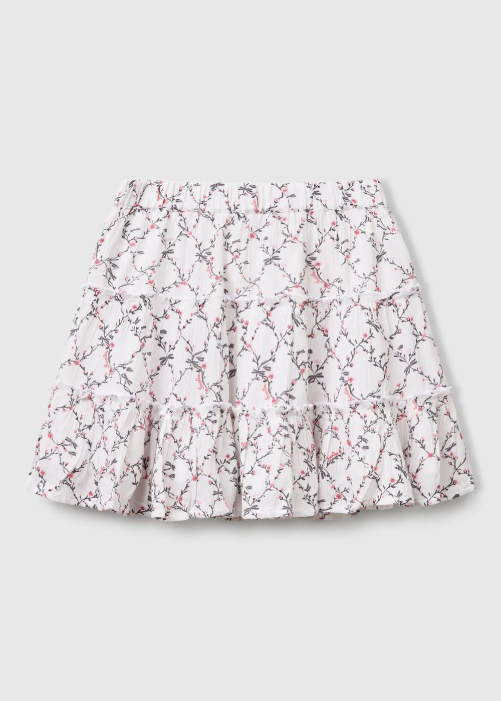 Short skirt with ruffle in pure viscose crepe fabric with rippled look. Floral print allover and inner elastic waist. Chic and feminine.