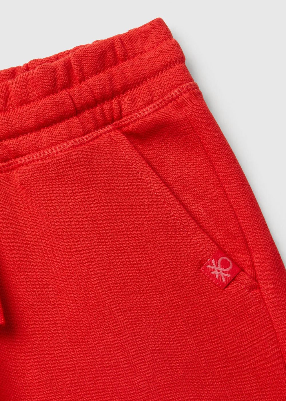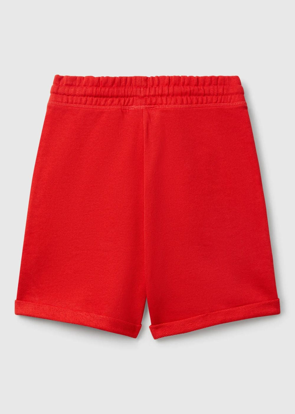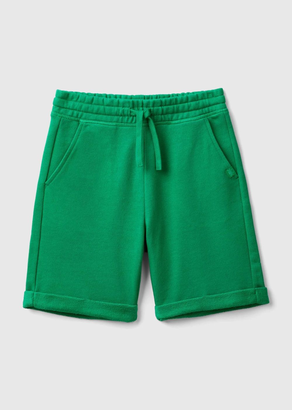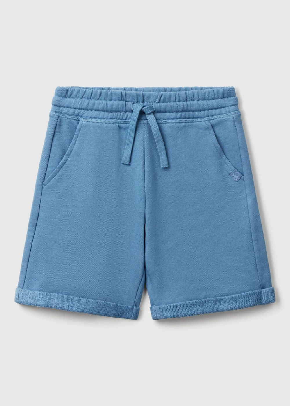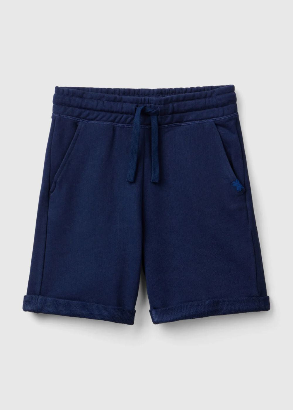 Spring-weight organic cotton fleece shorts. Waist with internal elastic and drawstring, front pockets and cuff fixed at the bottom of the leg. Sporty look and practicality. Article made with fabric containing at least 95% organic cotton.