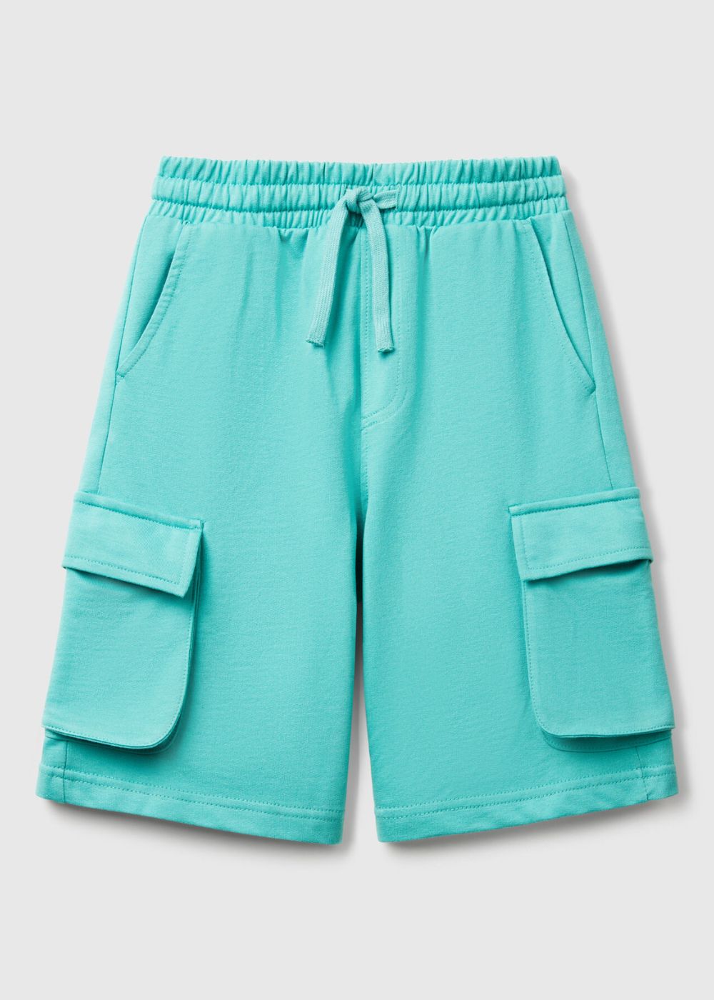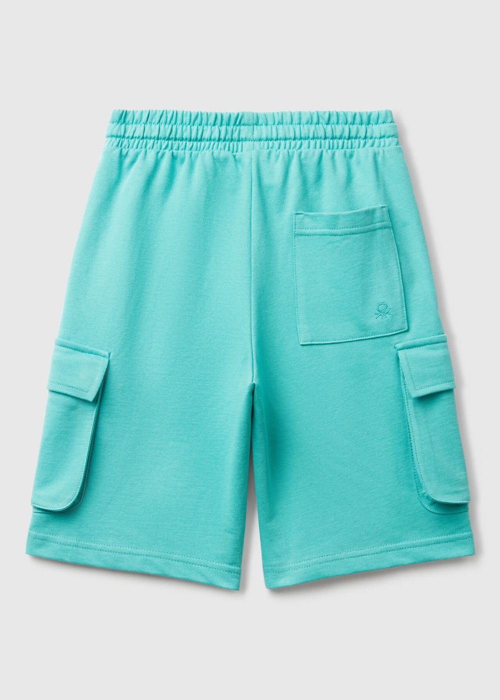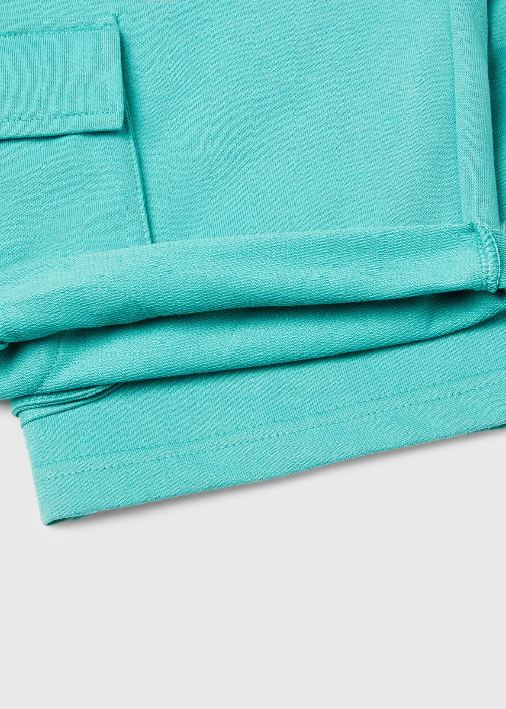 Cargo model bermudas in lightweight pure organic cotton sweat that hits above the knee. Stretch waist with drawstring, side pockets with flap, back pockets. This garment is made from 100% OCS certified organic cotton. CERTIFIED BY ICEA - ICEA - TX - 611. Products certified according to the Organic Content Standard (OCS) contain independently verified organic content at every stage of the supply chain, from the recycling to the finished product.