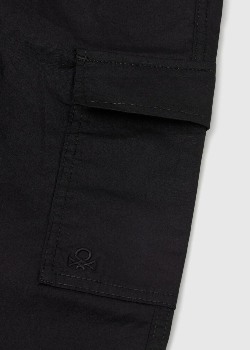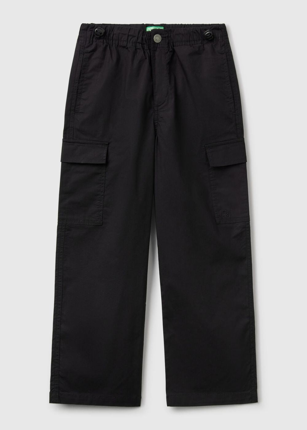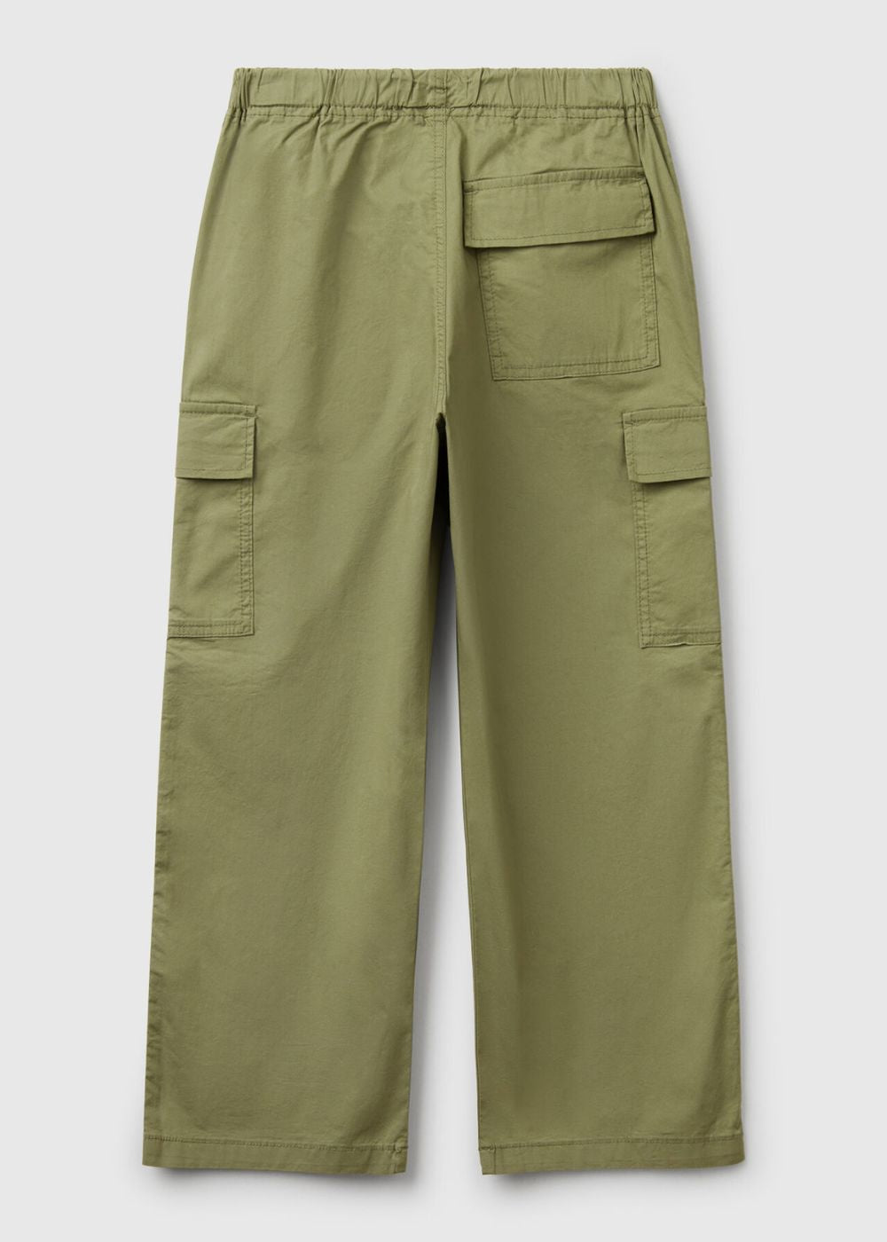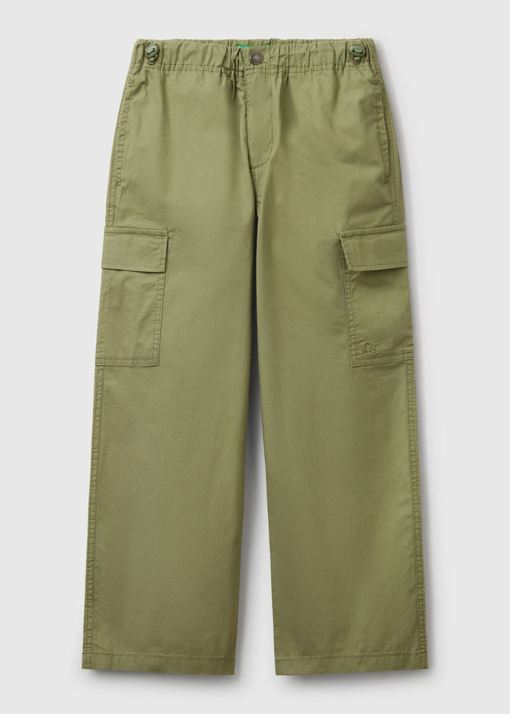 Long parachute-model trousers in lightweight stretch cotton canvas. Waist with elastic drawstring and side cord stoppers, zip and button opening. Pockets tucked away on the front, back pockets and side pockets. For a modern and decisive look.