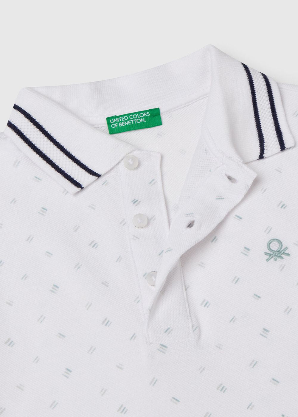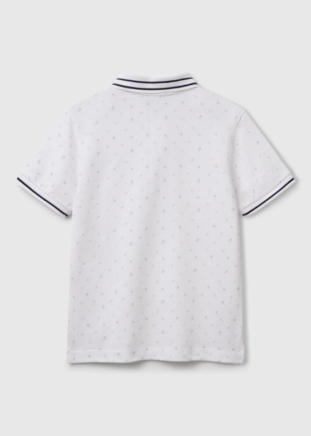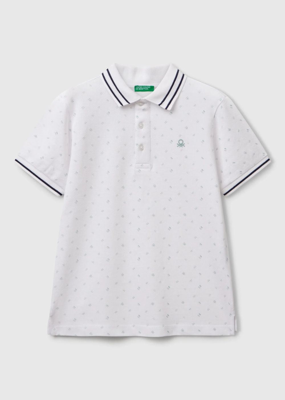 Short-sleeved polo shirt in pure cotton pique. Classic collar with striped edge, partial button opening on the front. Logo embroidered on the heart, side slits and micro-patterned print all over the garment. Also ideal as an under jacket for more elegant looks.