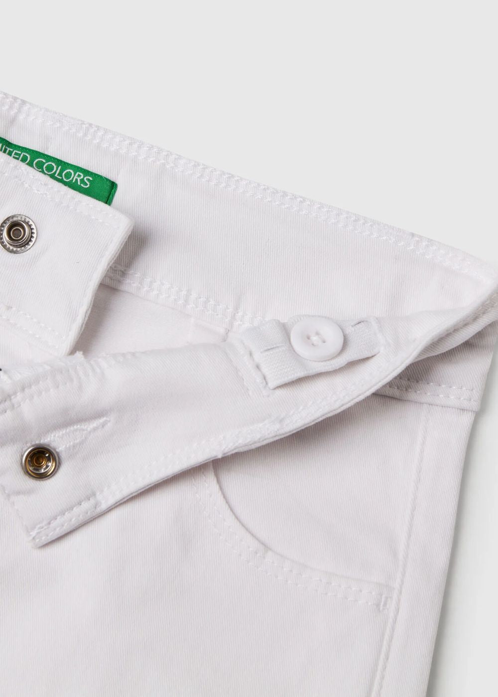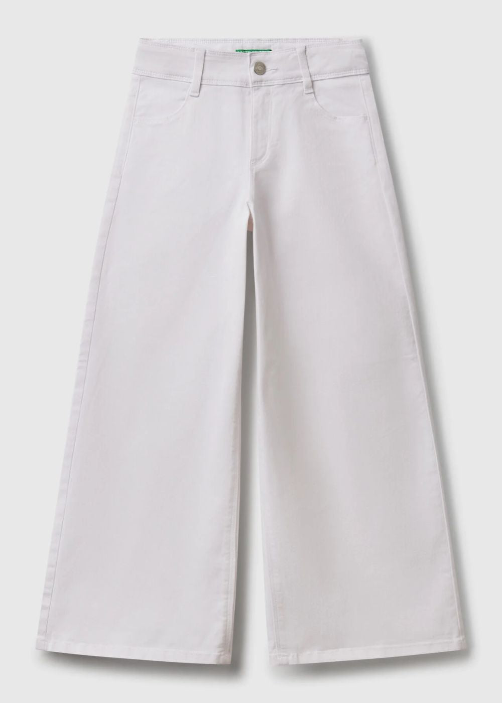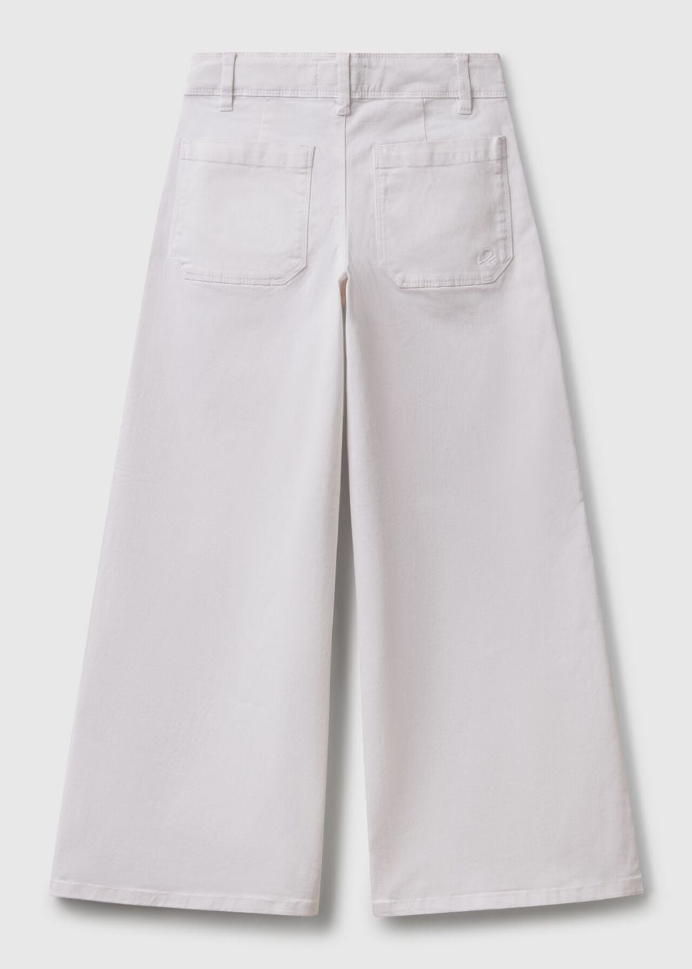 Long trousers in stretch cotton. Slim waist and wide leg. Practical zip and button opening, adjustable inner elastic waist. Front pockets and patch pockets on the back. Perfect with a t-shirt.