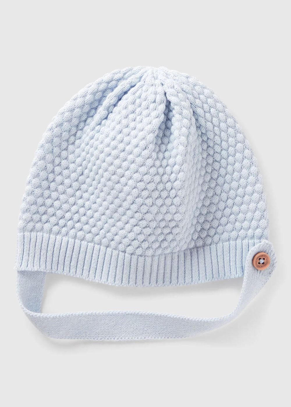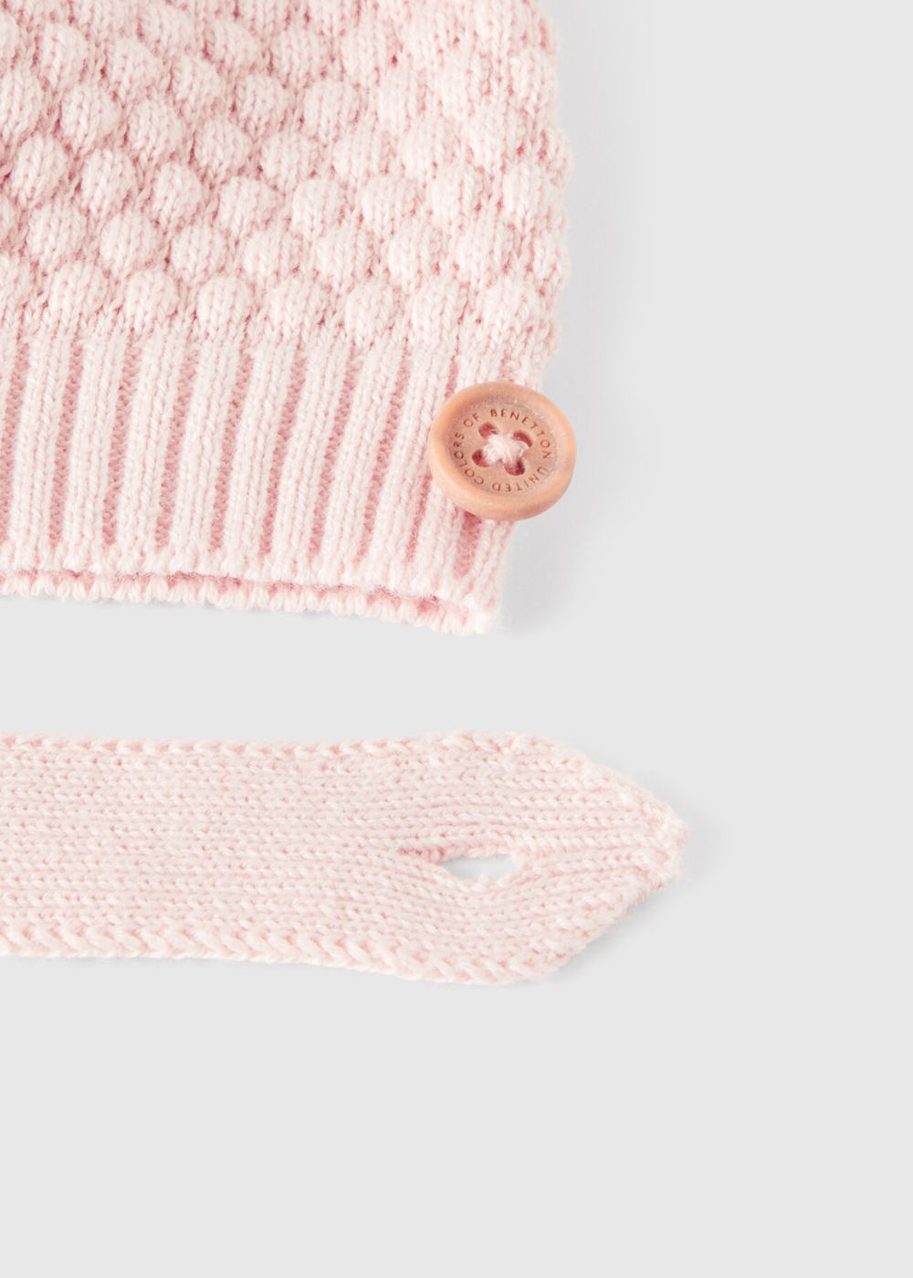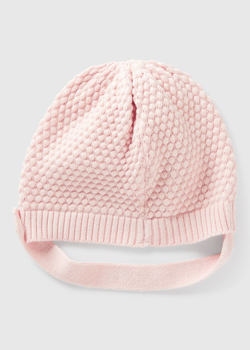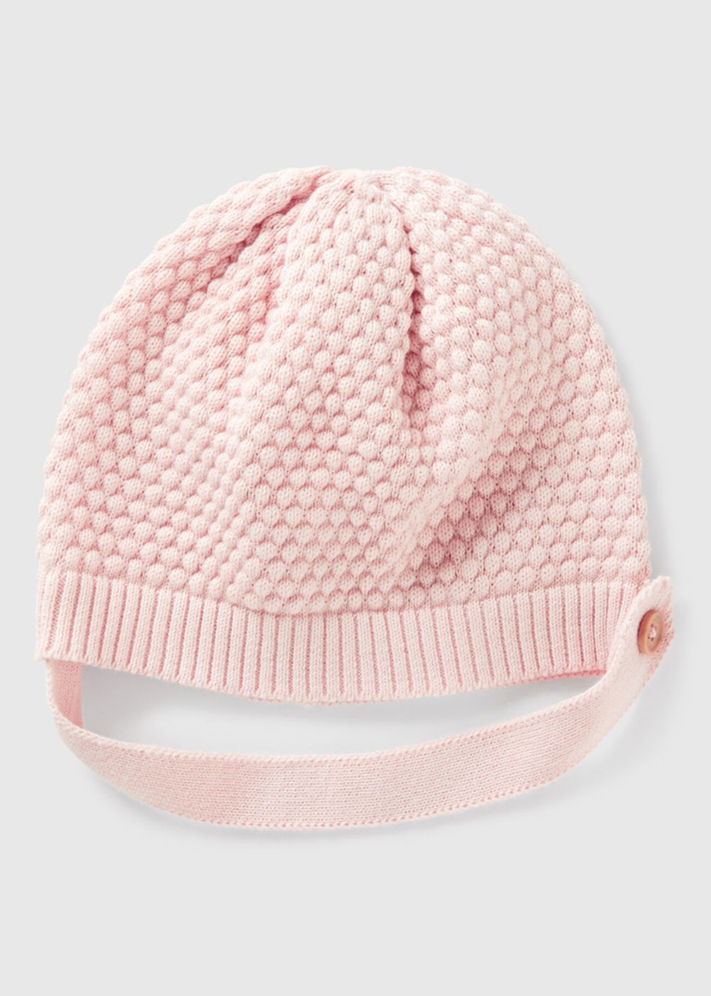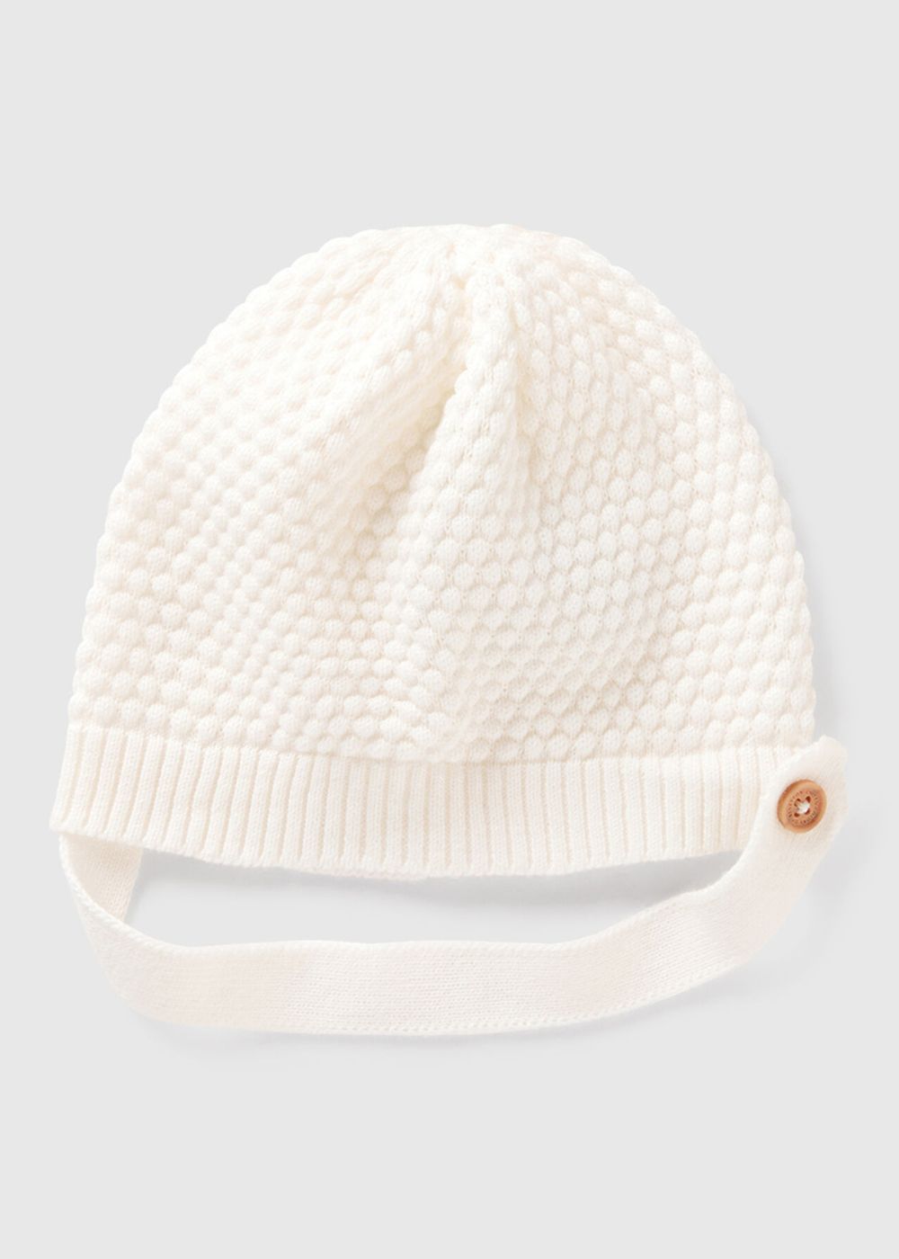 Beanie in soft pure cotton fabric. Special knit with stich features. Lace for under the neck with button closure. An "Easy Care" piece that can be machine-washed.