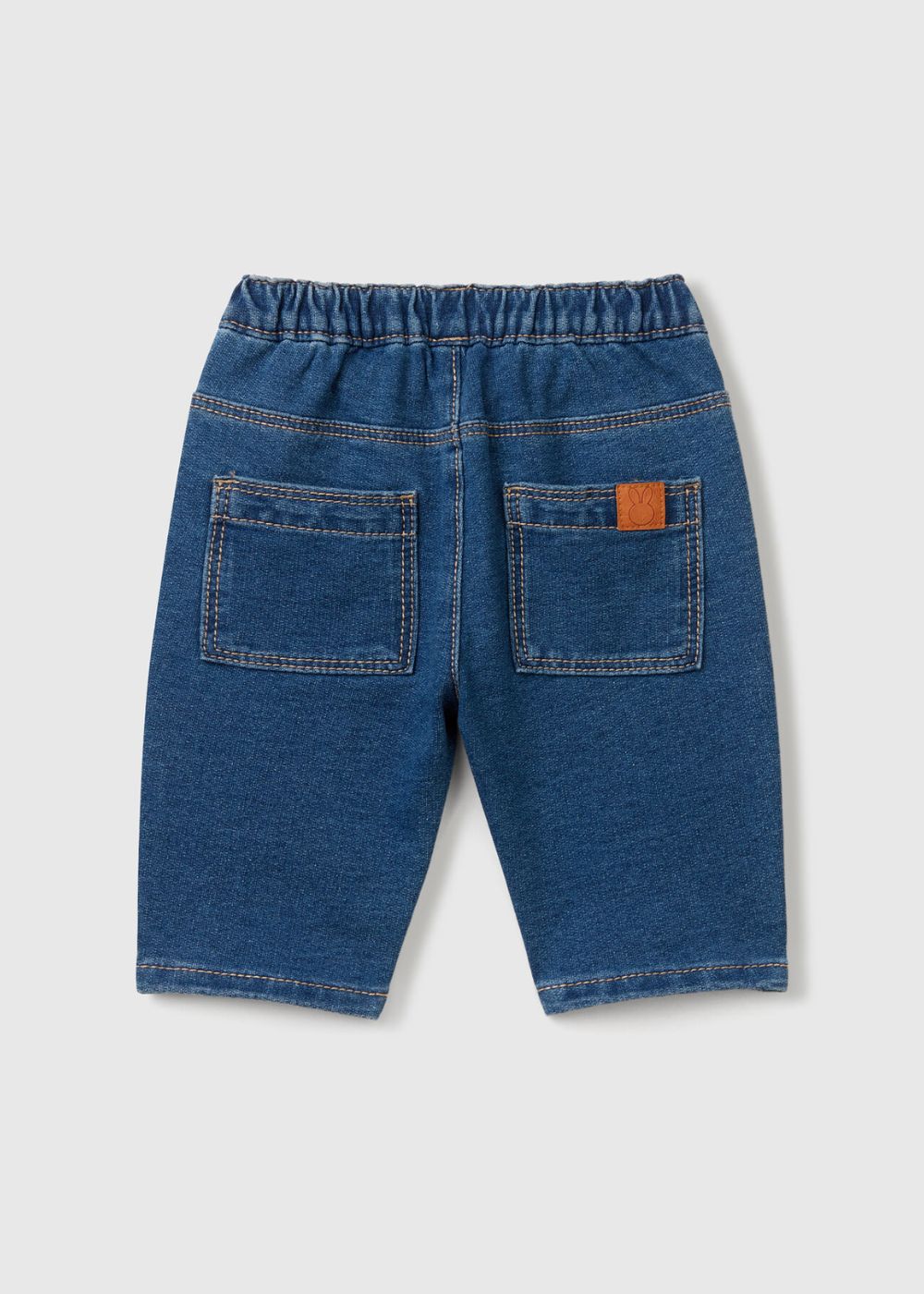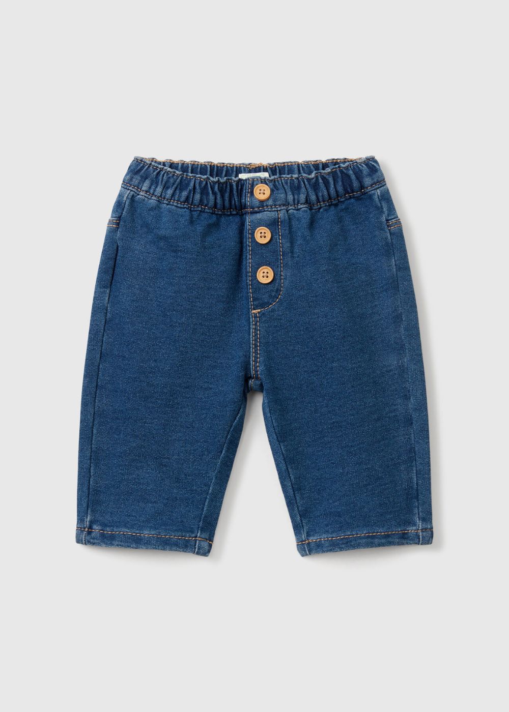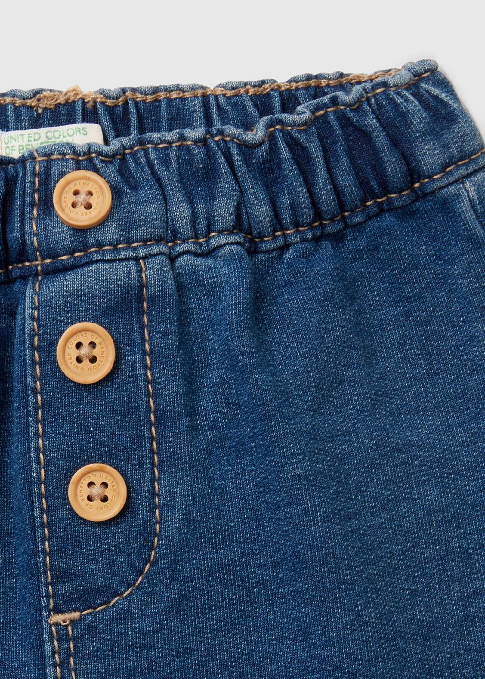 Trousers in stretch sweat cotton blend with worn denim look. Elastic waist, mock flap with decorative wood-effect buttons and patch pockets on the back. Comfy and trendy.