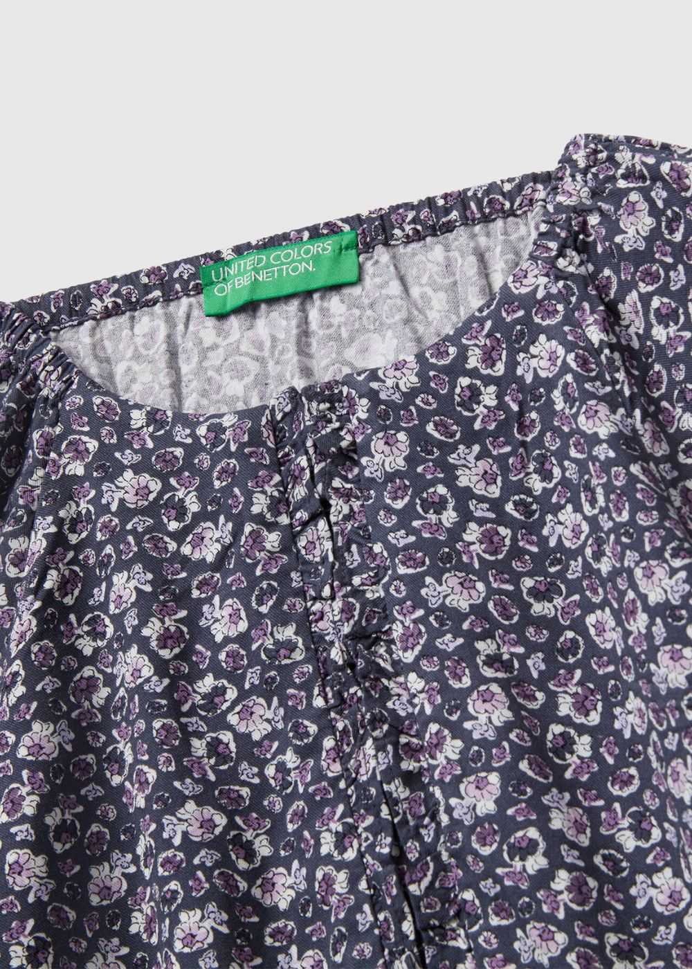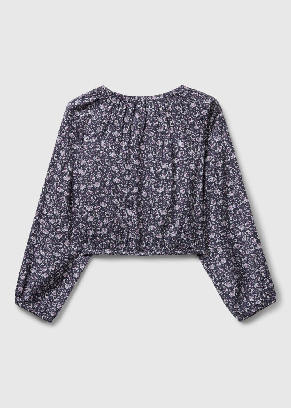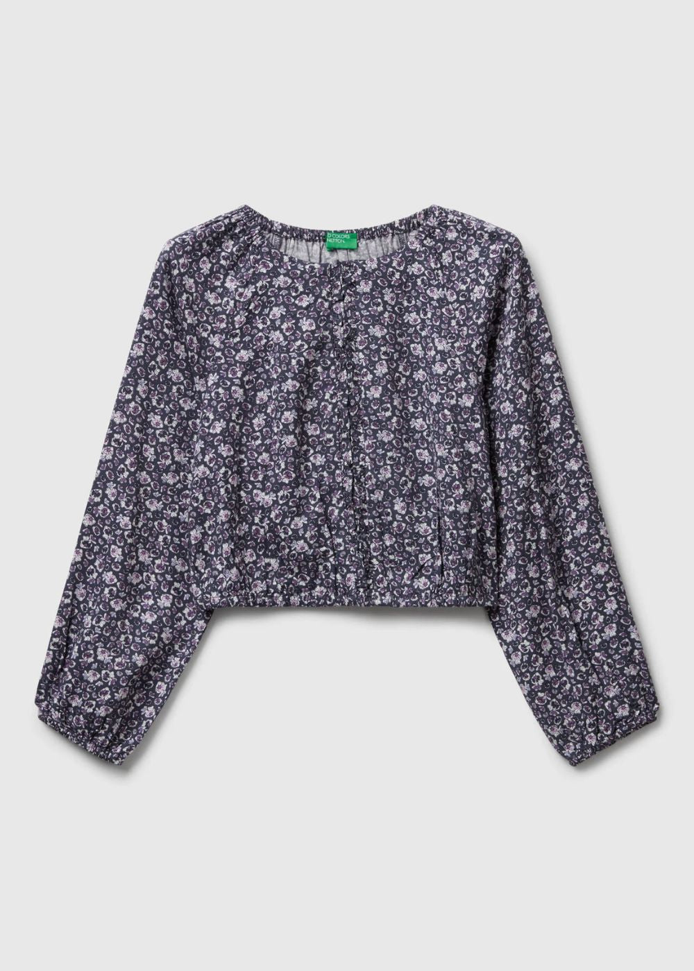 Soft round neck blouse in pure viscose. Long raglan sleeves and practical inner elastic at bottom and cuffs. Floral print all over, for romantic and feminine outfits.