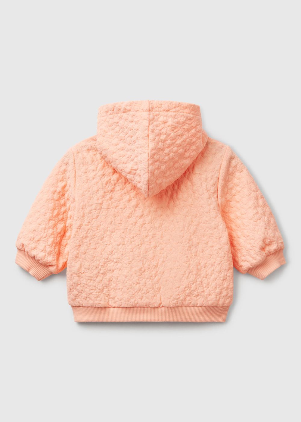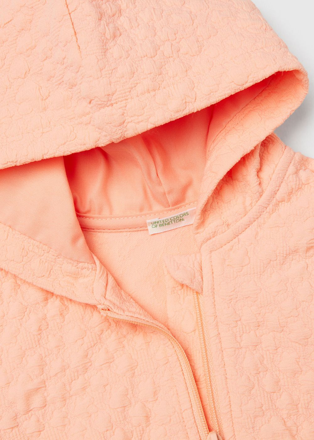 Long-sleeved sweatshirt in soft jacquard fabric with star motif. Jersey-lined hood, hidden opening with zip and safety zip guard. Practical and comfortable, perfect for mid-season.