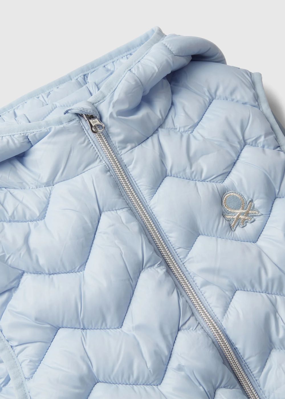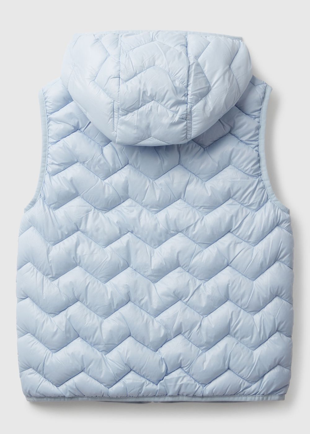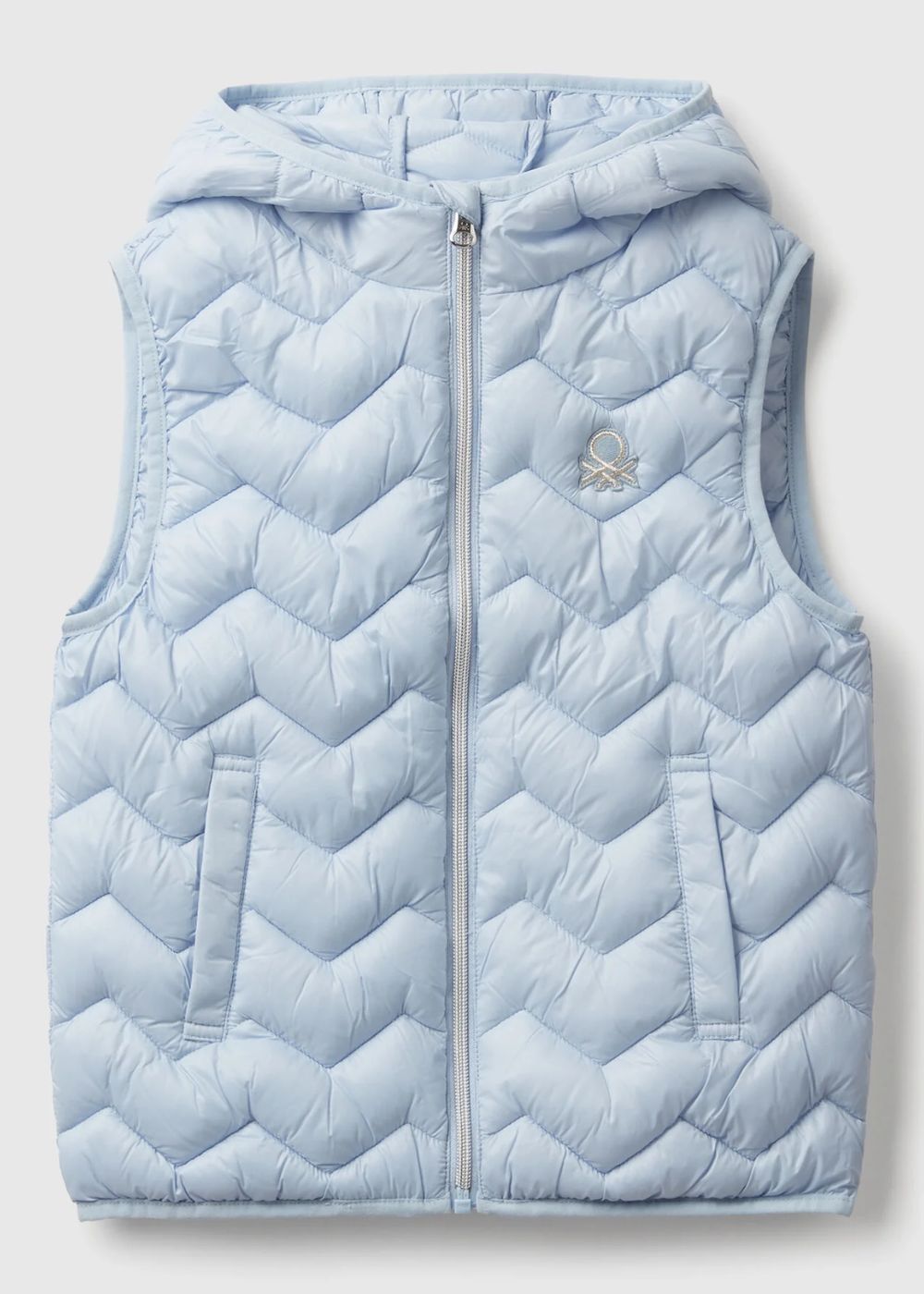 Sleeveless padded jacket in "Rain Defender" nylon with zigzag quilting with a regular fit. Warm yet ultra lightweight, with "Duck Free" padding. Equipped with hood, zip opening up the chin, pockets on the front, logo patch at left breast. An "Easy Care" piece that can be machine-washed and dried, following the instructions listed on the label.