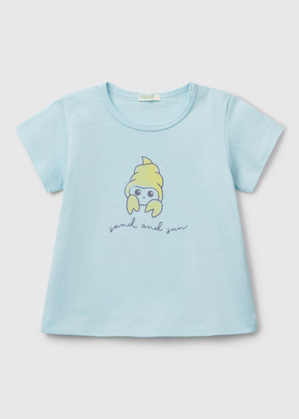 Crew neck short sleeve t-shirt in pure organic cotton. Practical opening with hidden snap buttons on the left shoulders and fun front print. Item made with fabric containing at least 95% organic cotton.