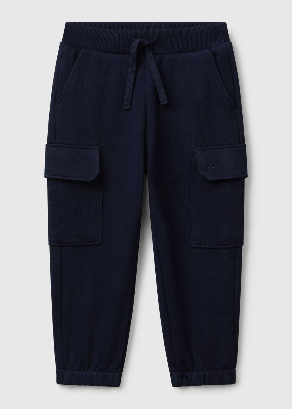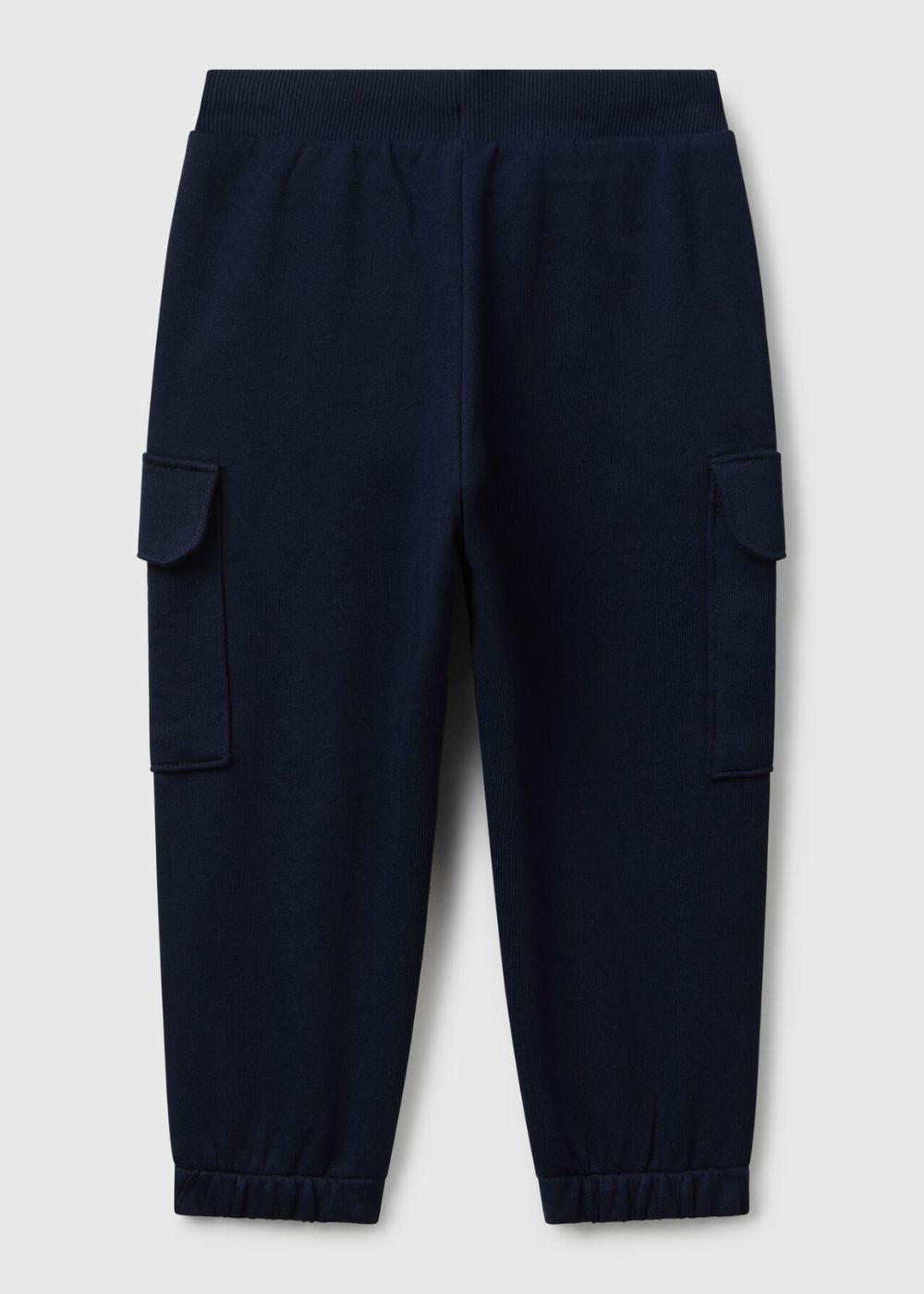 Long trousers in pure cotton sweat with consistent yet light feel. Stretch waist with drawstring, front pockets and side flap pockets. Cool and sporty attitude.